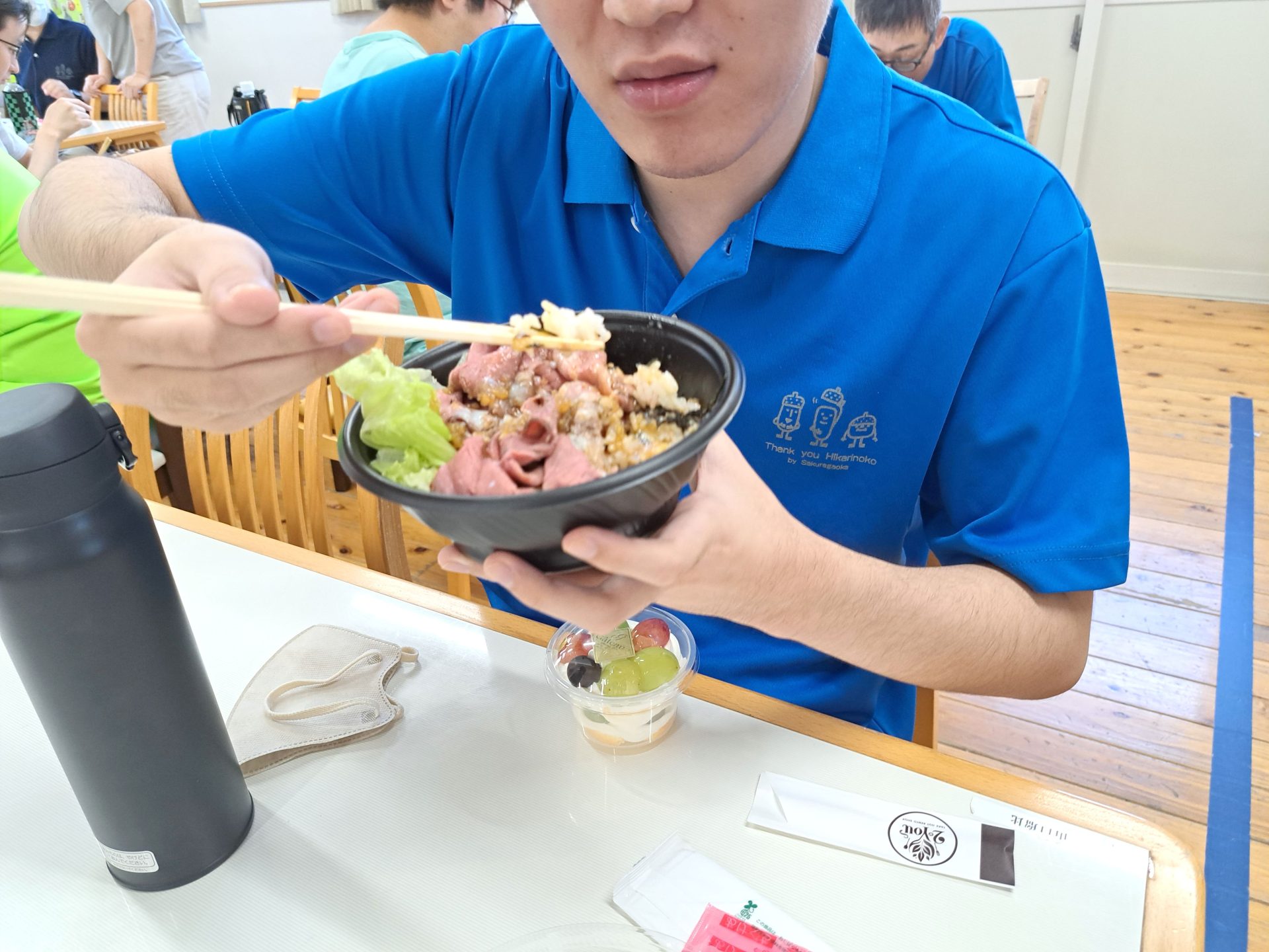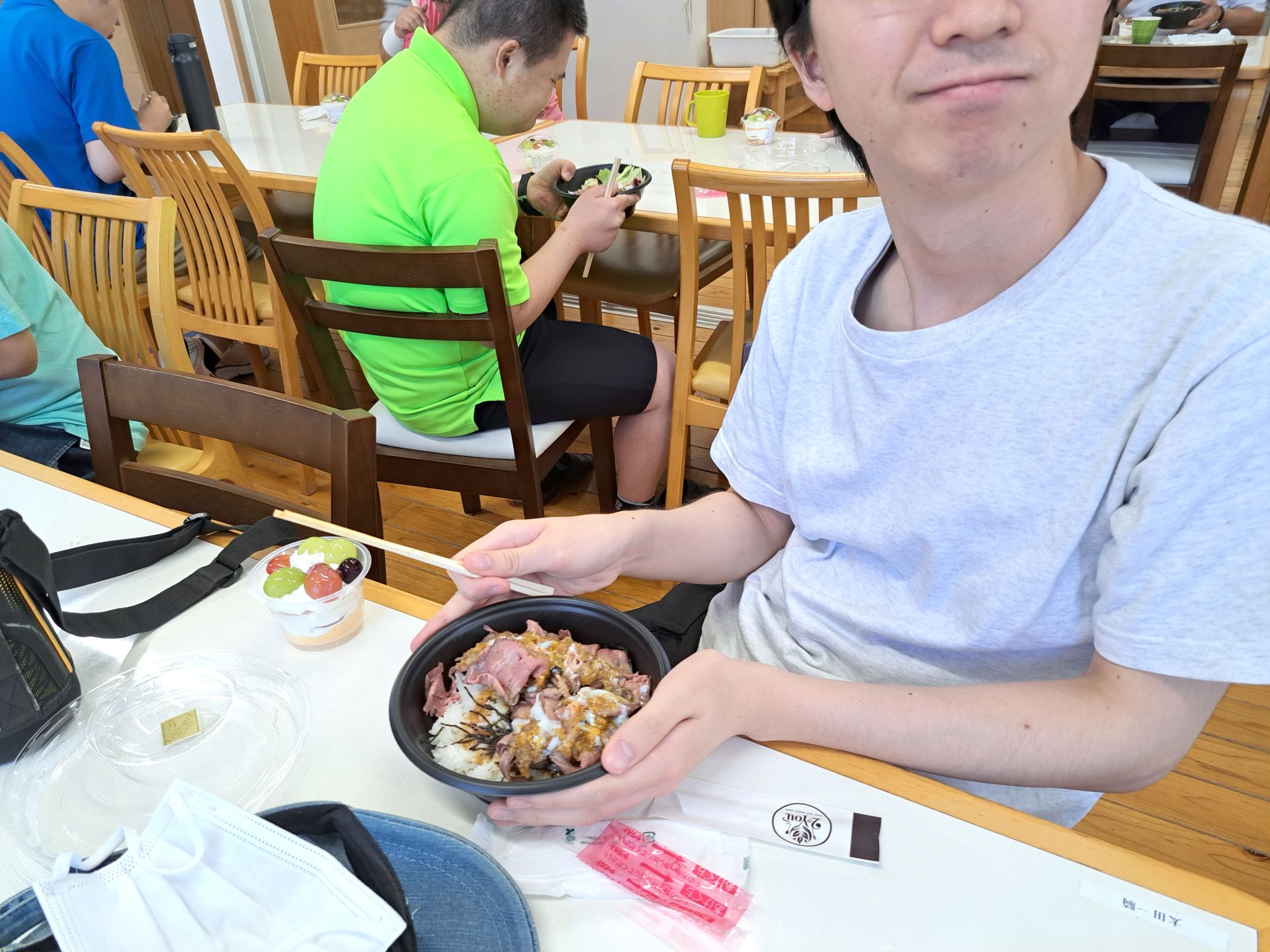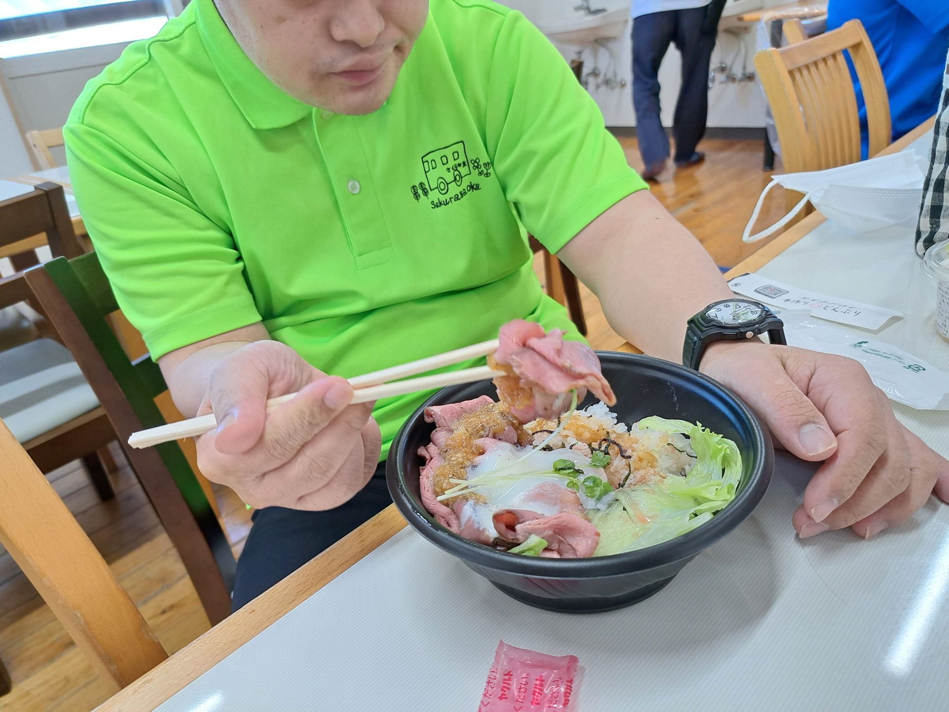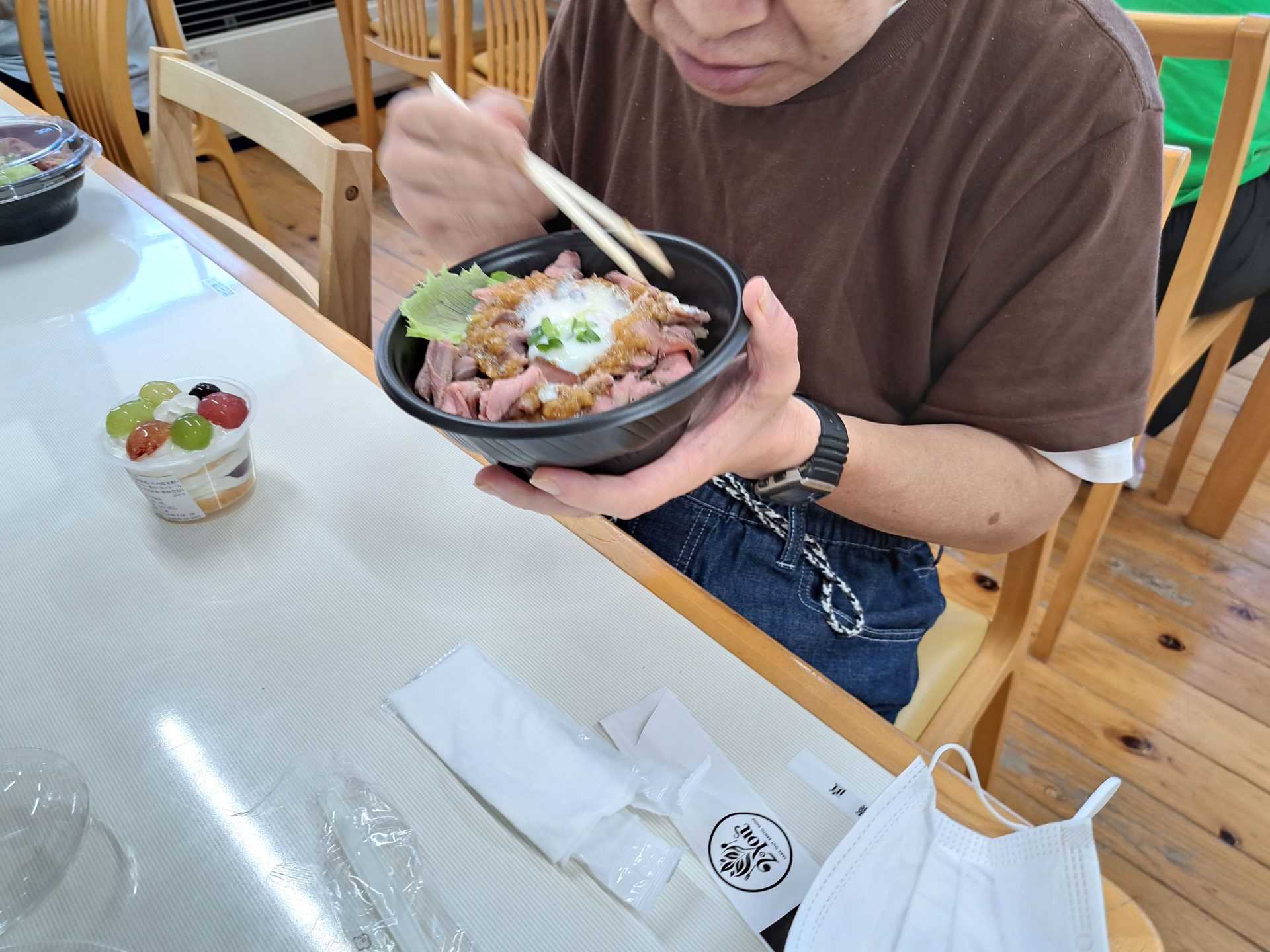 今日のお昼は「2You」さんのローストビーフ丼と、「みるくぱん」さんのスイーツです♪(*^-^*)