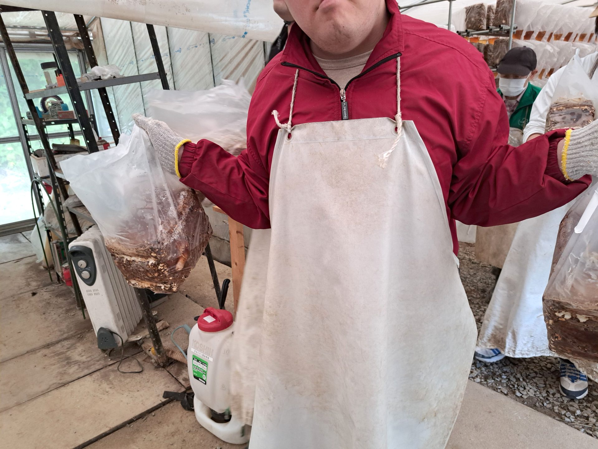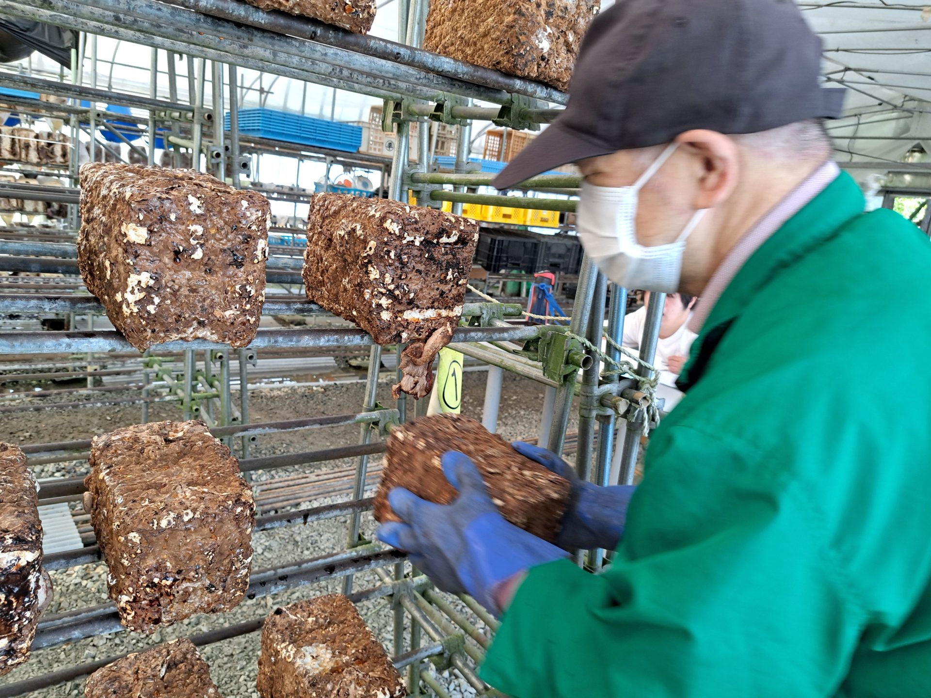 さあ、次は移動した菌床の袋を開ける作業!こちらはさくらが丘歴35年のベテランさんが担当します!