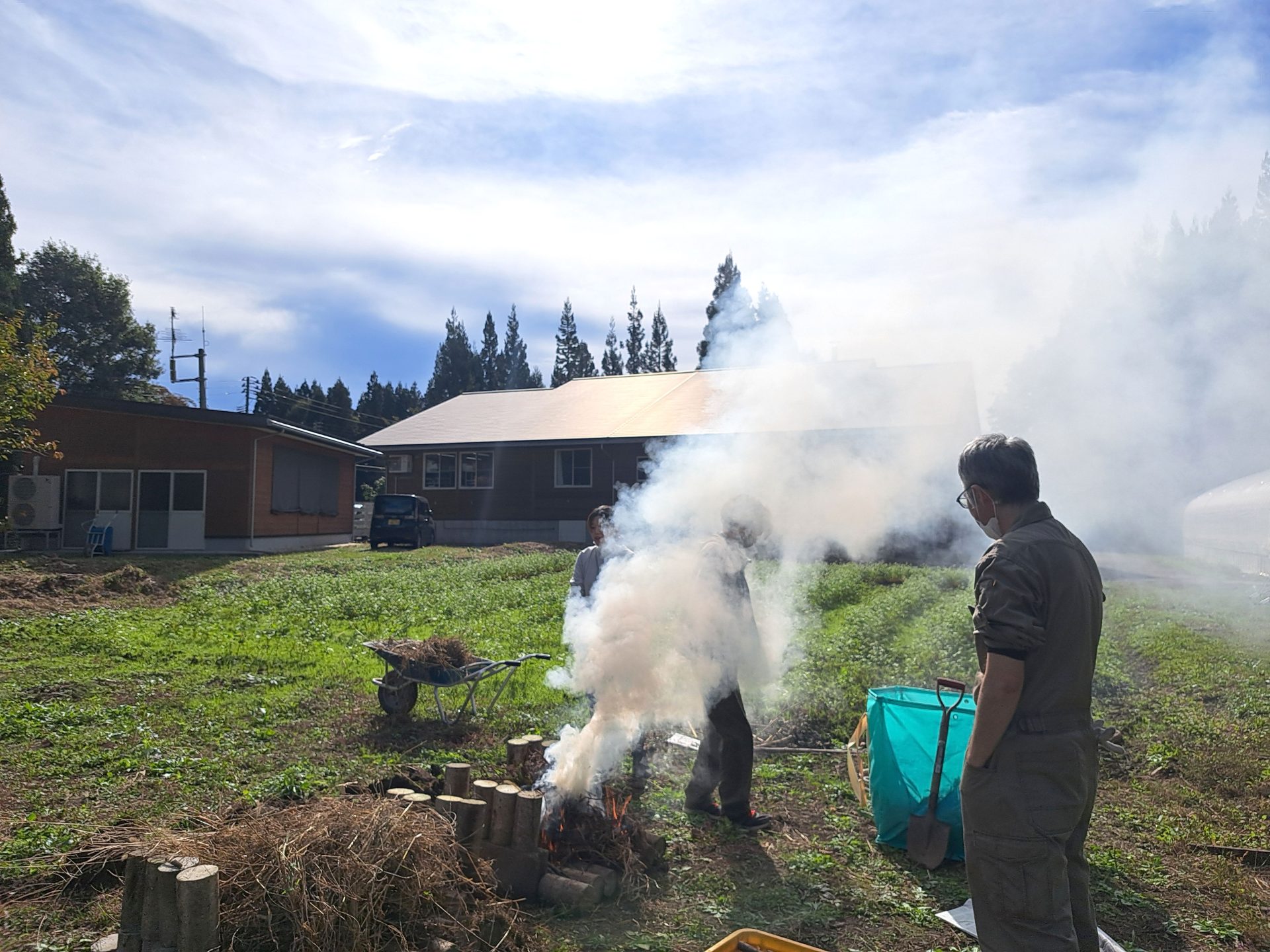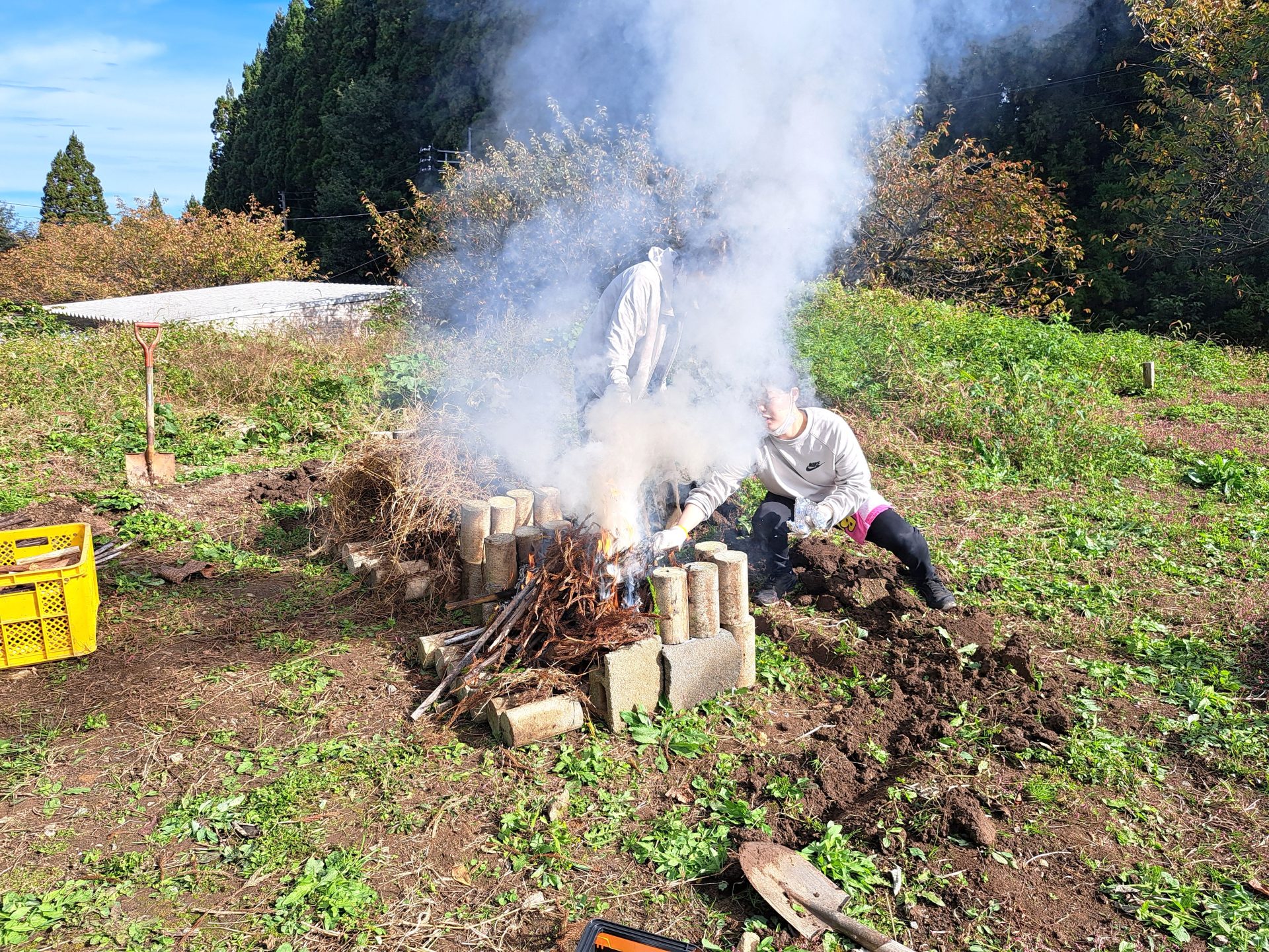 火がついた~煙すごい~!ちなみに周囲には火が燃え広がらないように溝を掘りました~