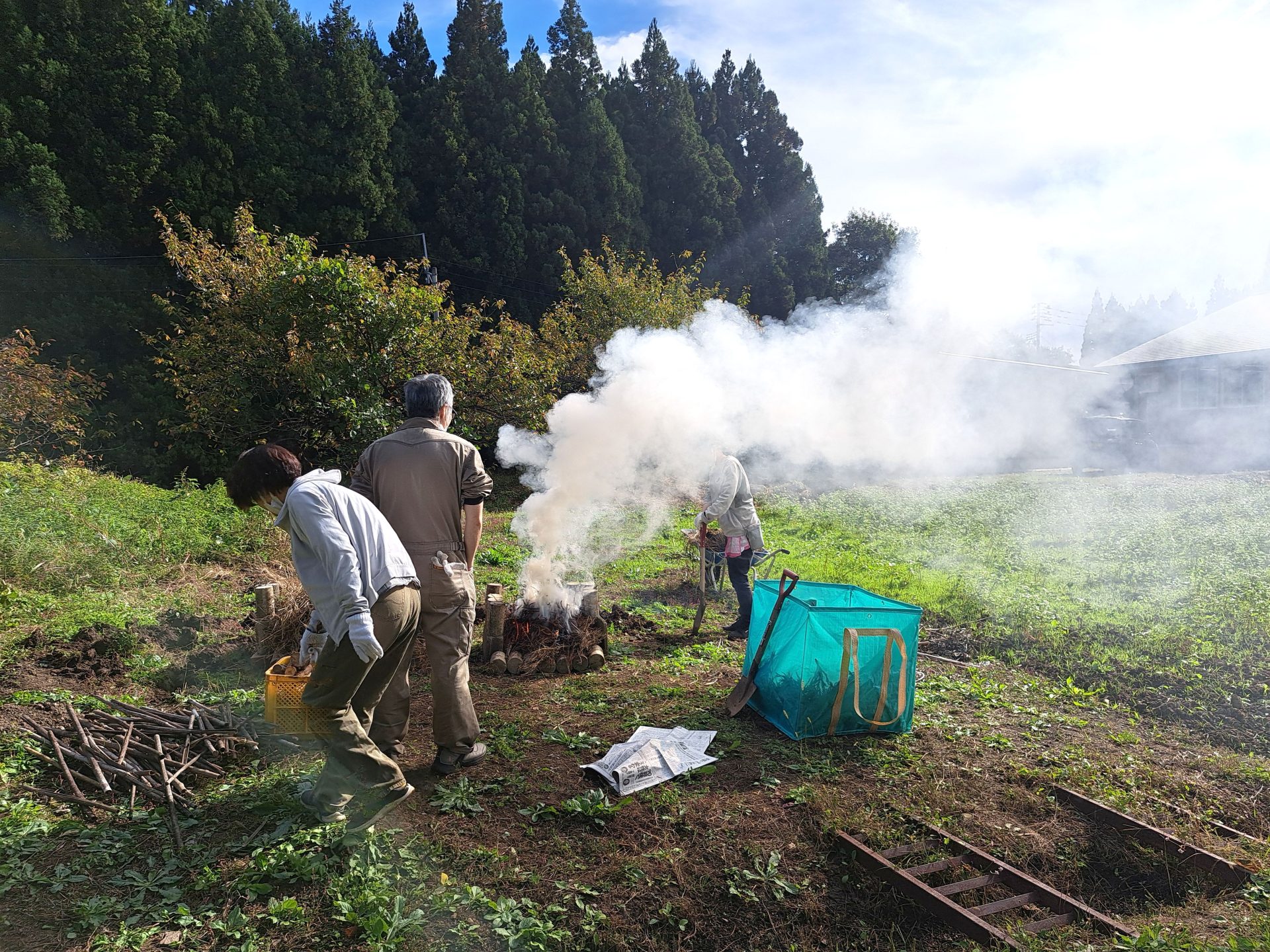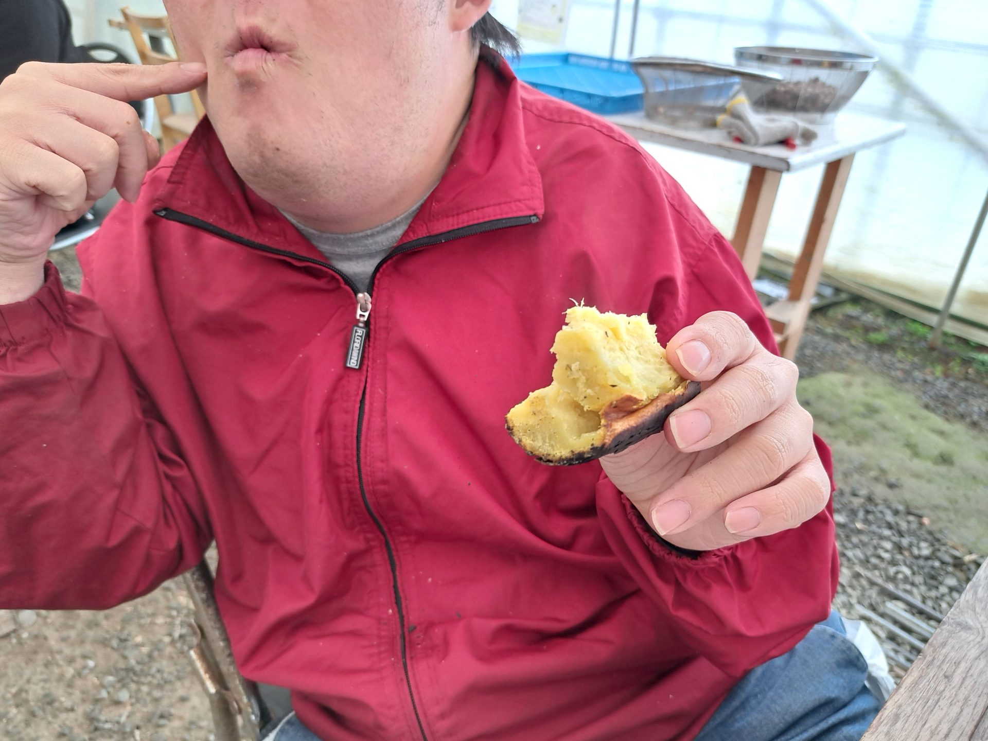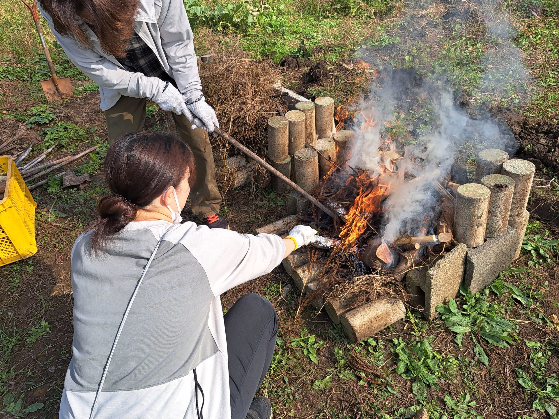 サツマイモを育てて収穫した新人職員さん、まさか焼き芋までしようとは!後ろ姿がたくましい!!