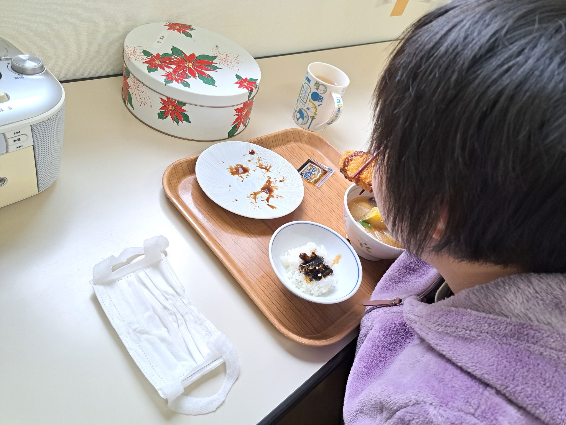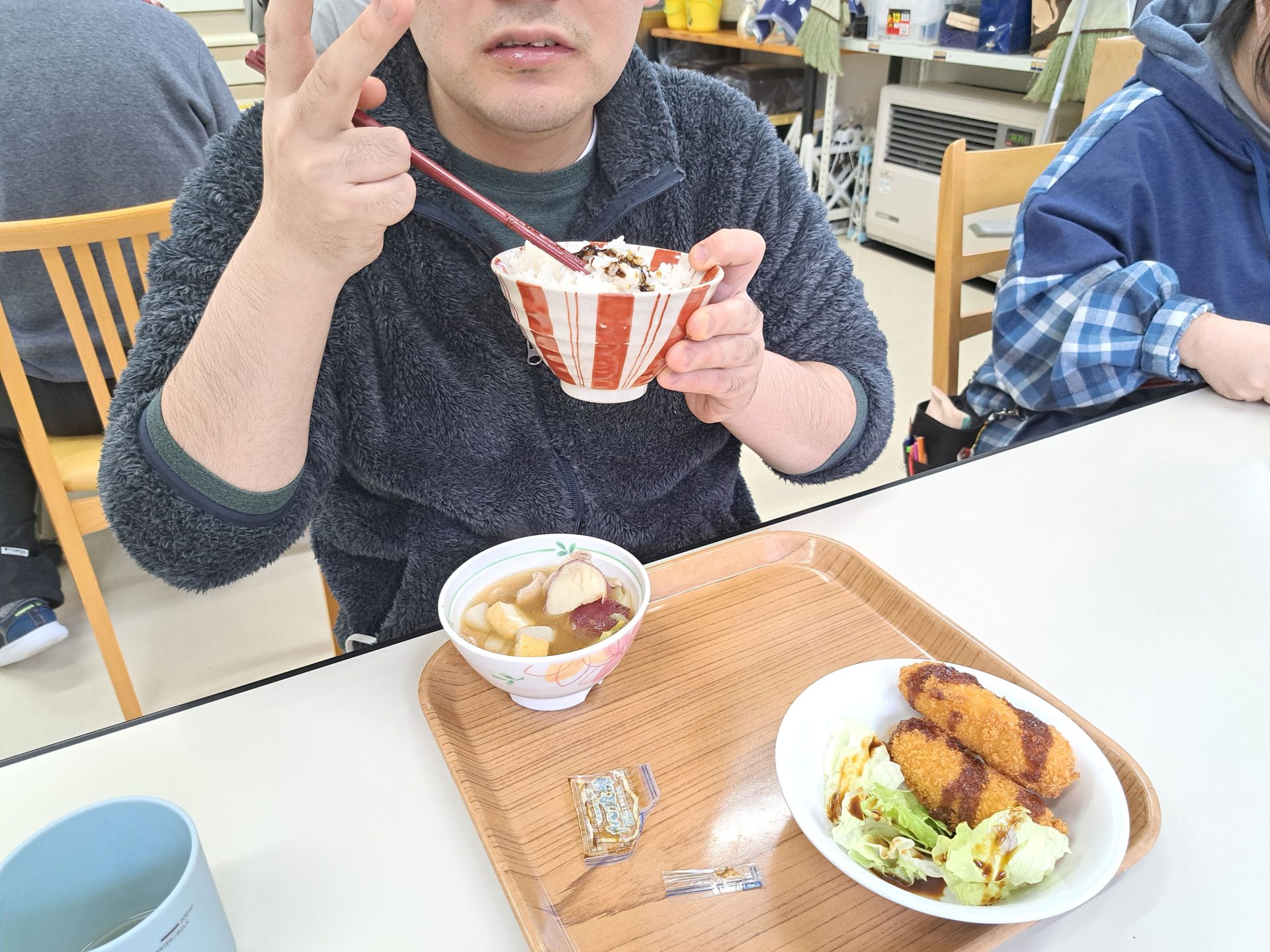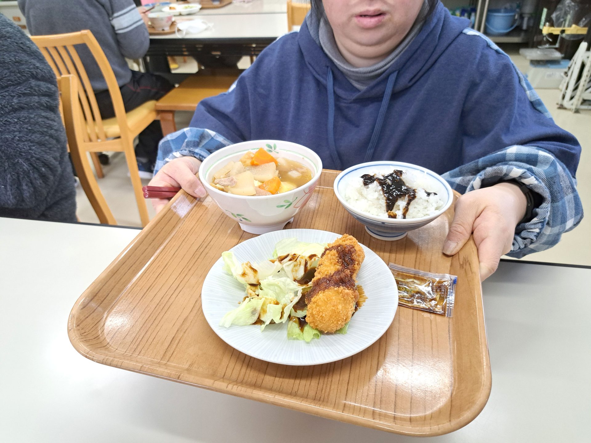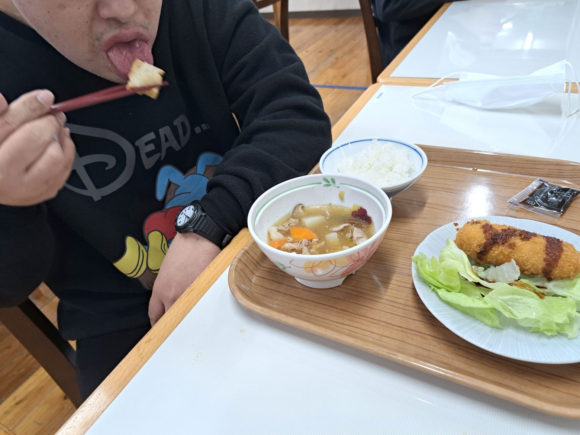 「え~今日のメニューは~ご飯(佃煮のり)、クリームコロッケ、レタス、さつま汁~以上!!!」日課のメニュー読み上げタイム…
