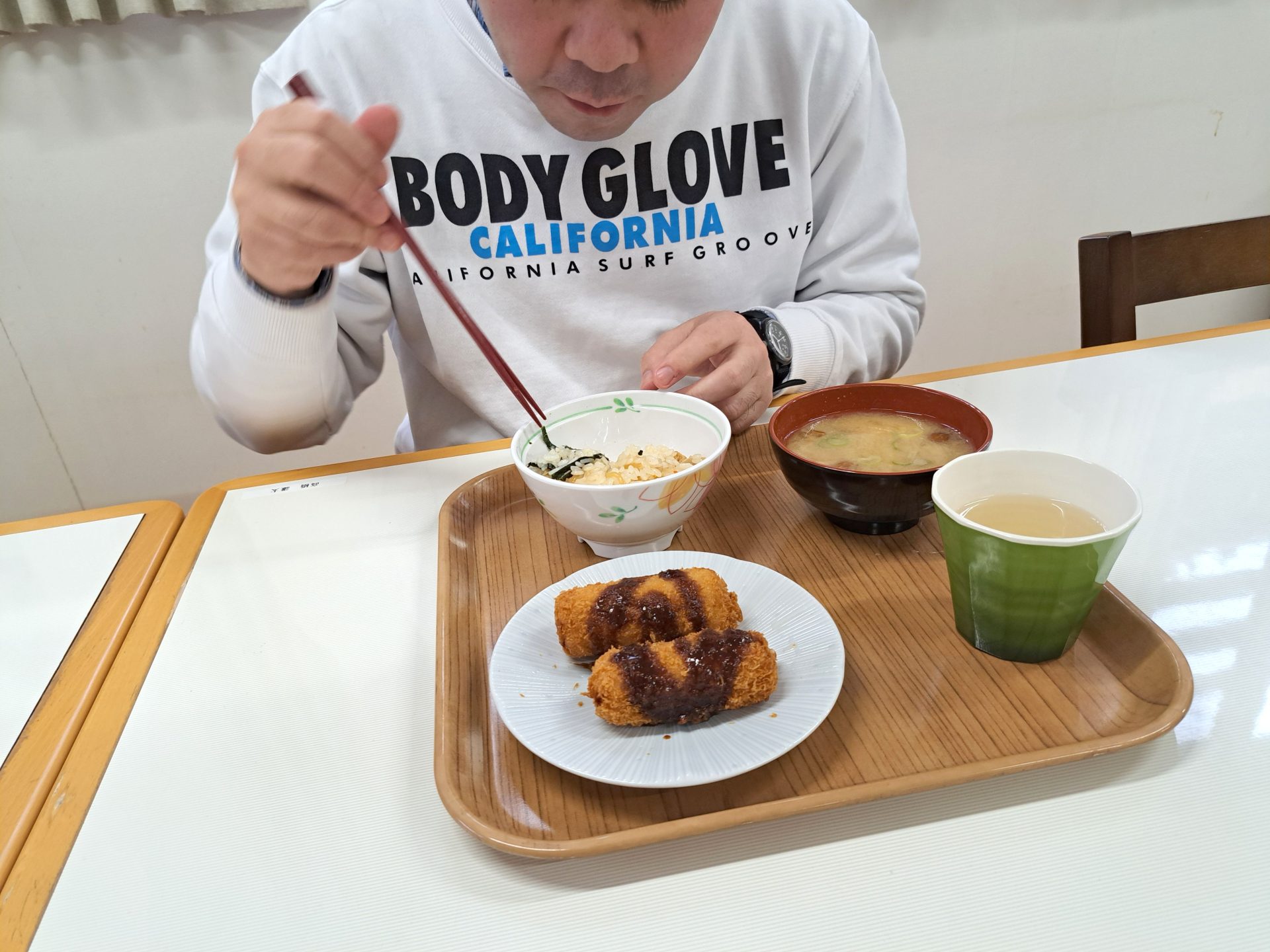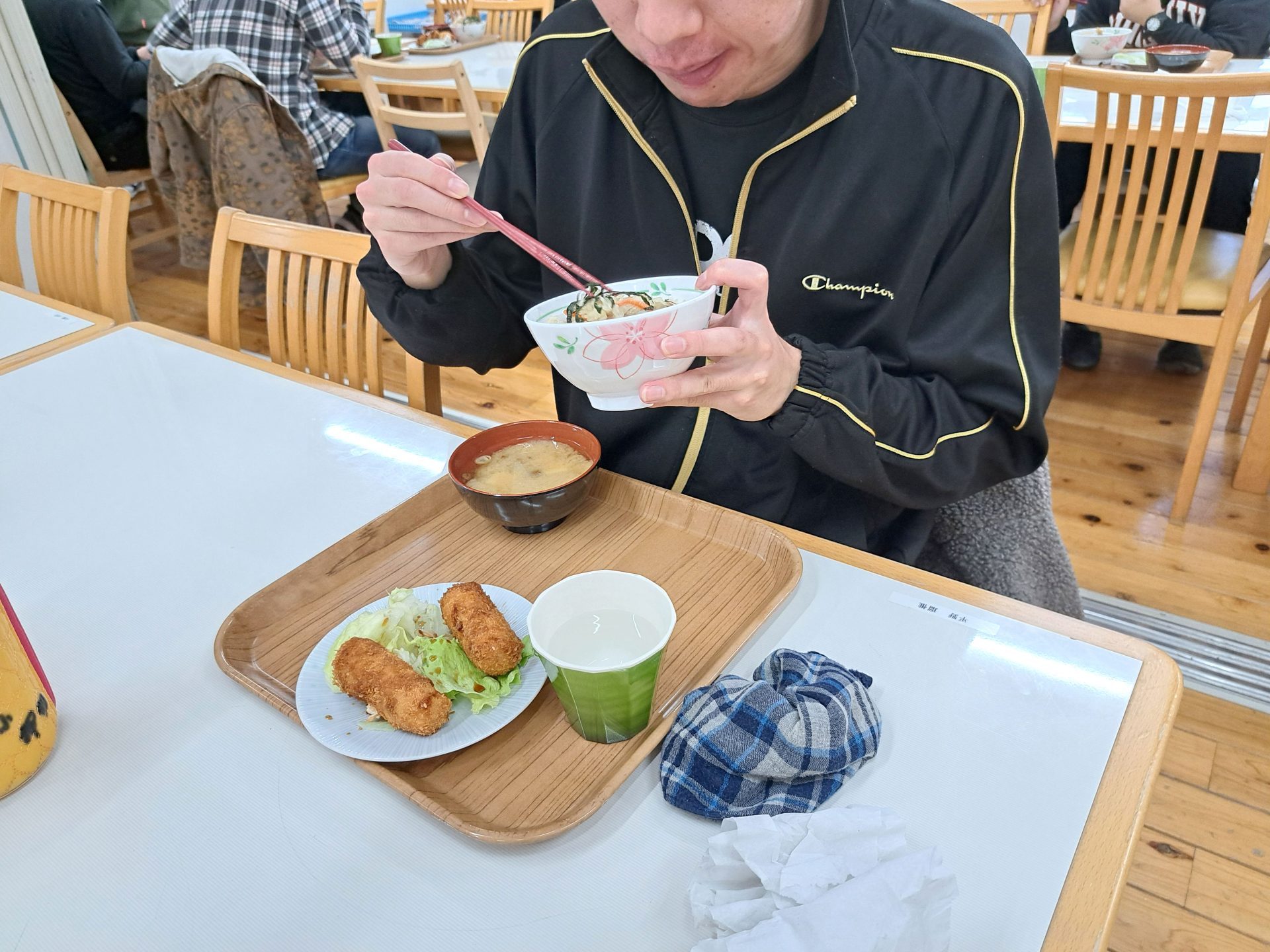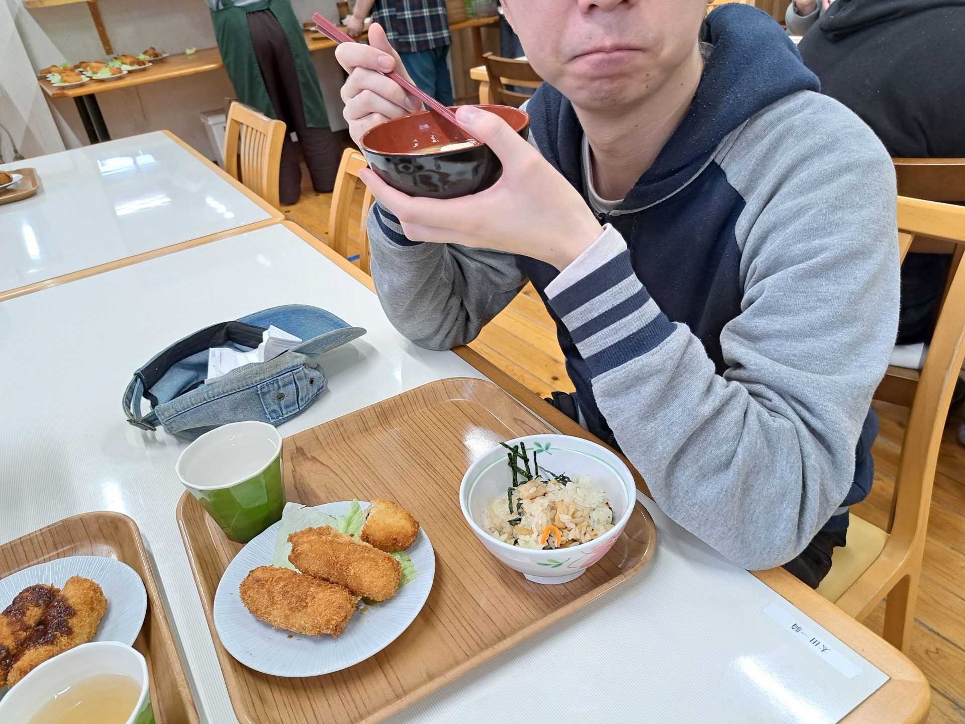 こちらが今日のメニュー!なめこ汁と五目御飯最高!揚げ立てのロールフライも♡