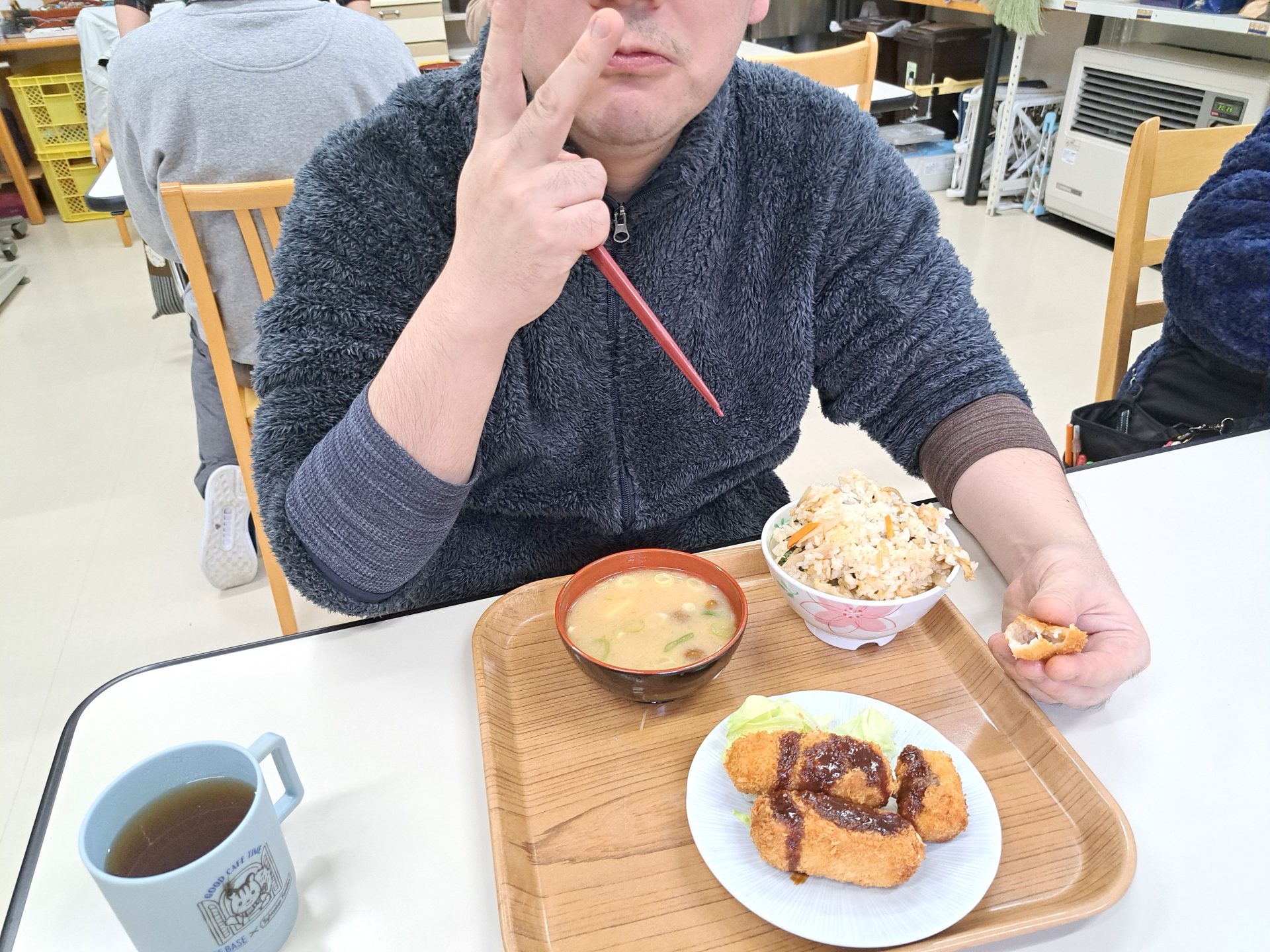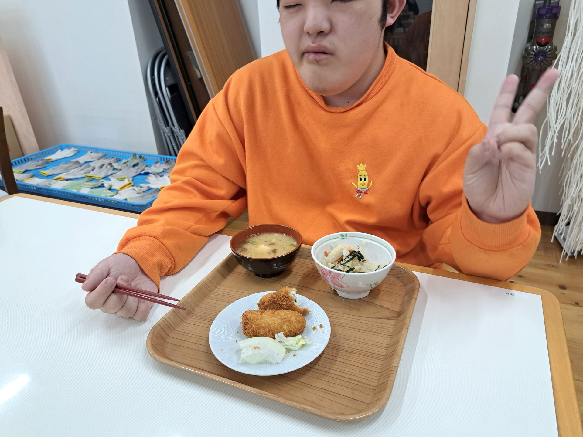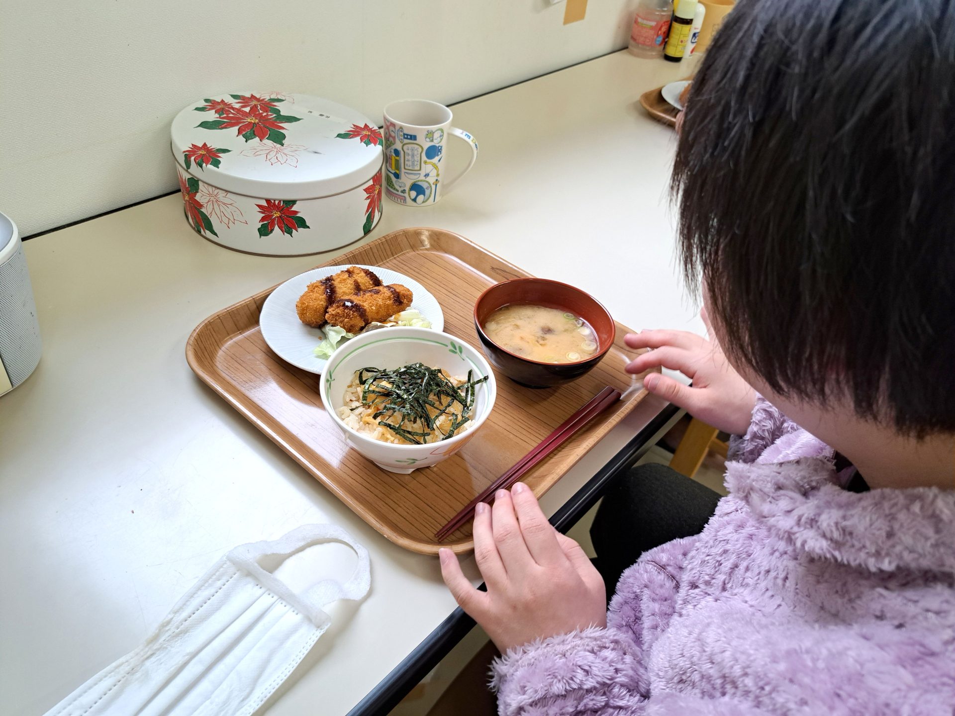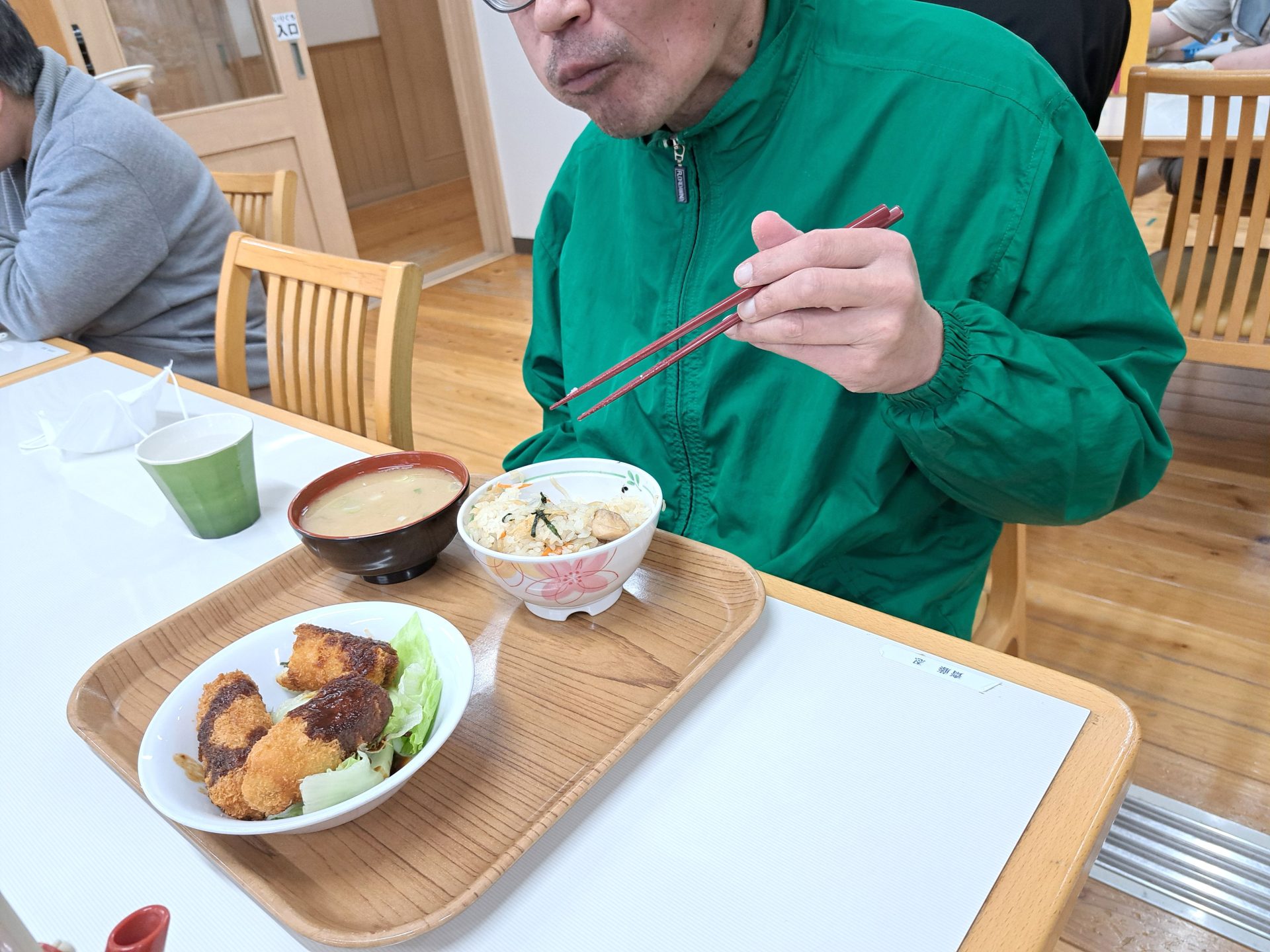 こちらが今日のメニュー!なめこ汁と五目御飯最高!揚げ立てのロールフライも♡
