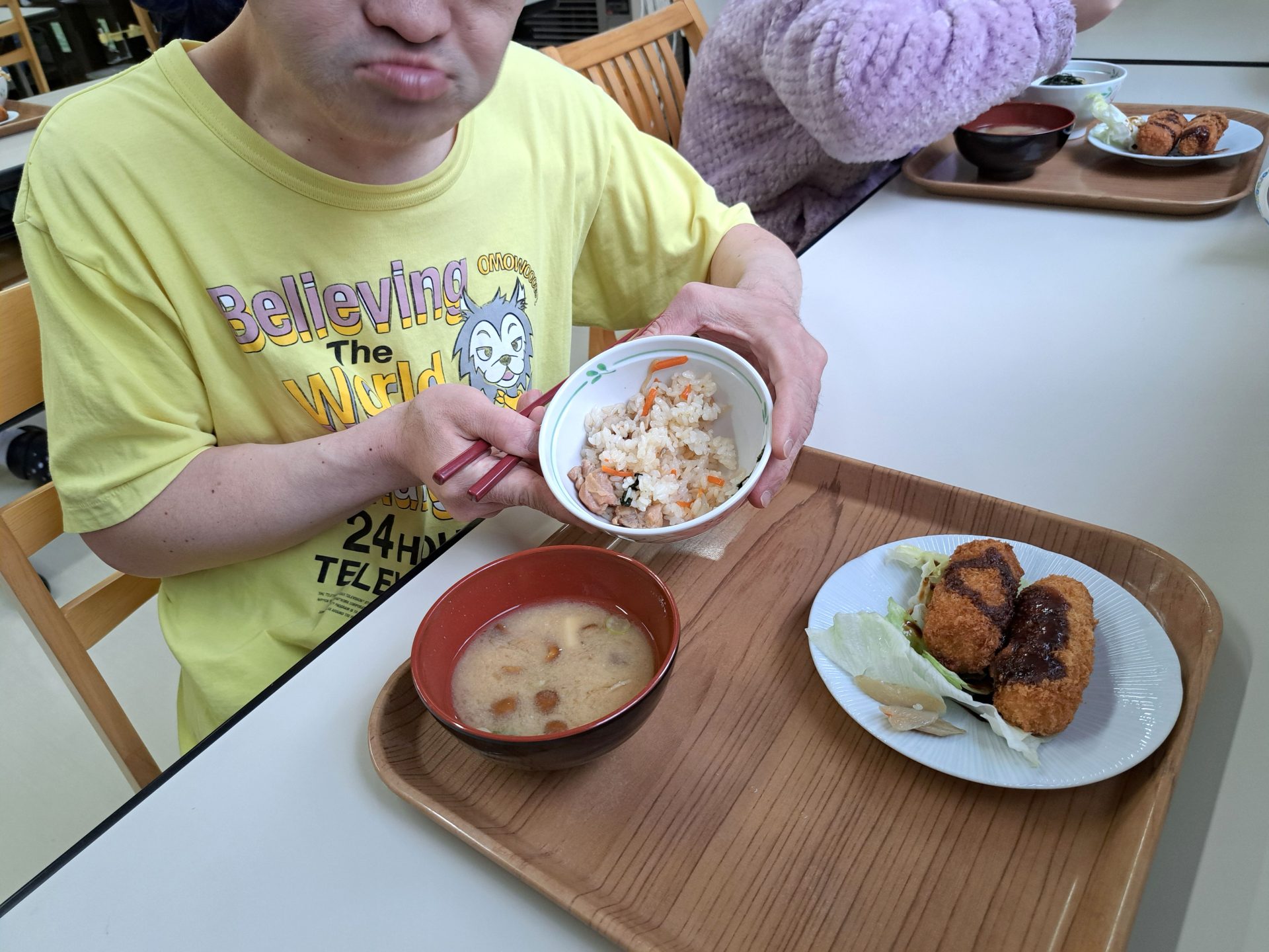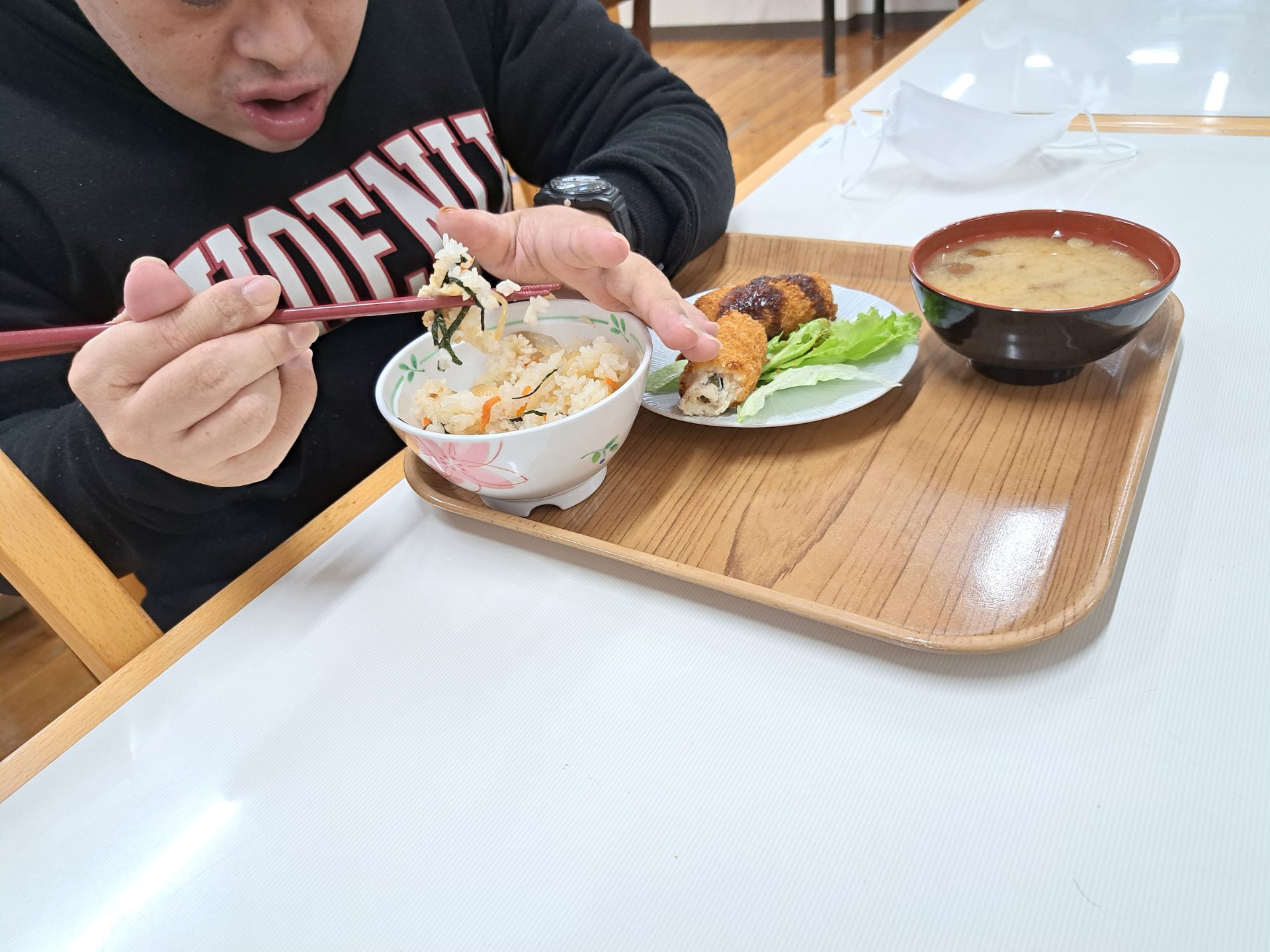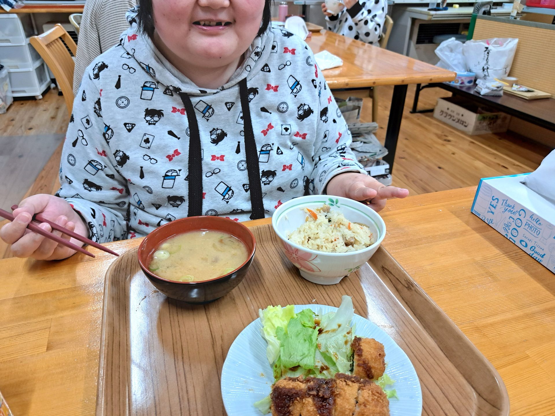 実は昨日は急きょお弁当になったので、今日のメニューは…昨日のメニューだそうですよ~!五目御飯だ!!(´▽`*)