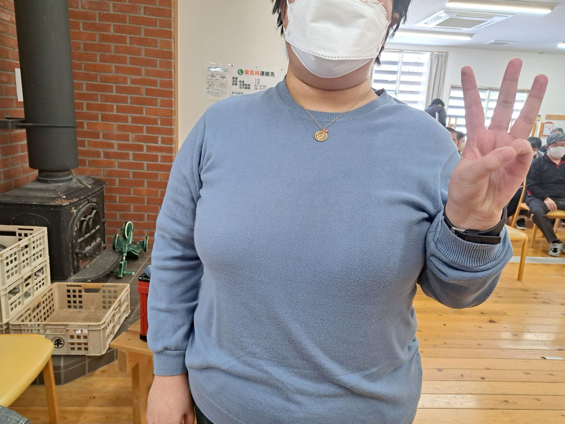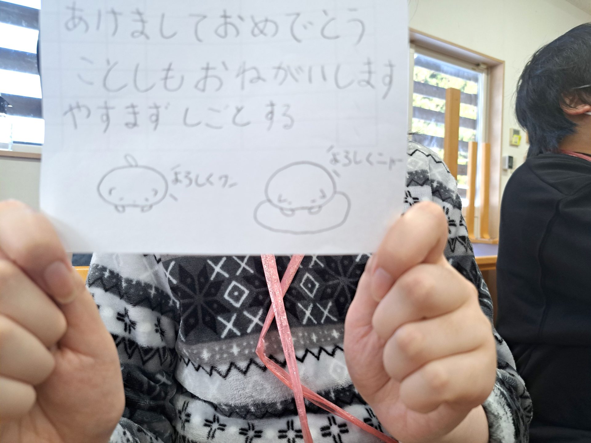 今日は食堂ホールに全員集合~年頭行事の始まりです!待ち時間に利用者さんにごあいさつ&インタビュー(*^-^*)