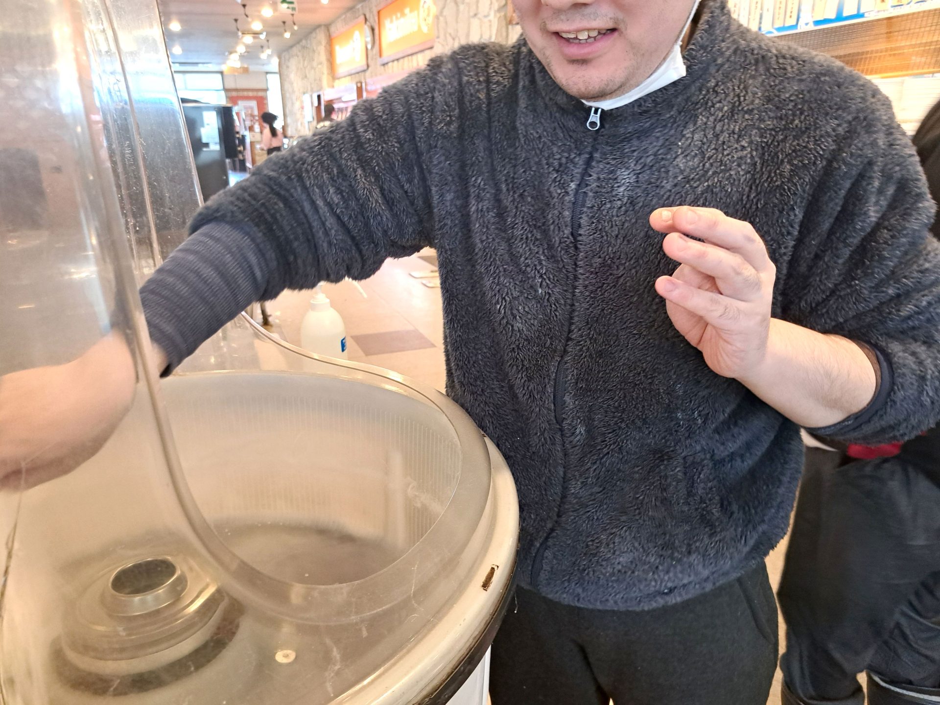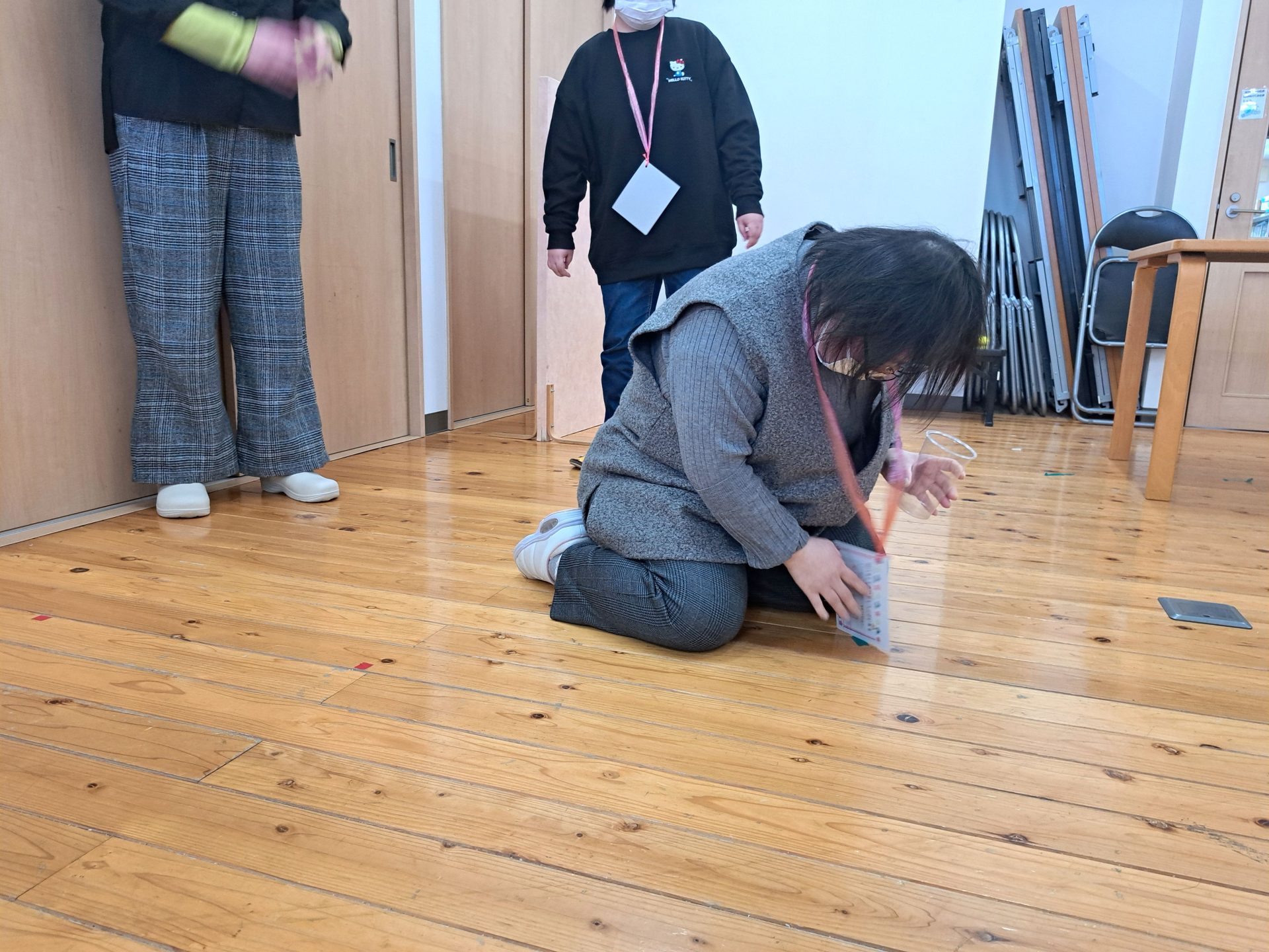 次はコップでピンポン玉を受けるゲームだよ~こーやって~って全然入らない職員~( ´艸`)