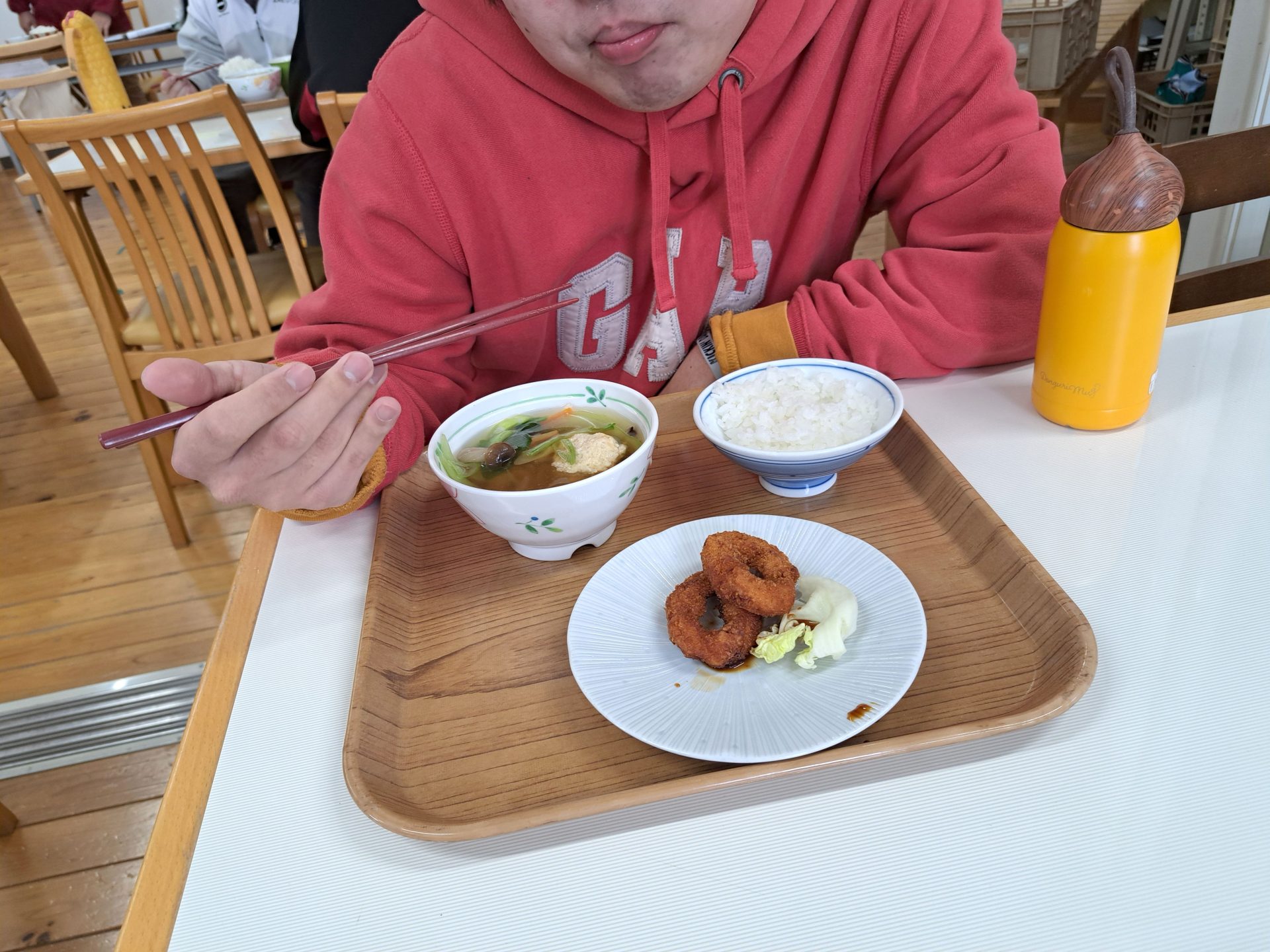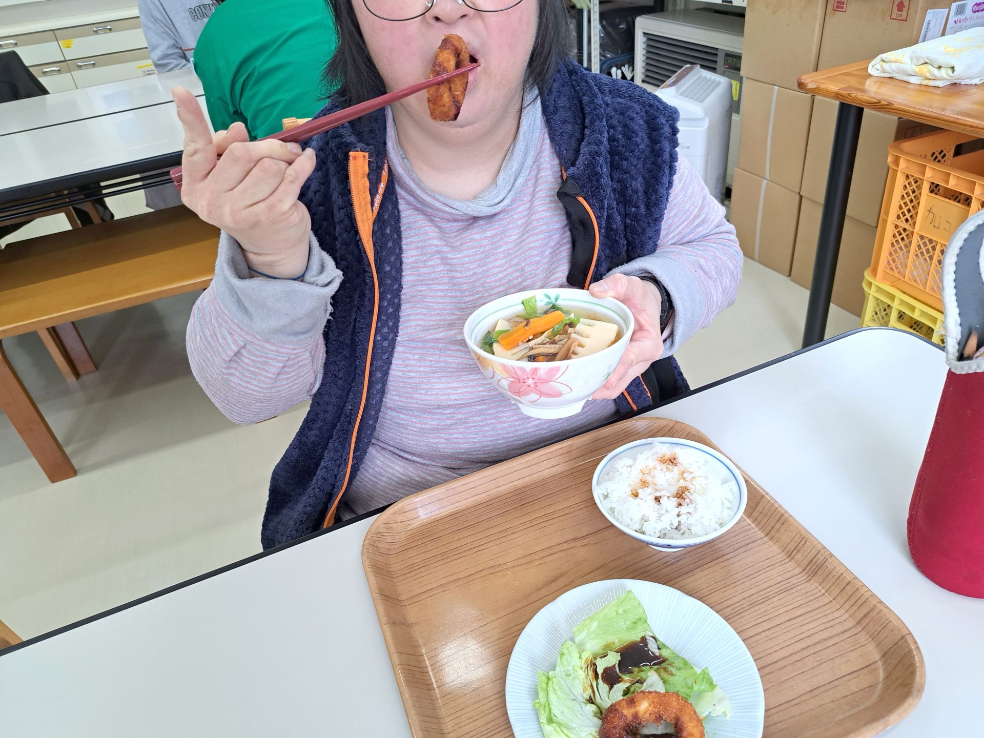 今日のメニューは野菜たっぷり肉団子と春雨のスープと揚げ立てイカリングフライ~♪