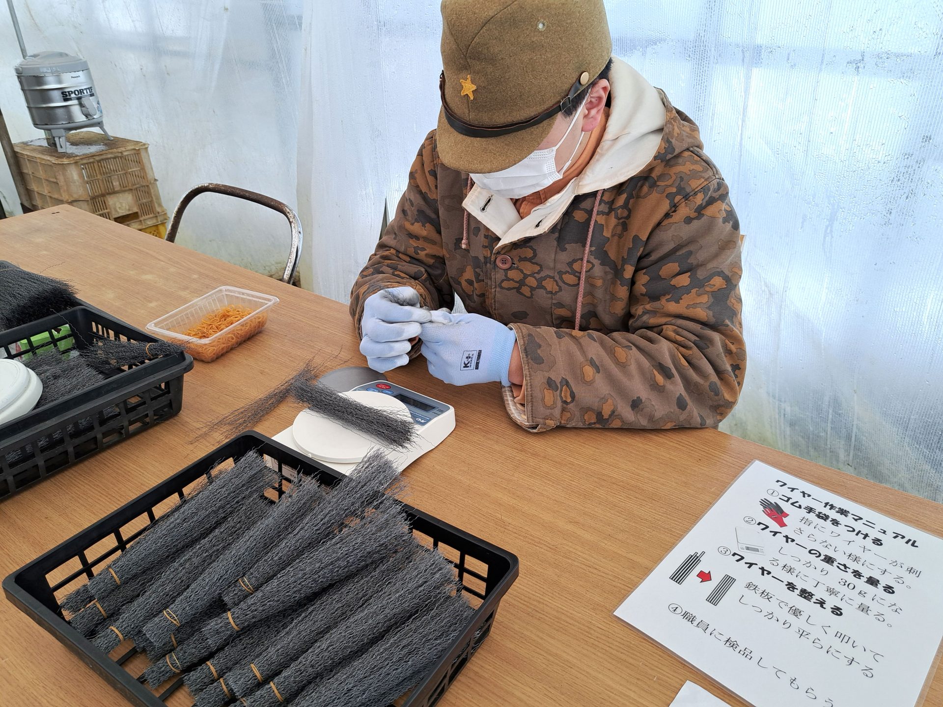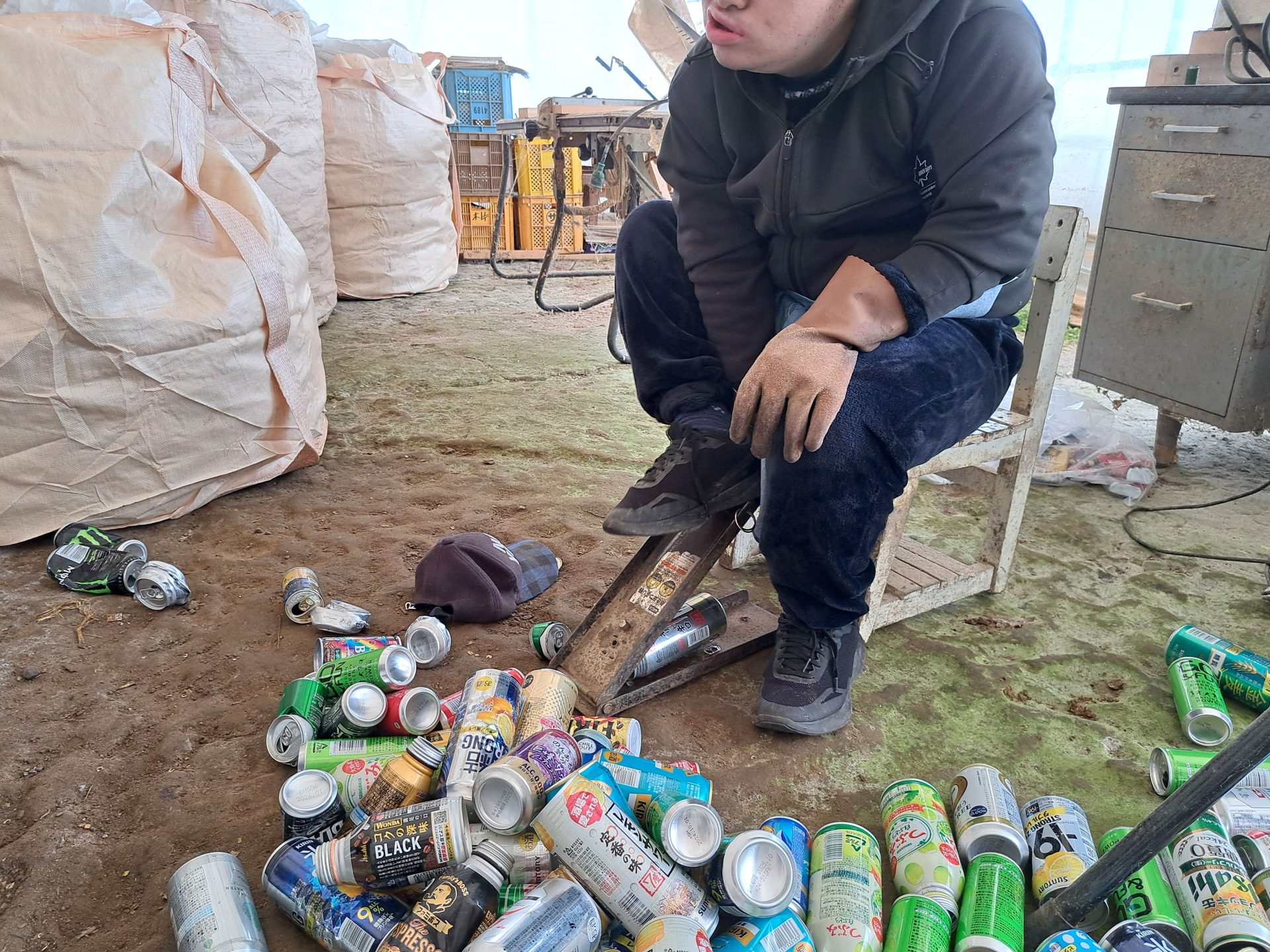 ハウスでは午前から木工班が空き缶潰しがんばっていました!