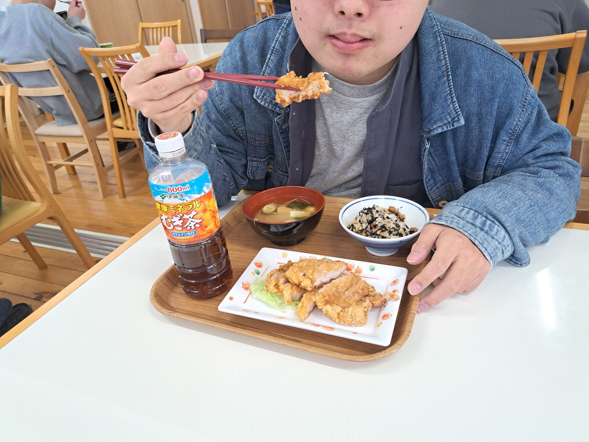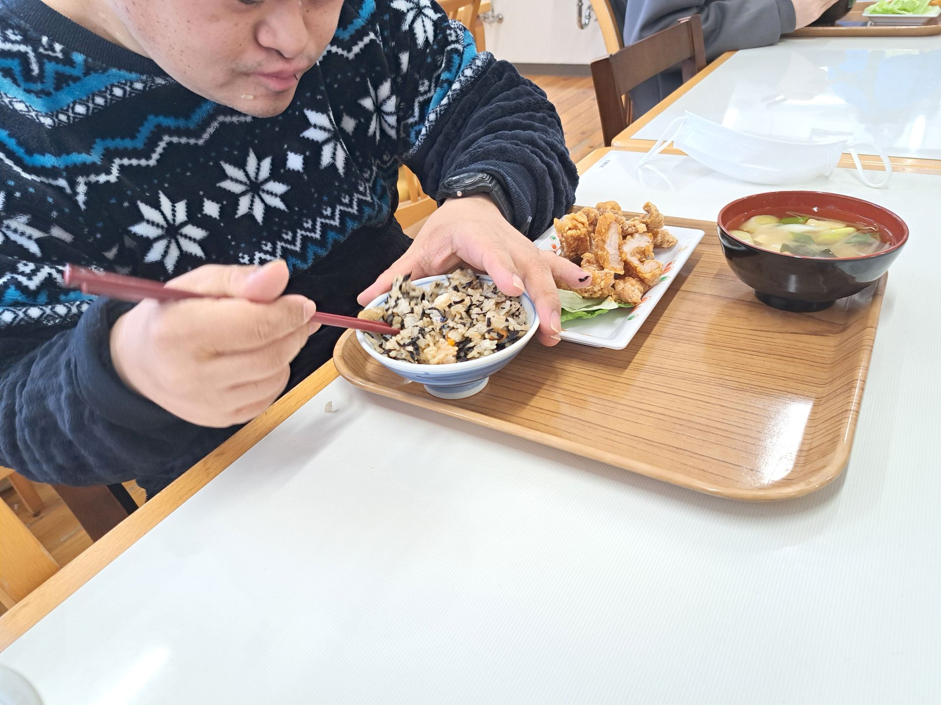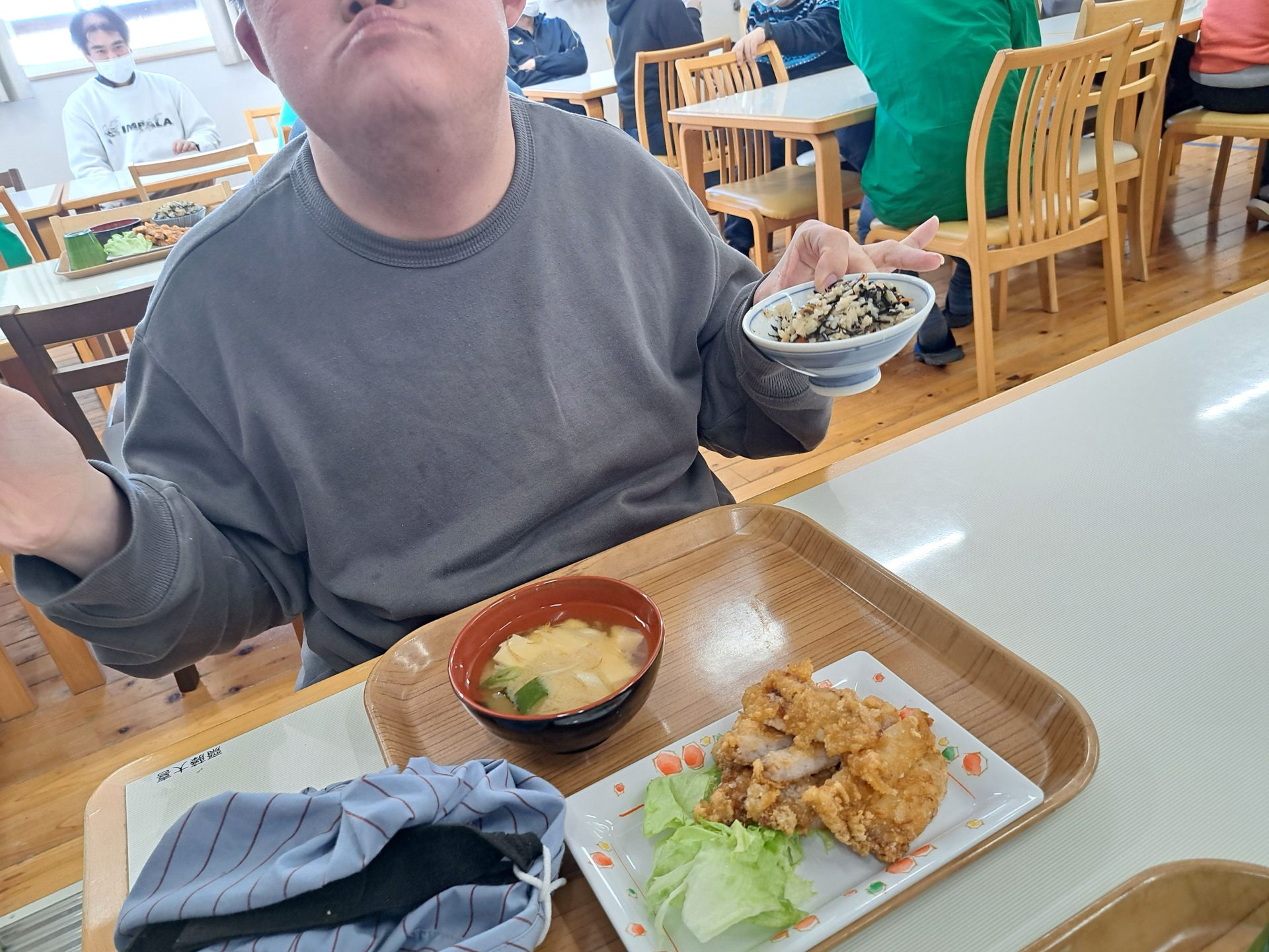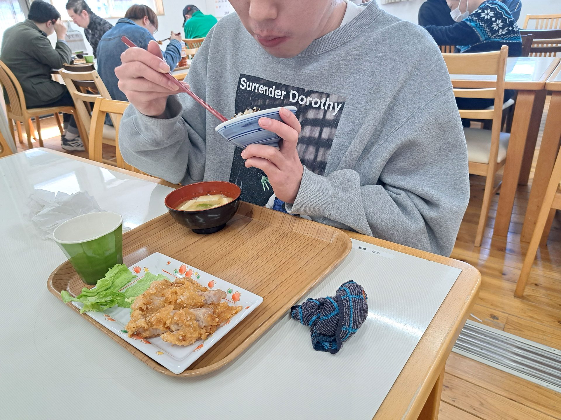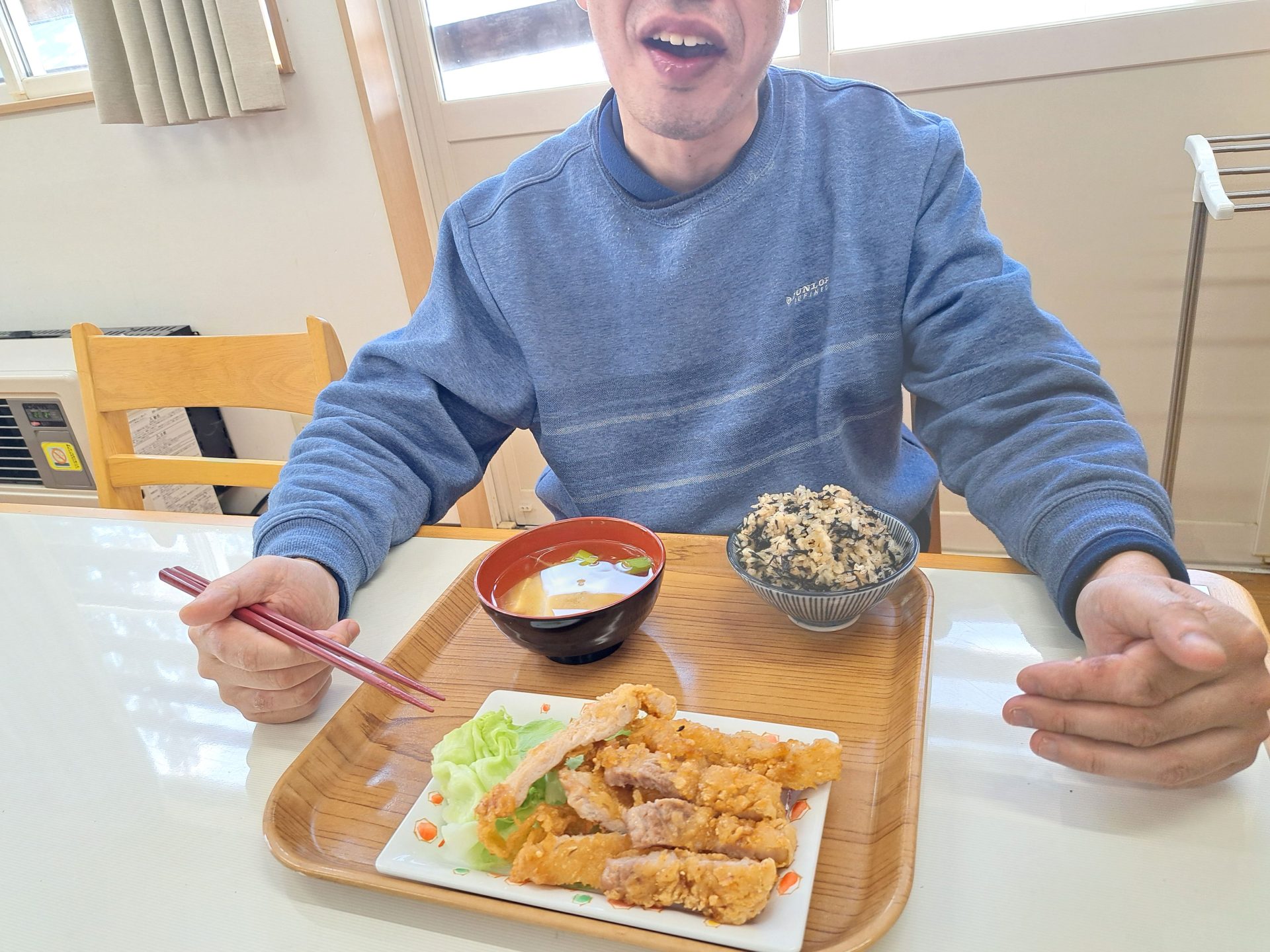 「朝ごはんは、ご飯とからあげとみそ汁だ~昨日は12時で寝れたっけ~!」