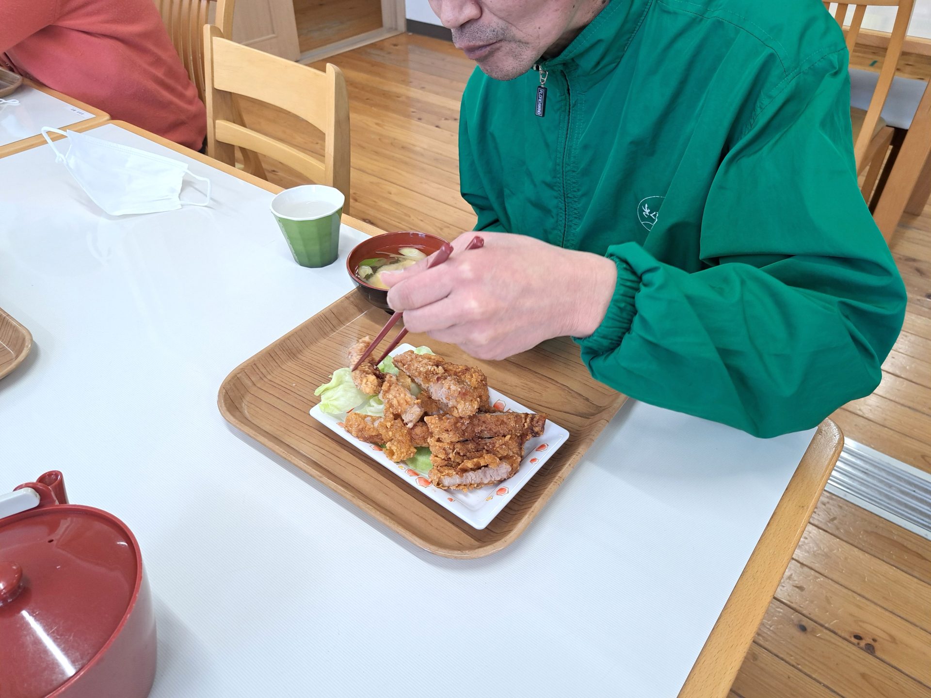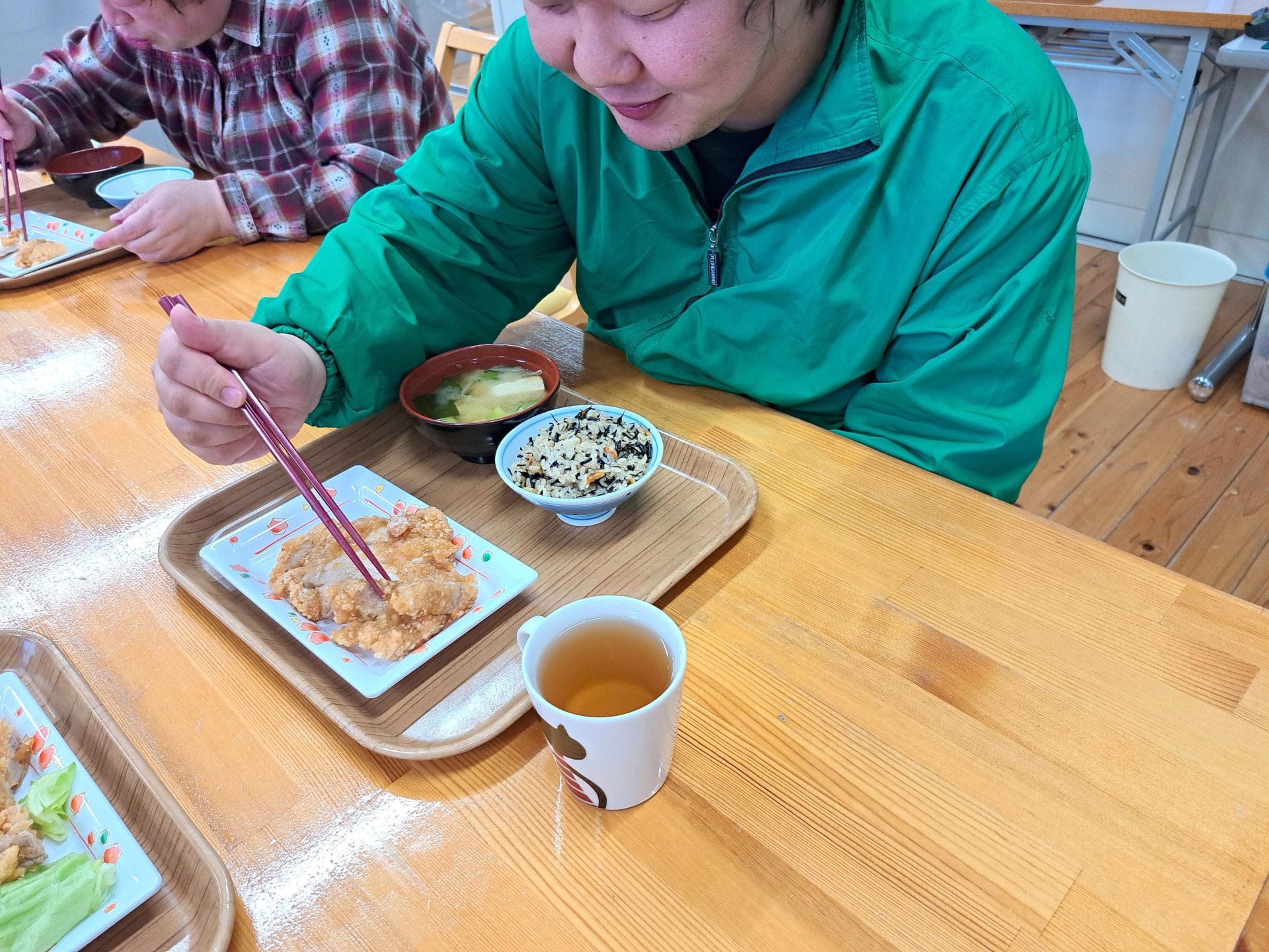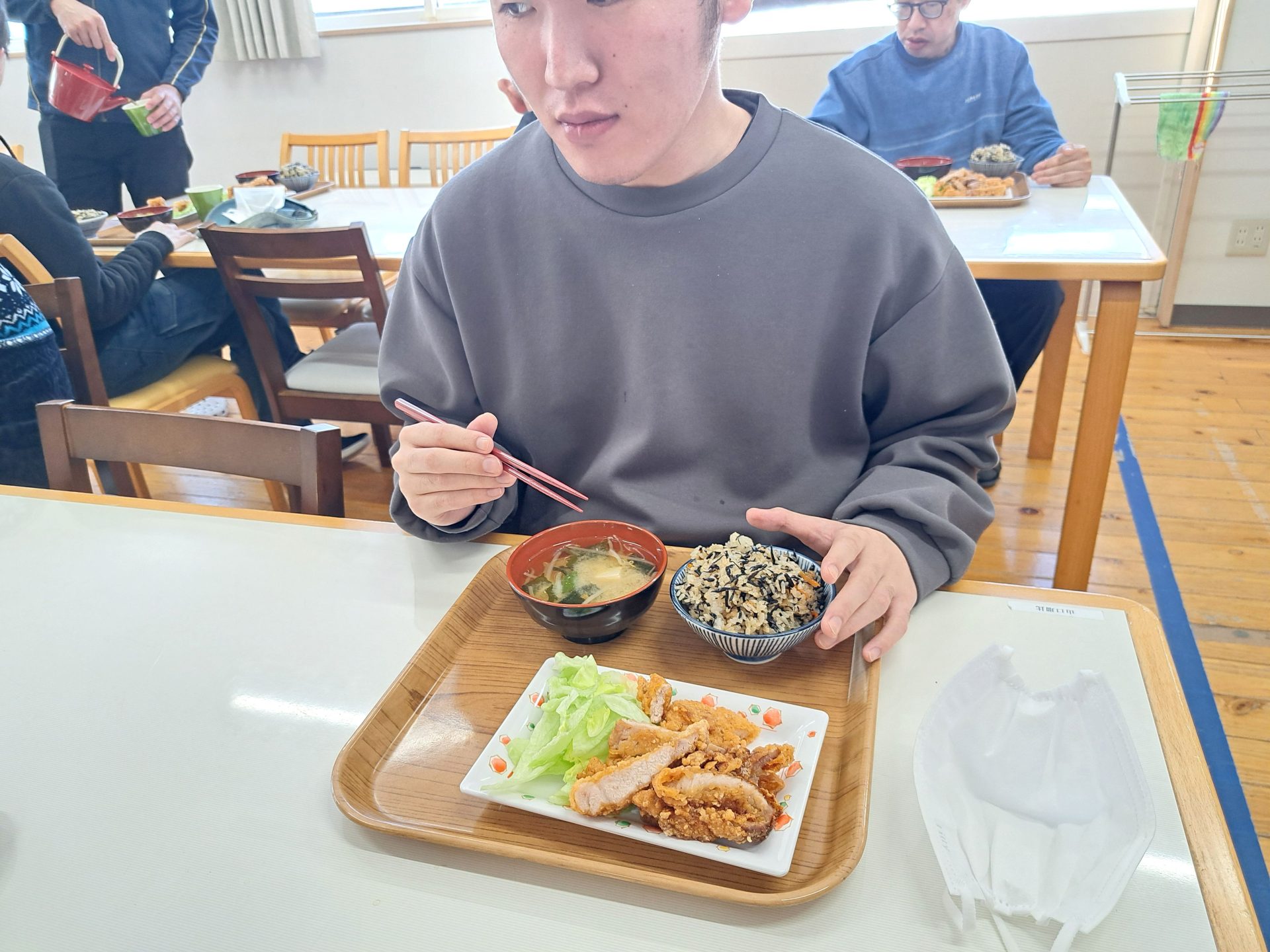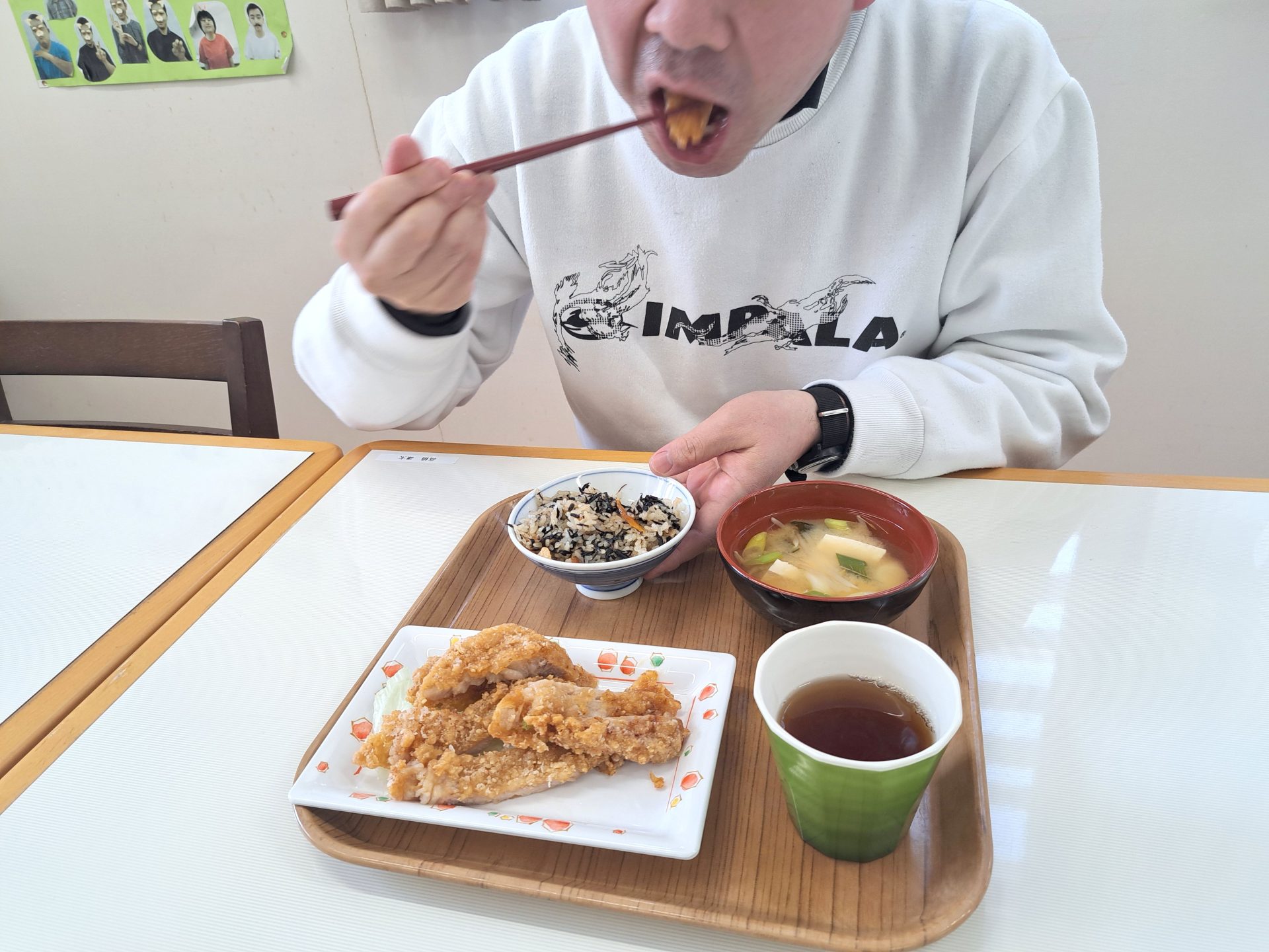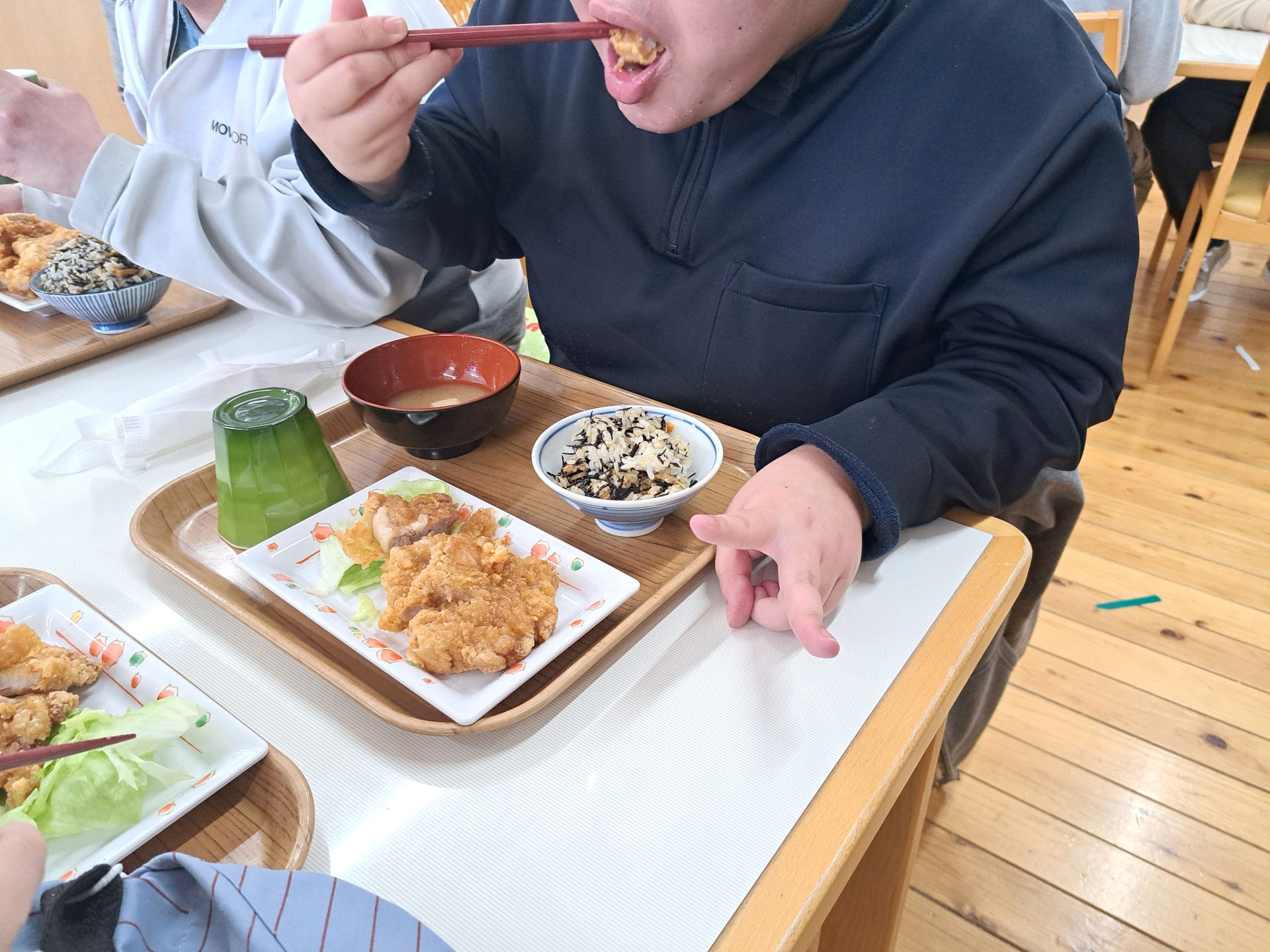 「朝ごはんは、ご飯とからあげとみそ汁だ~昨日は12時で寝れたっけ~!」