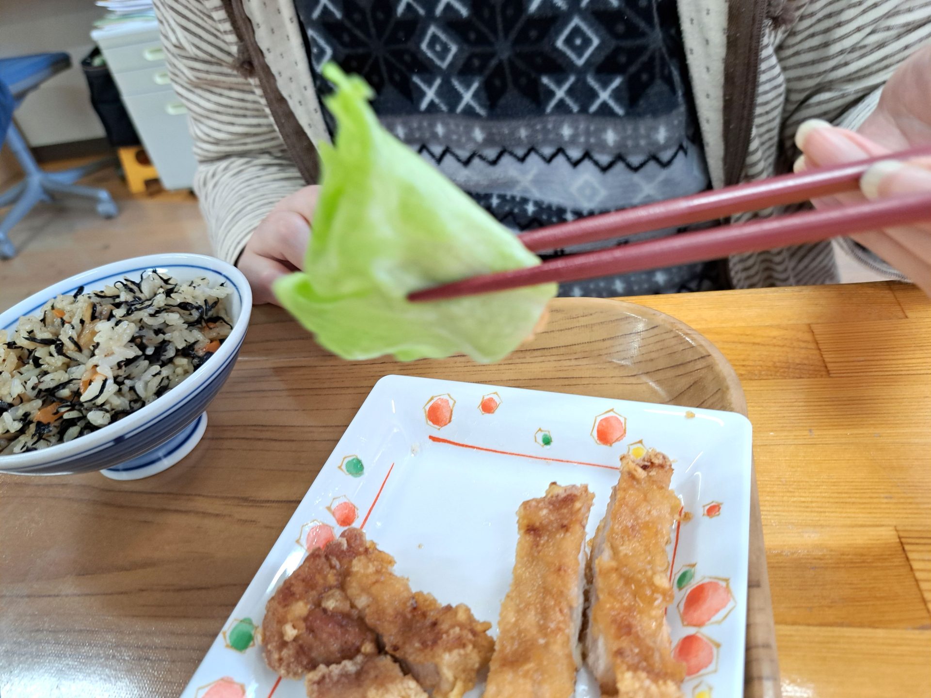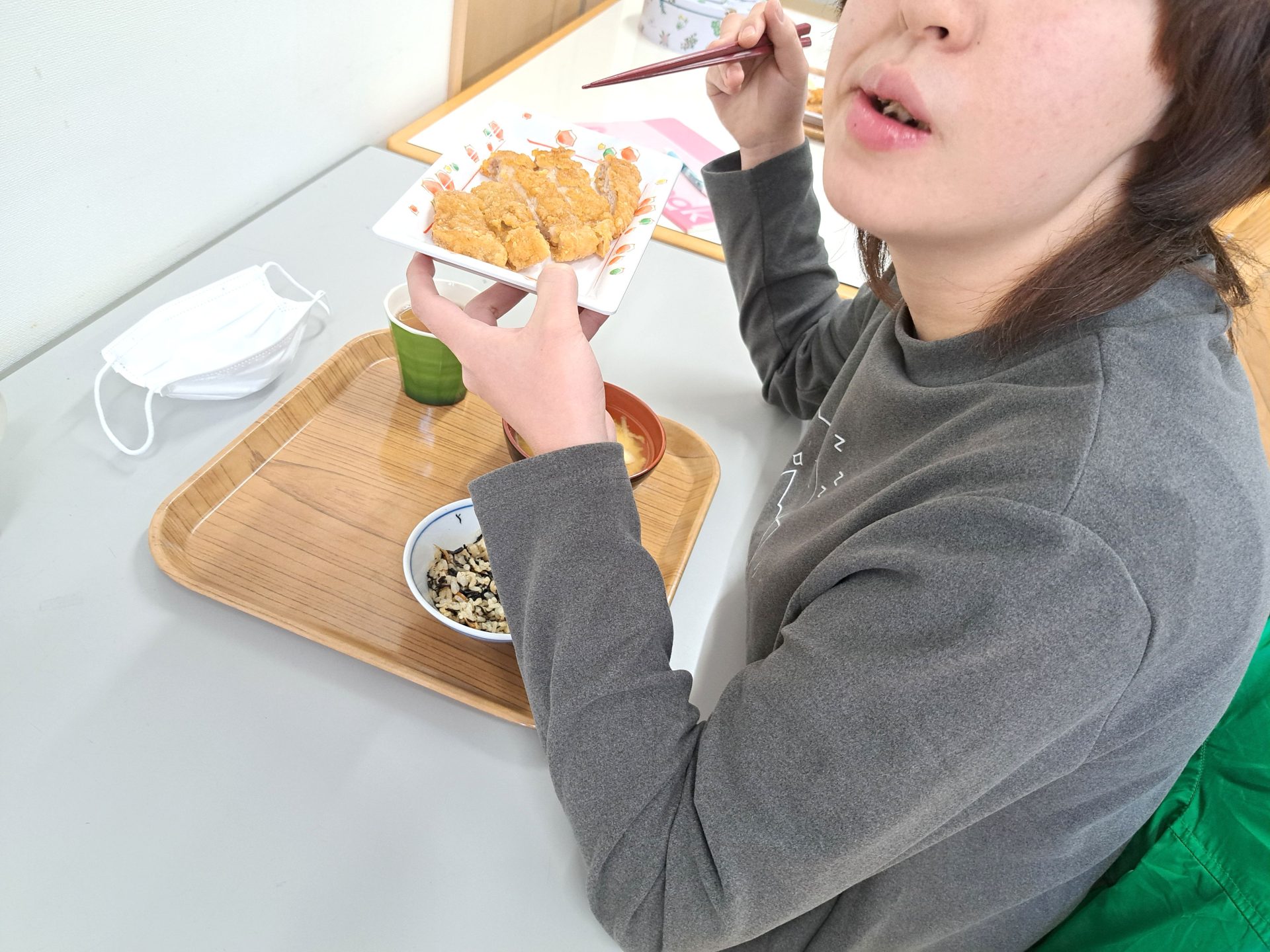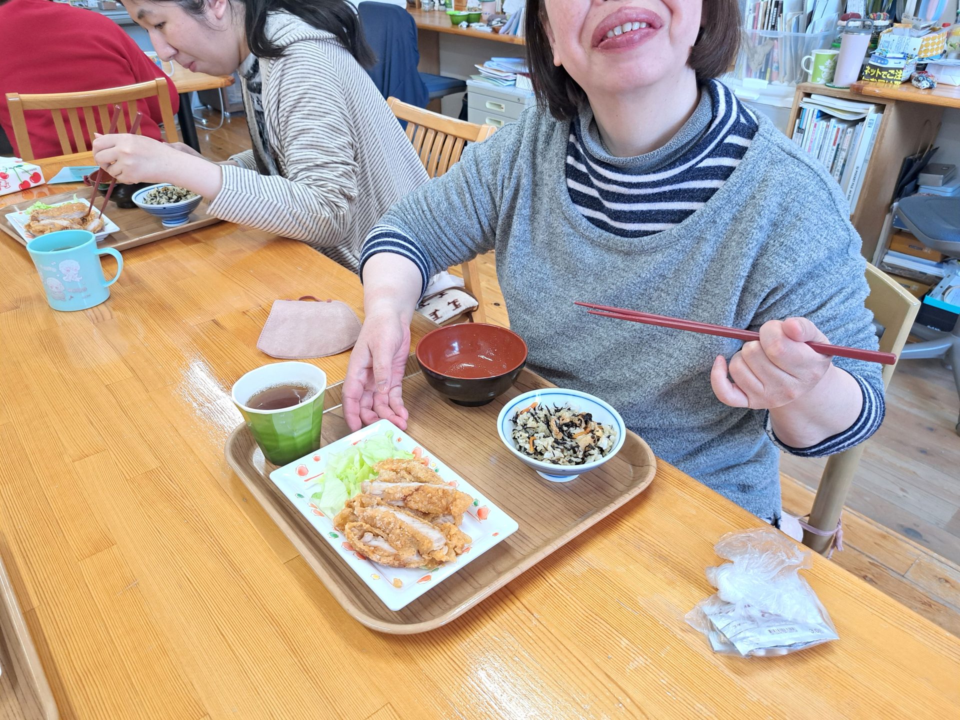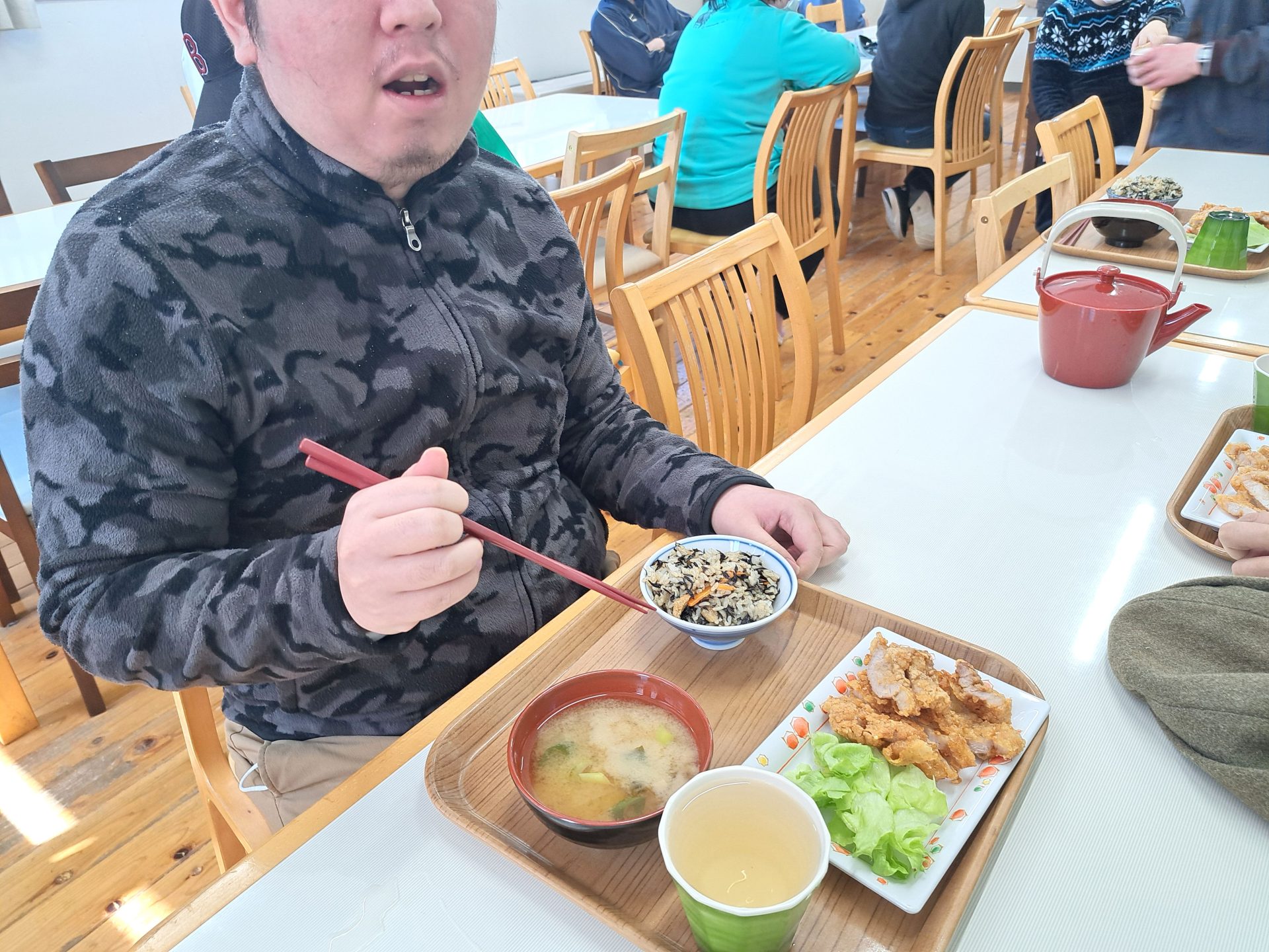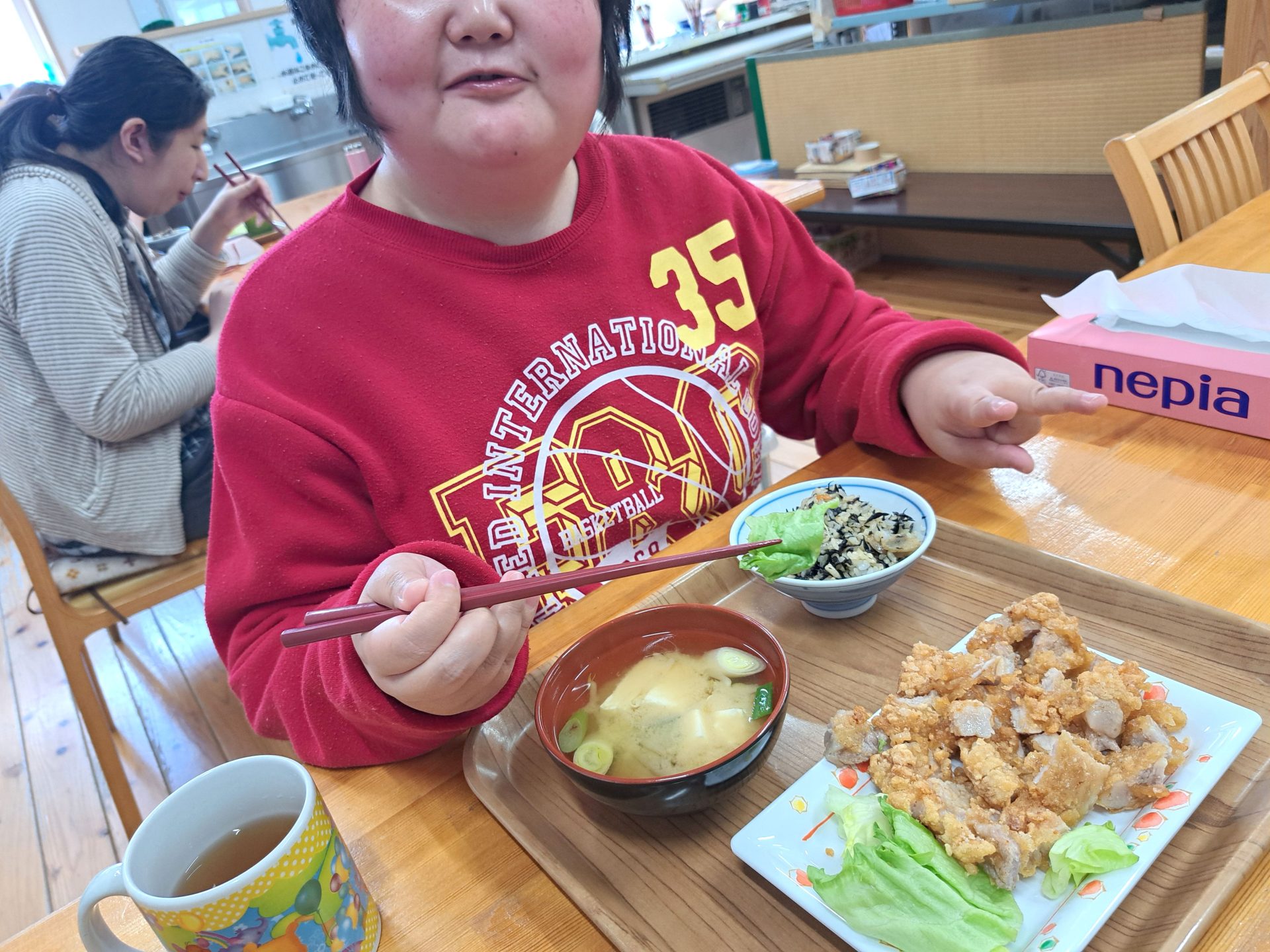 「朝ごはんは、ご飯とからあげとみそ汁だ~昨日は12時で寝れたっけ~!」
