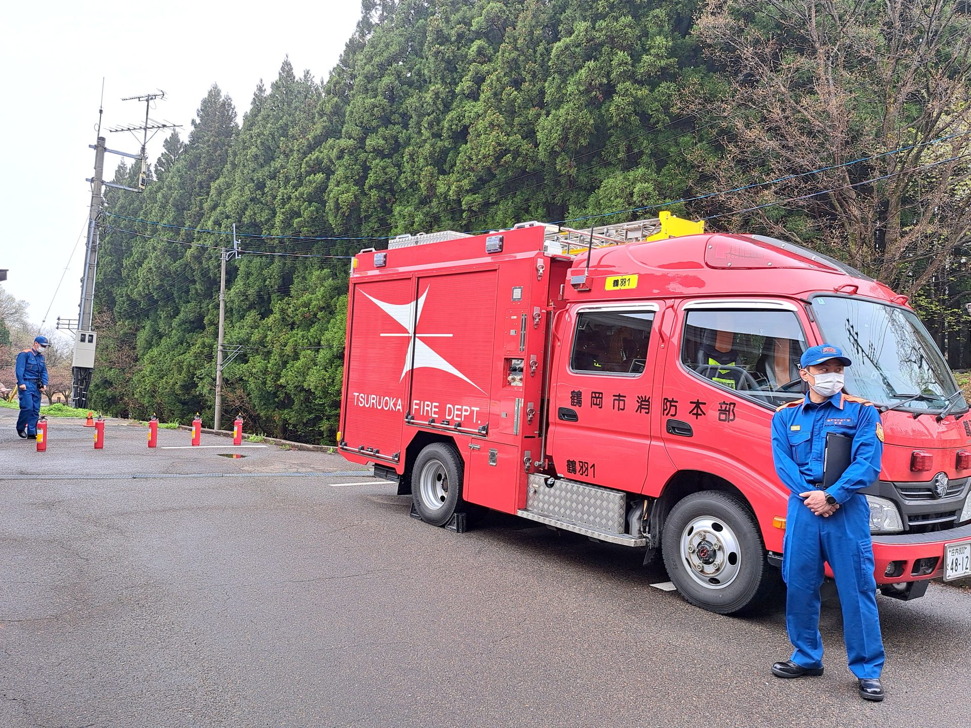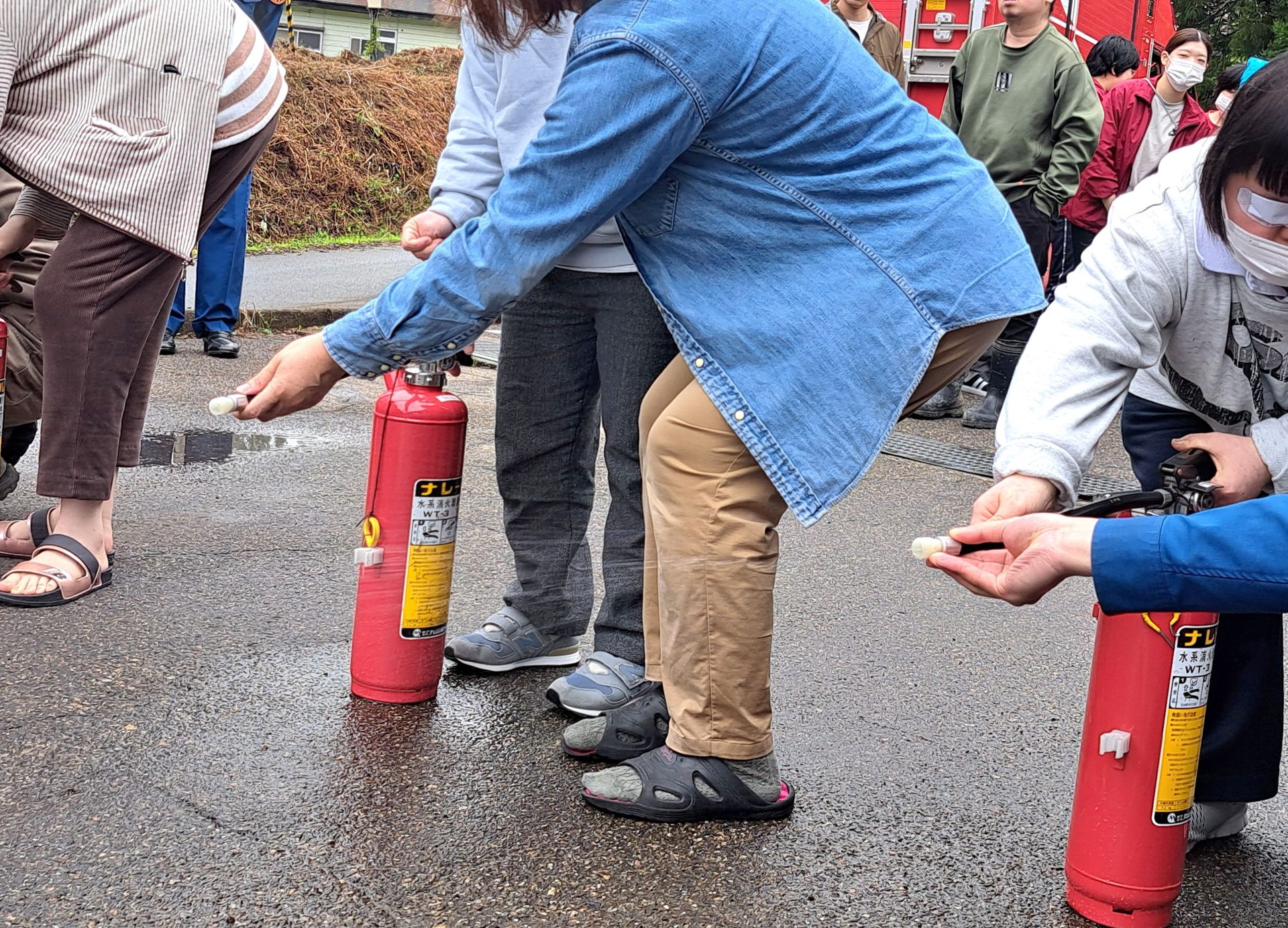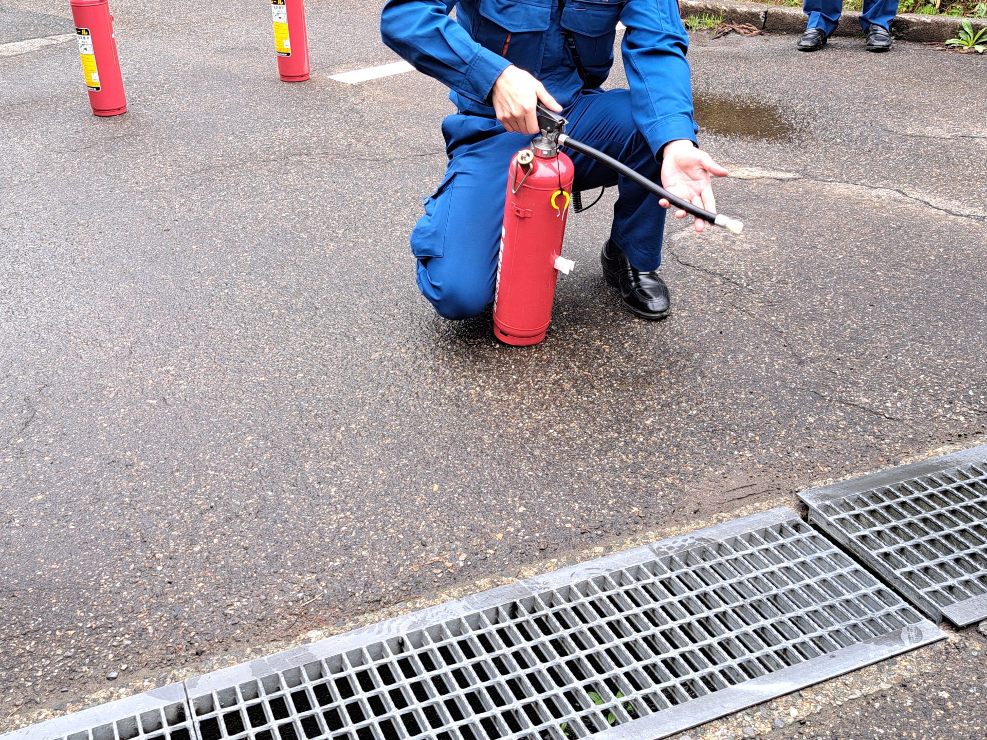 勢いよく出る消火剤(今日は水)にみんなちょっと楽しそう♪