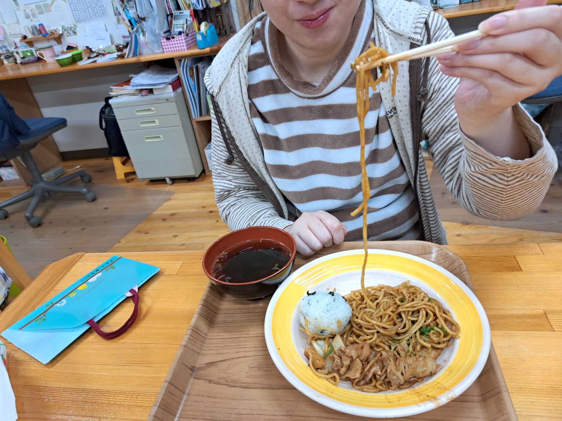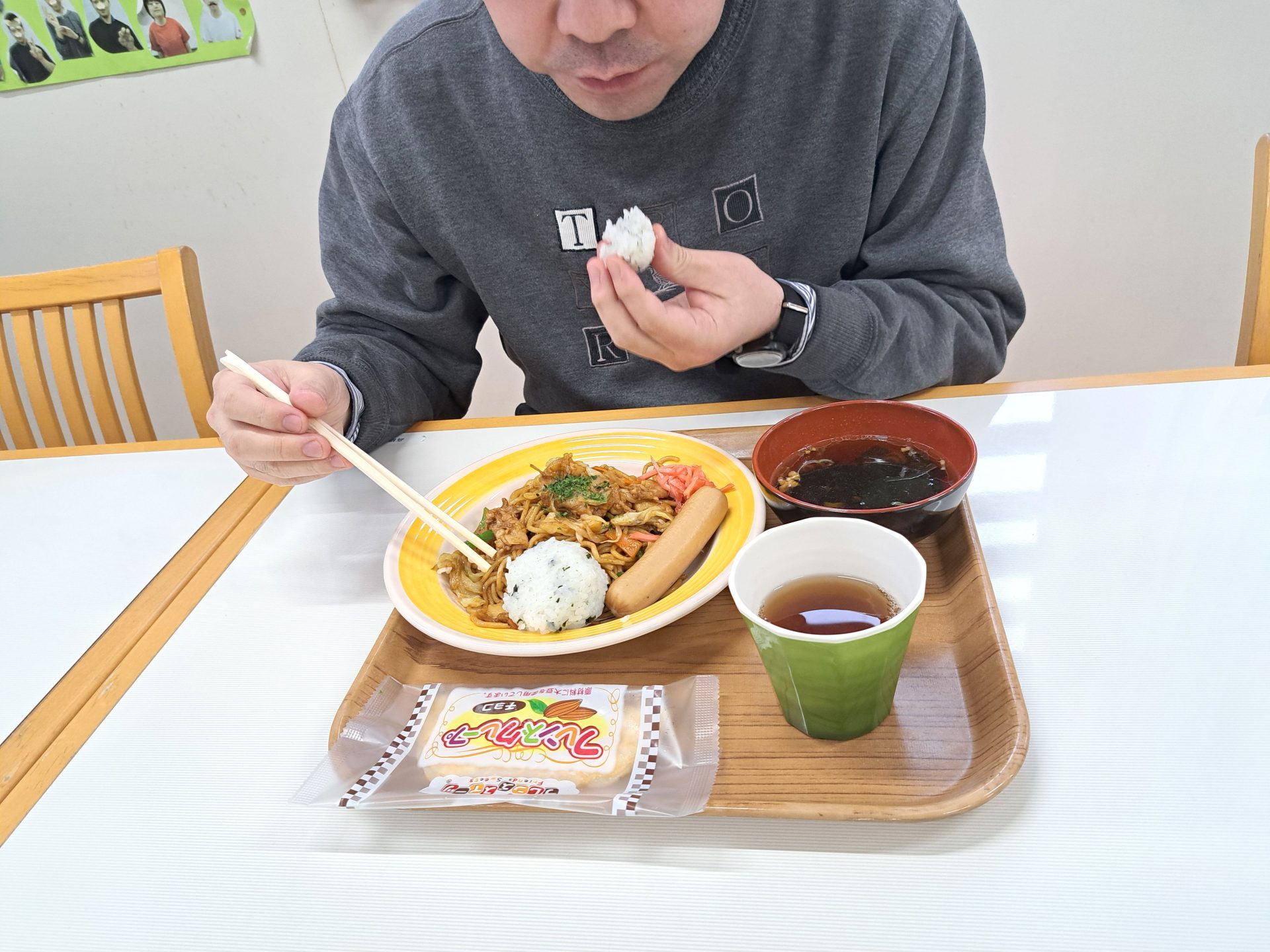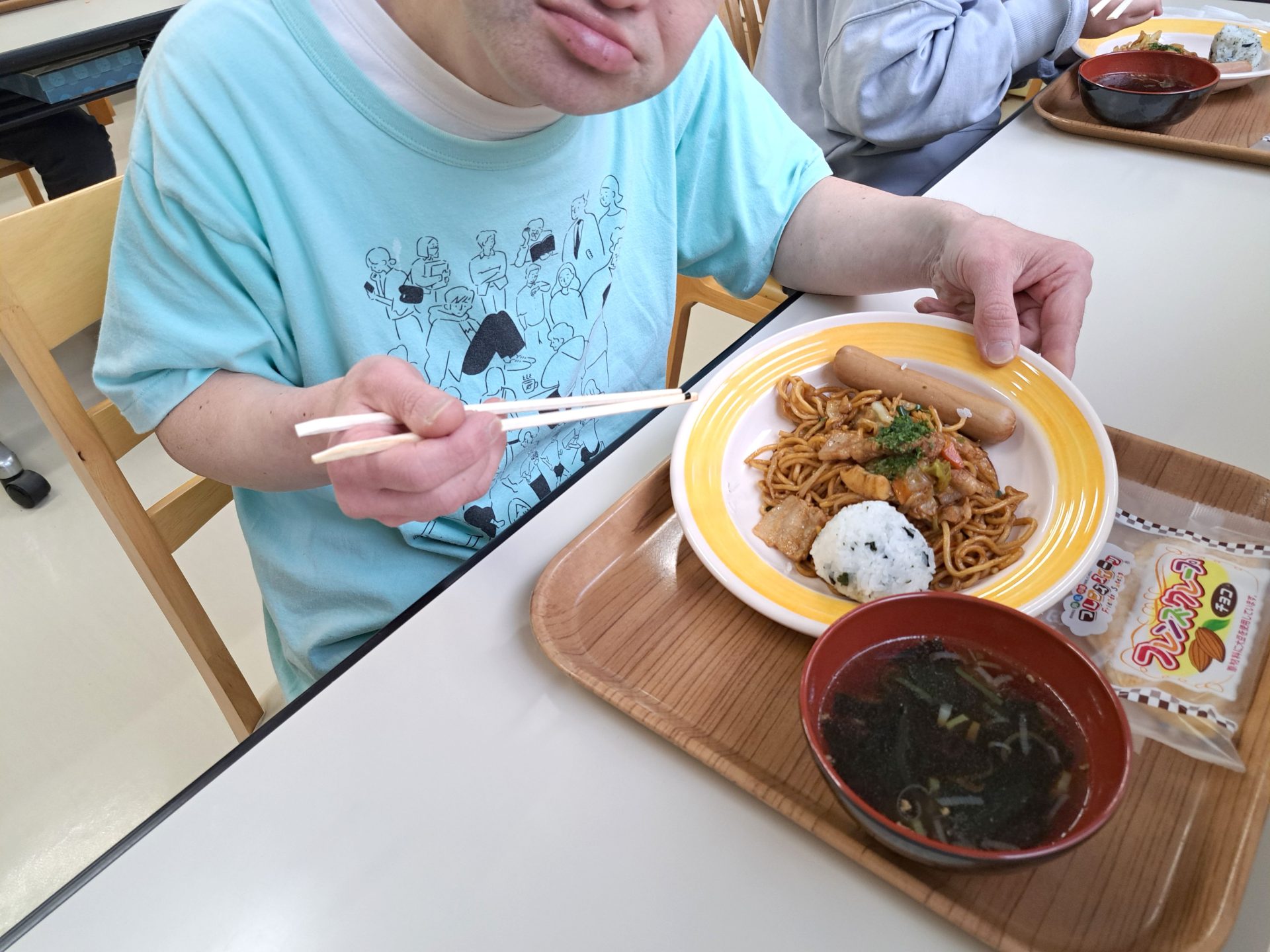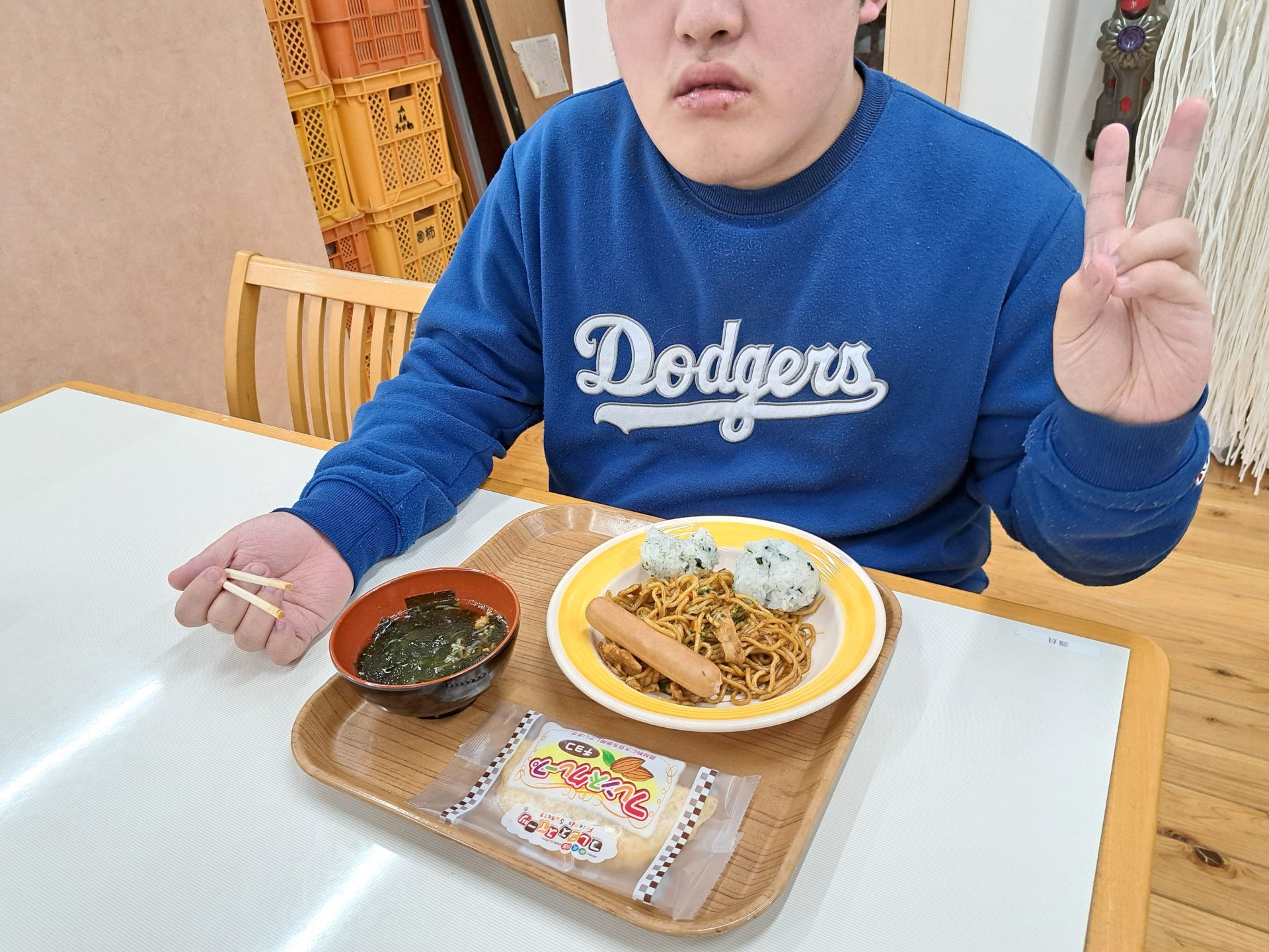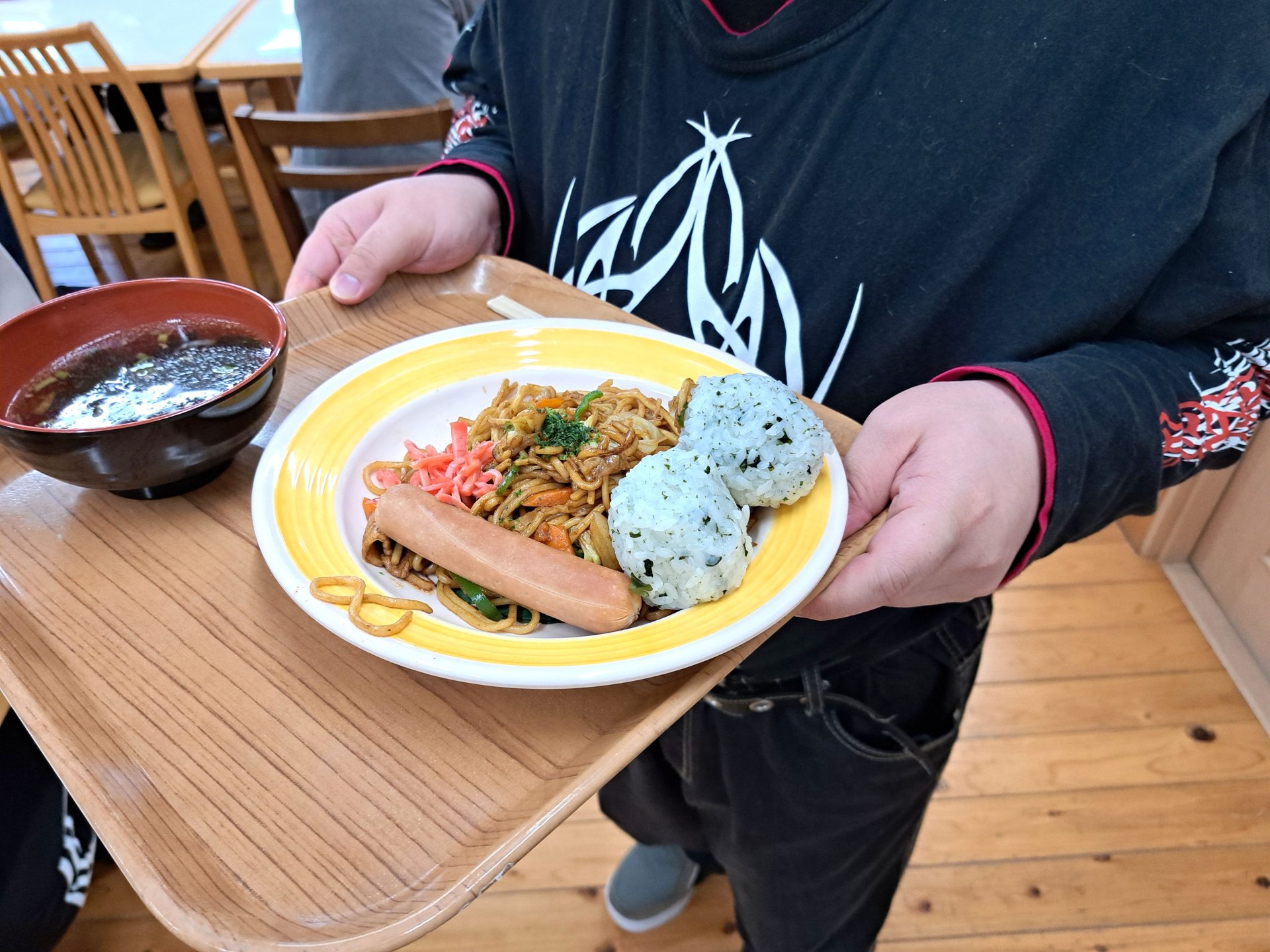 今日はソース焼きそばとおにぎりフランクフルト&ワカメスープ♪めっちゃ美味しそうですーーー(/ω\)