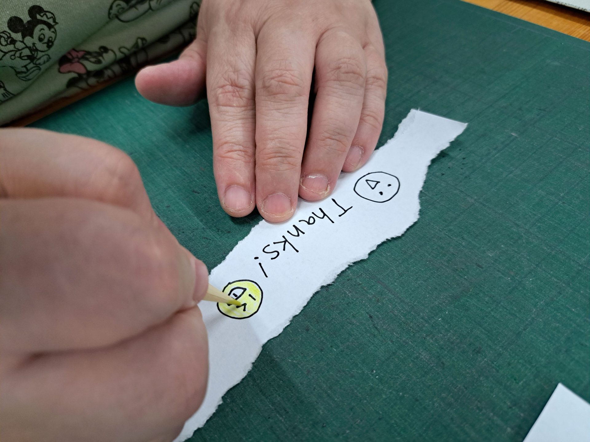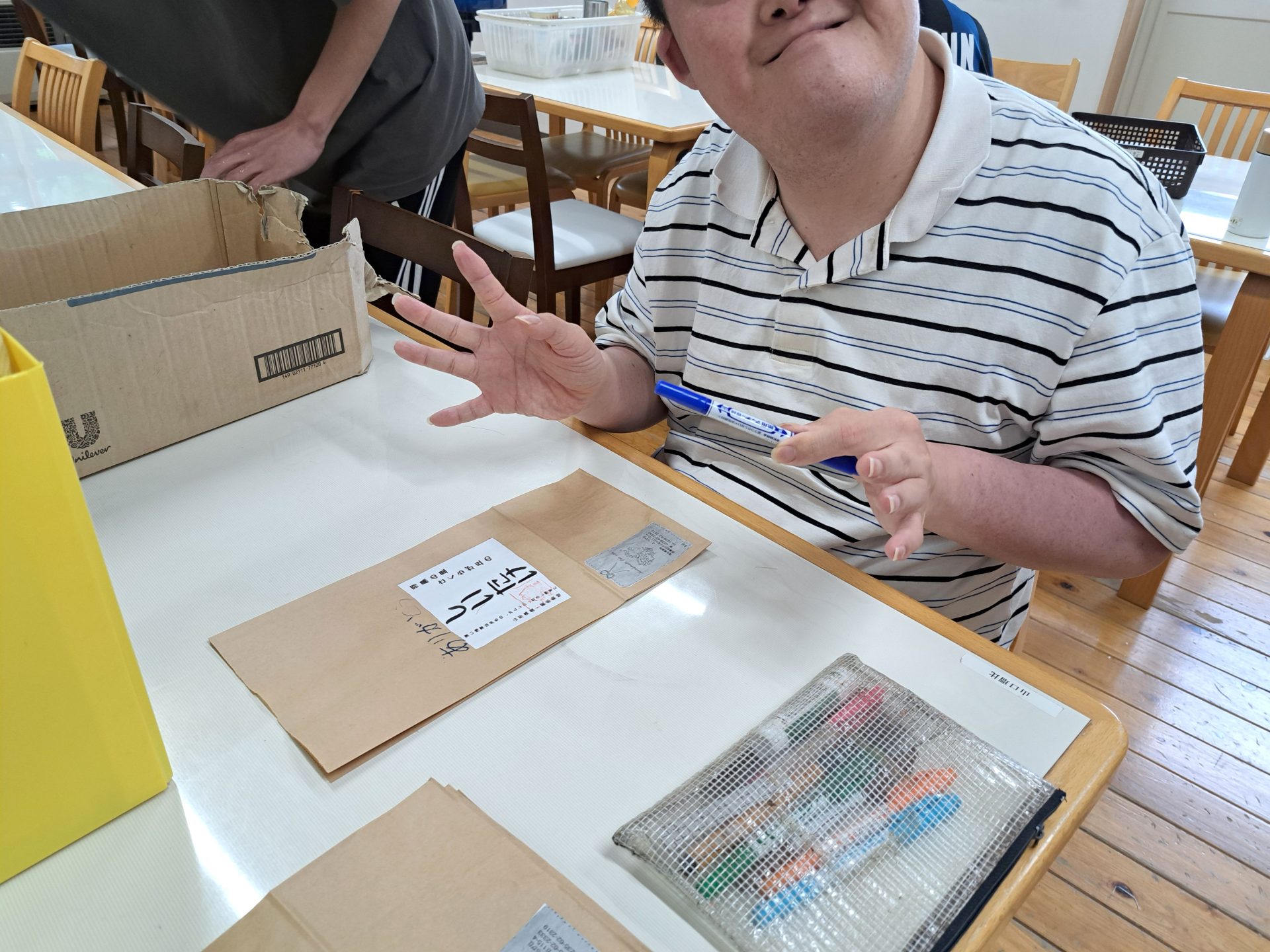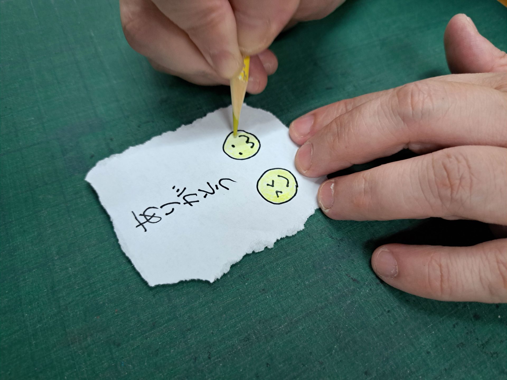 いつも新聞紙の袋を作ってくれている利用者さんにぜひ描いてもらいたいな~「え~わたし絵なんて描いたこことない~」と急なお願いに緊張マックスの利用者さん…手始めに簡単なにこちゃんマークを描く練習をしてみましょう♪