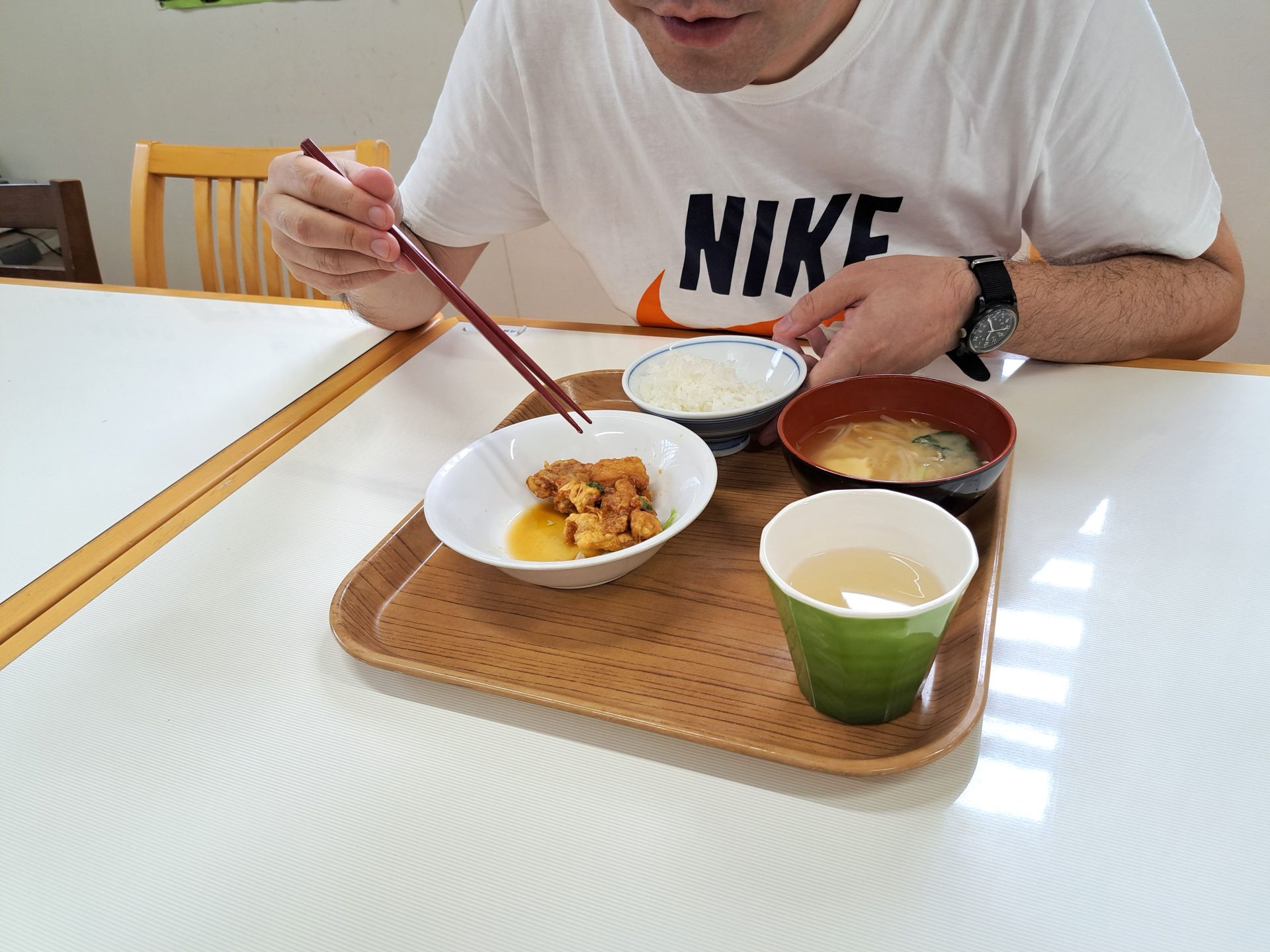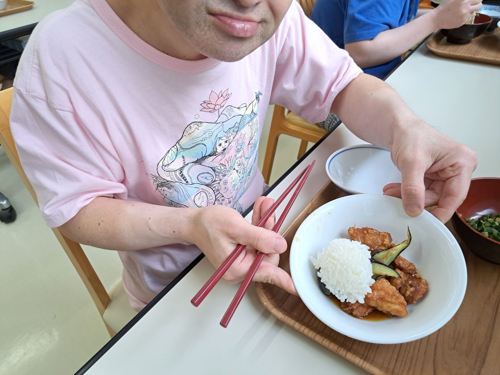 こちらは今日の給食~揚げナスと鳥肉の香味ソース♪酸っぱさでご飯進む~♪