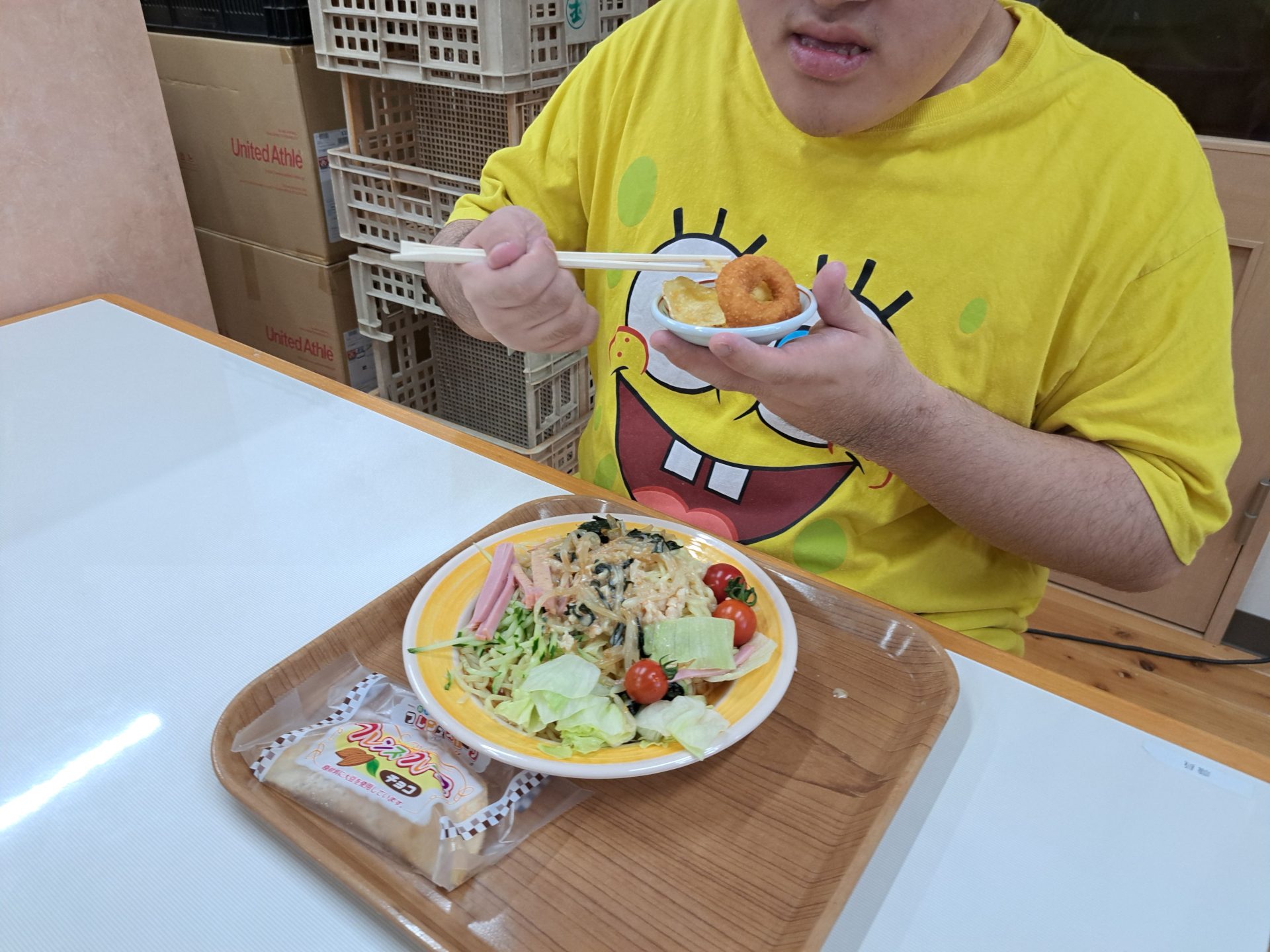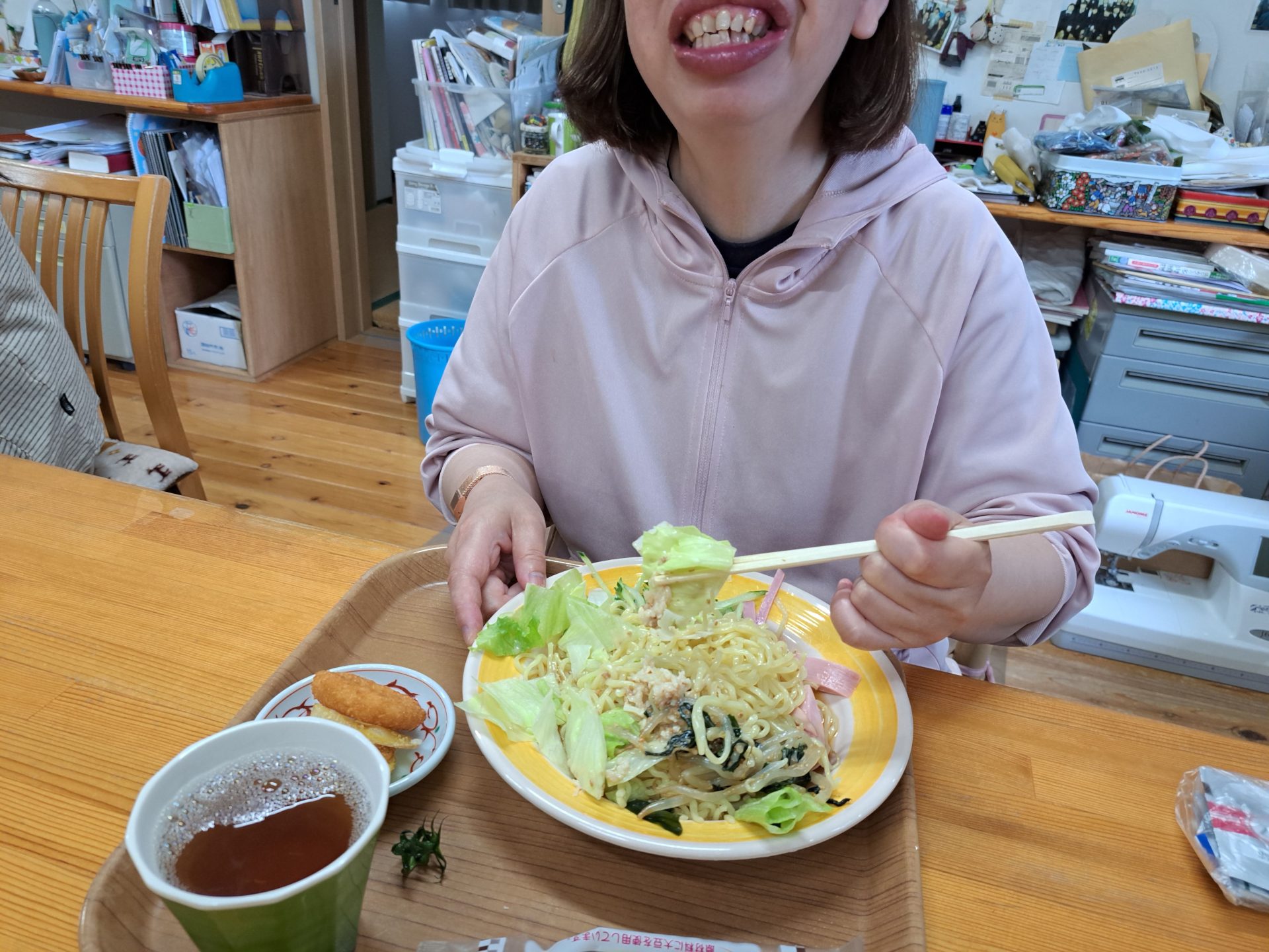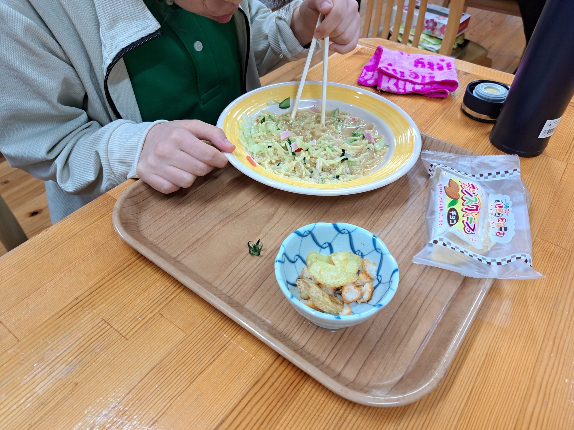 「うちはカニシュウマイ~チャプチェと混ぜご飯のおにぎり~最近ご飯あまり食べたくないからおにぎりにしちゃうよ~みそ汁も具なしとか~(笑)」