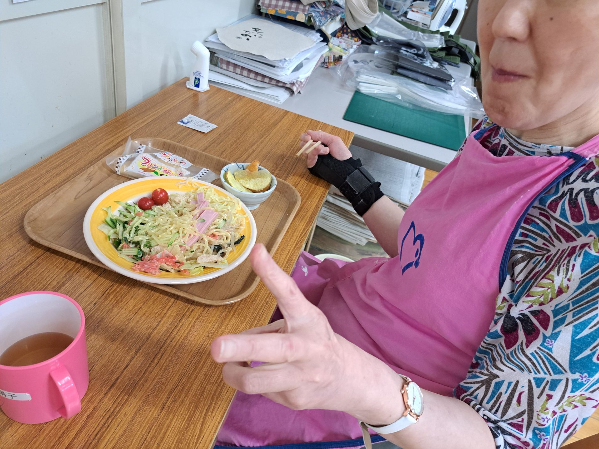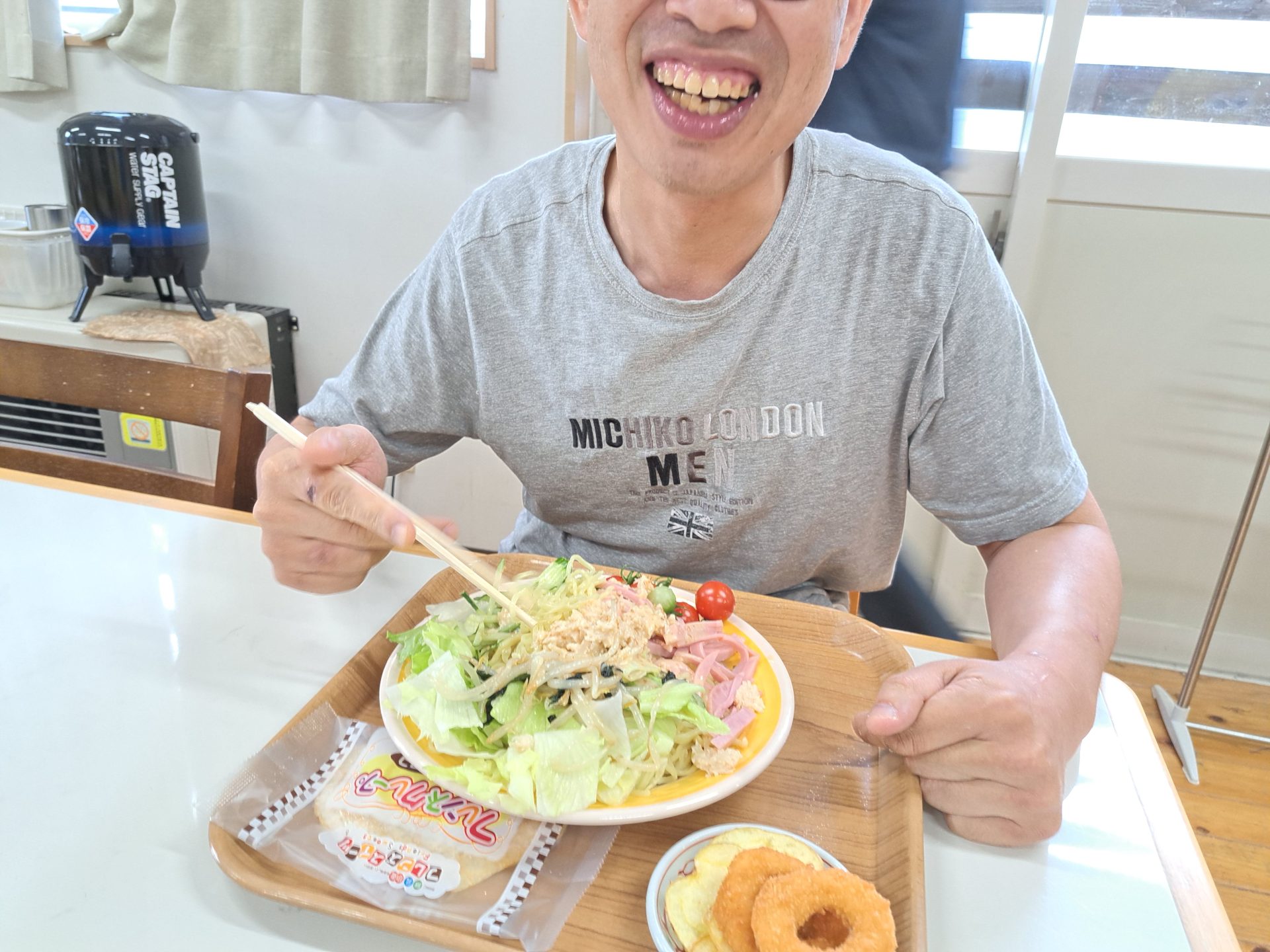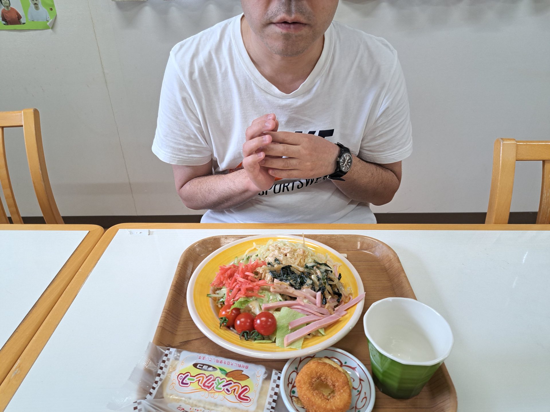 「うちはカニシュウマイ~チャプチェと混ぜご飯のおにぎり~最近ご飯あまり食べたくないからおにぎりにしちゃうよ~みそ汁も具なしとか~(笑)」