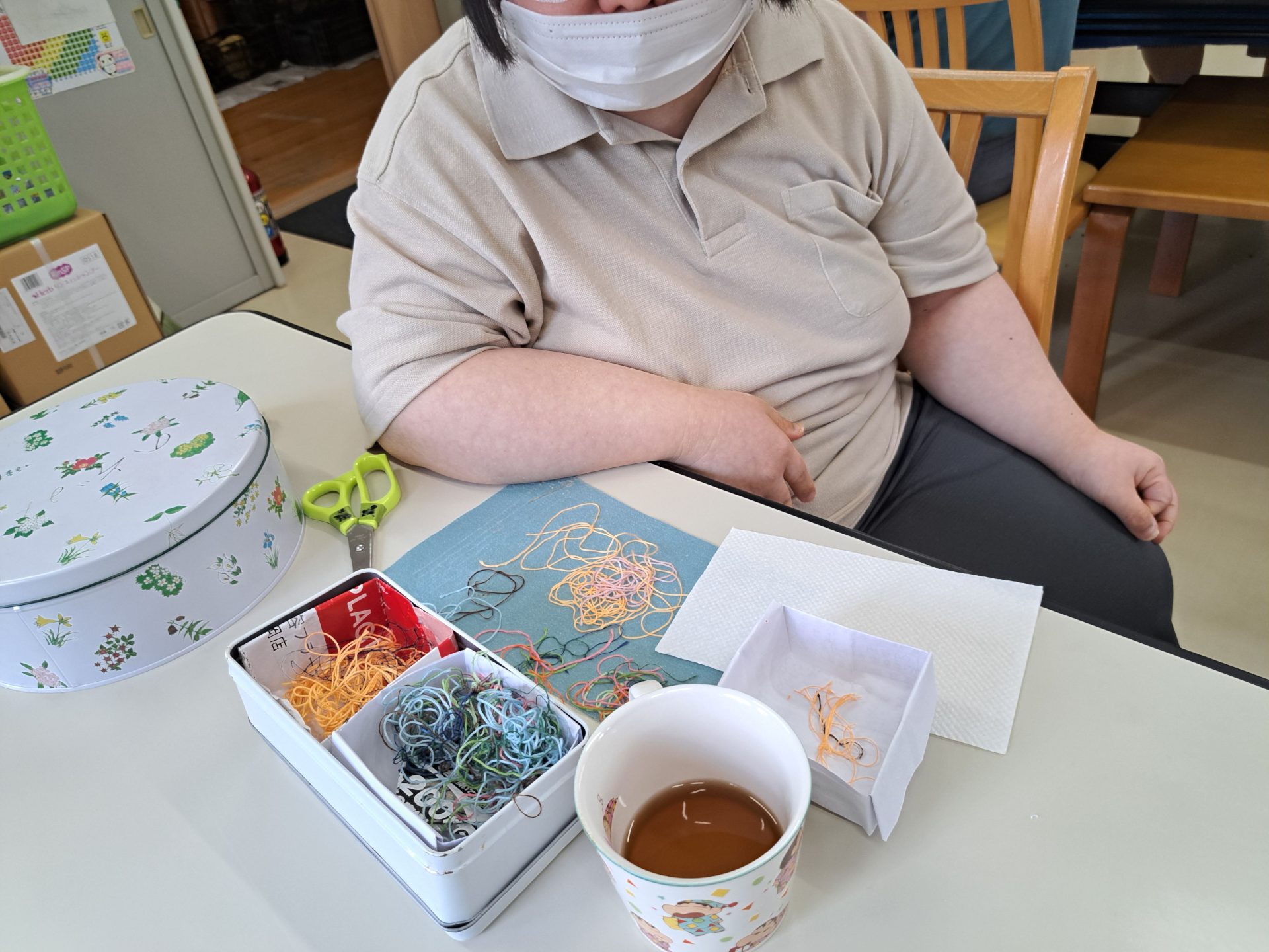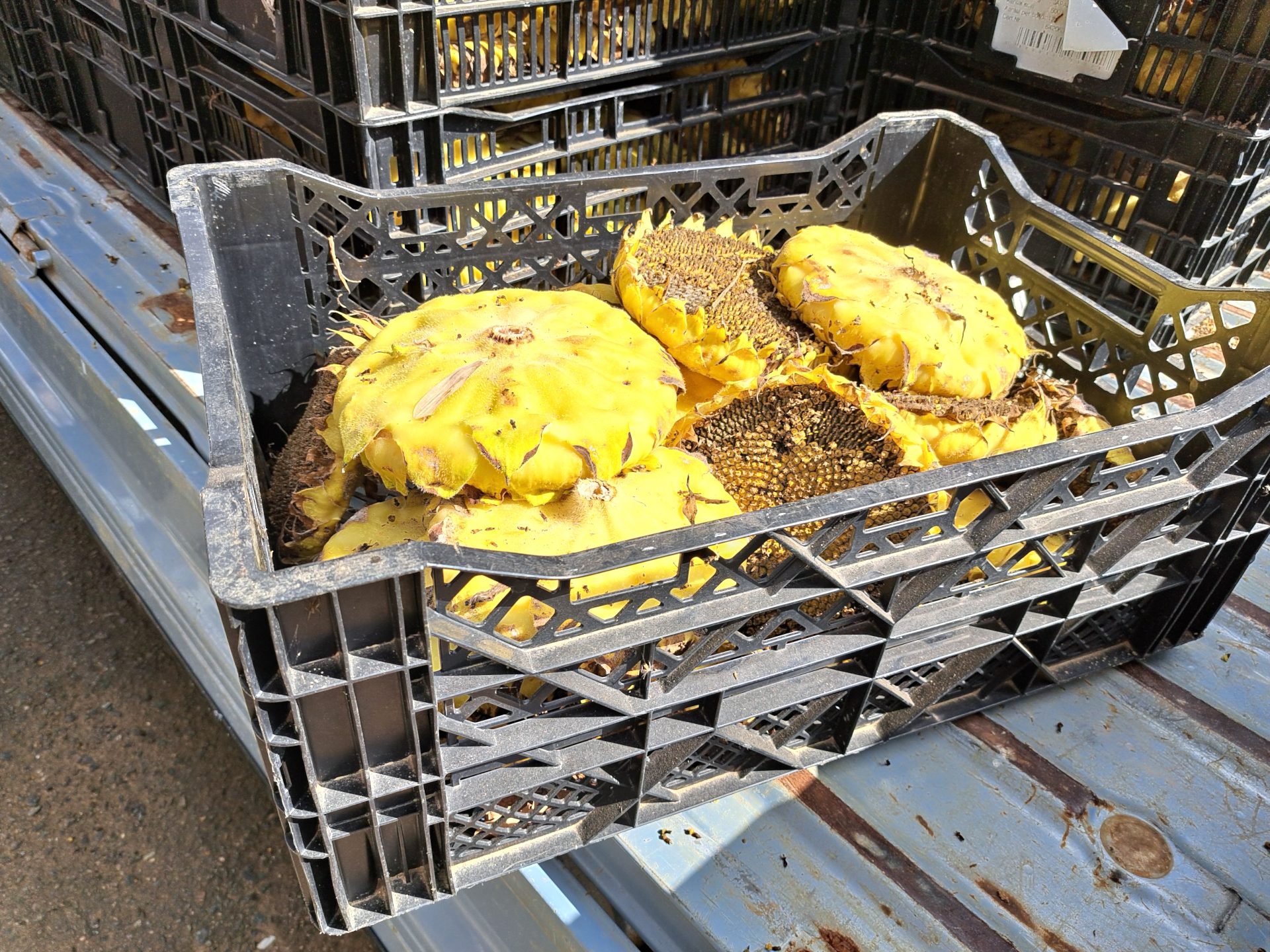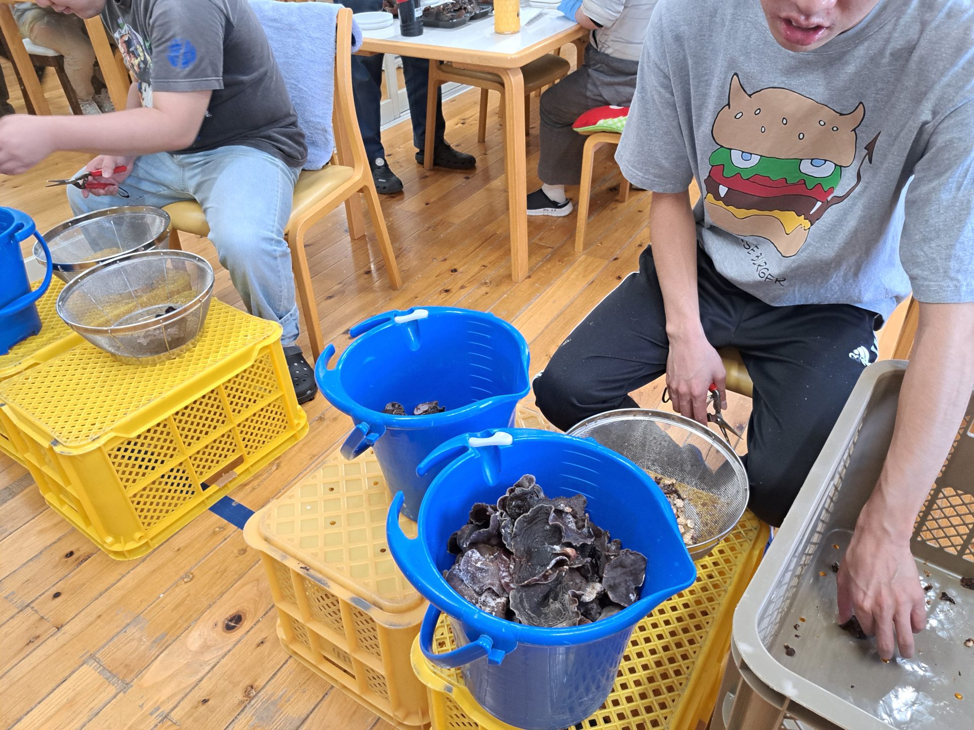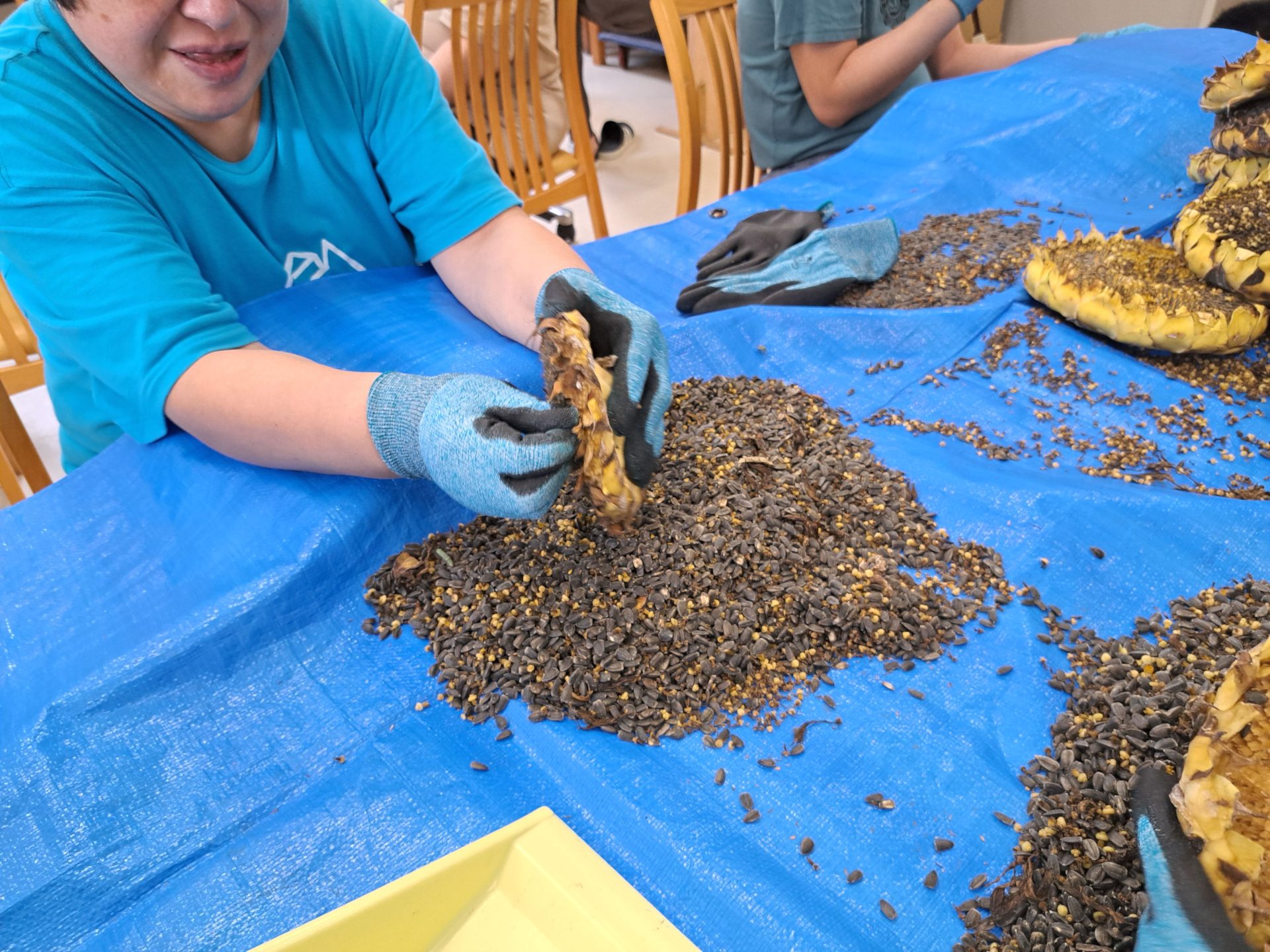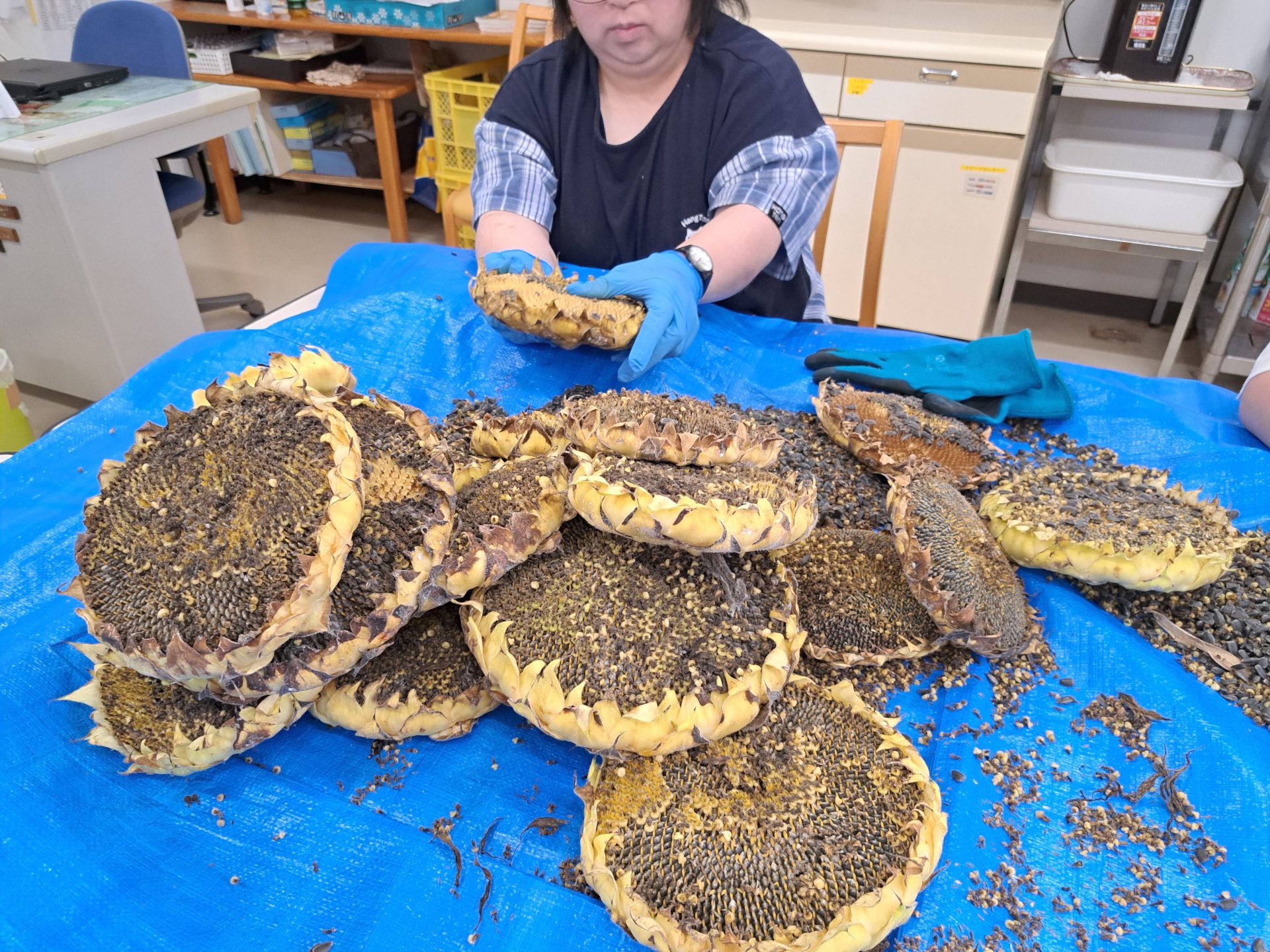 種をはずす作業はゴムの手袋をしてはいますが、力がいる作業なので手がつらくなるそうです…コンテナたくさんのお仕事ですが、最後までがんばろう!(*^-^*)