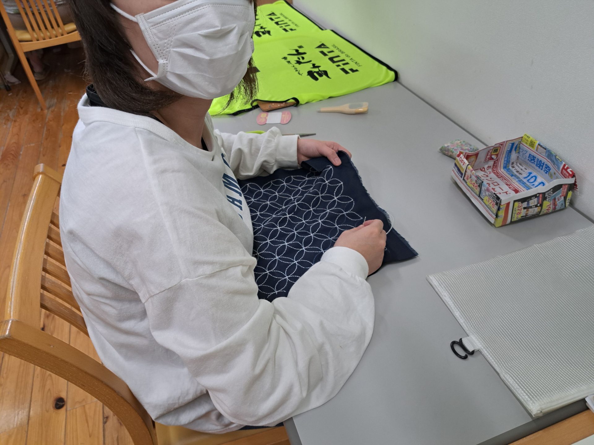 おもむろに立ち上がった利用者さん、「寒くなったからや~しまむらでこのベスト買ったなや~あったかいがらいいぜ~♪」