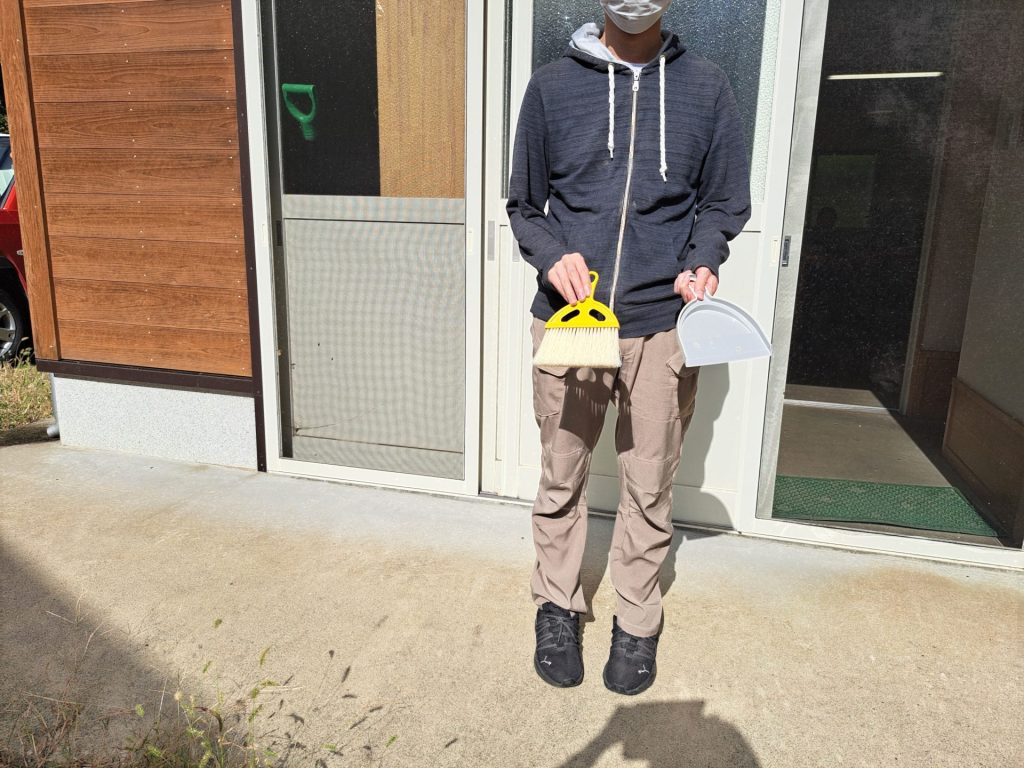 木工班の入口では、ちり取りとホウキでカメムシと戦う勇者が!(笑)