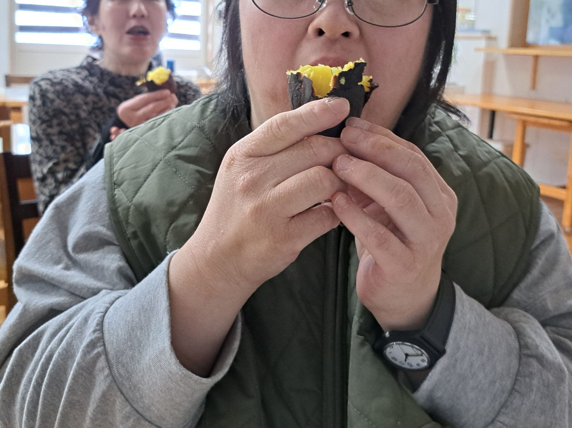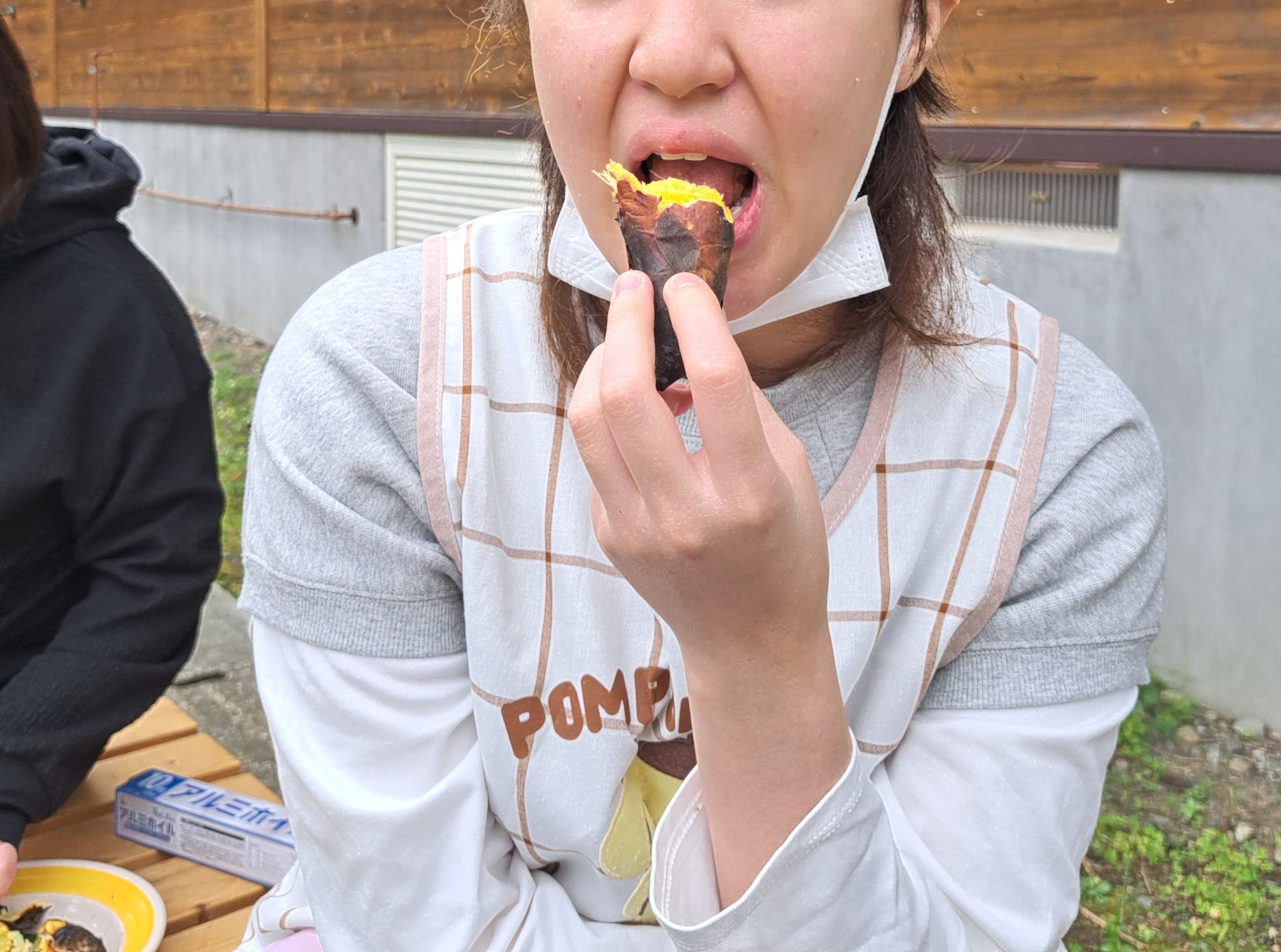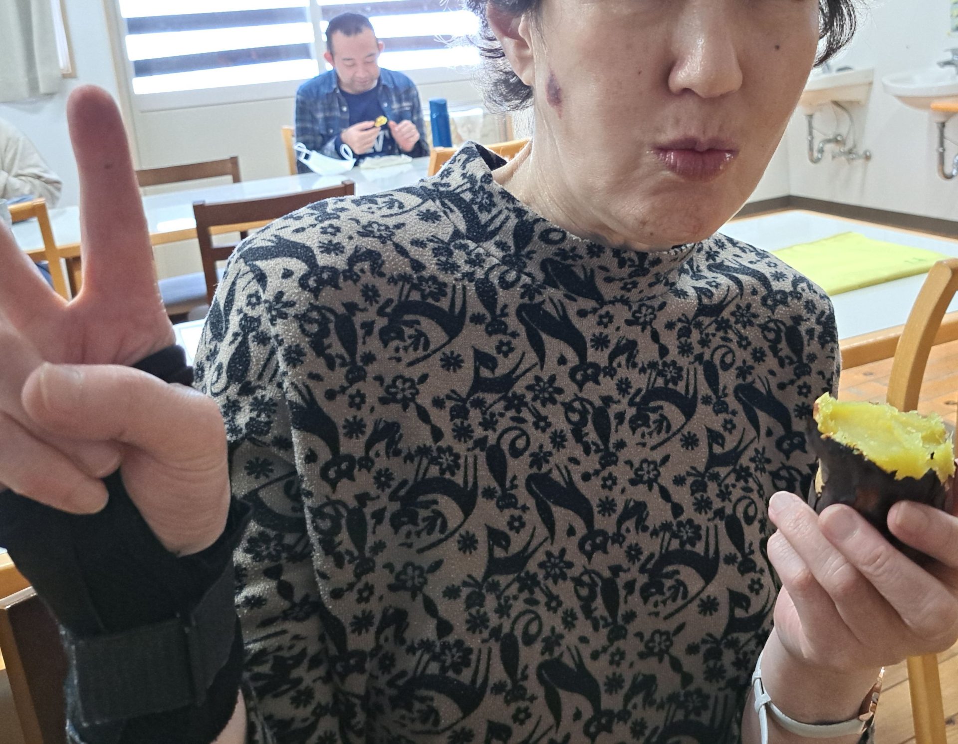 まずは一番火のそばで見守っていた利用者さんがパクリ♪「うーーーん!おいしいです!!」