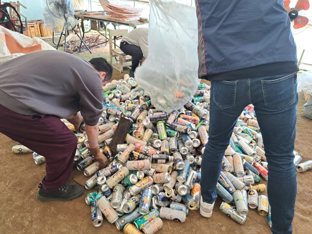 木工班は隣のハウスで空き缶つぶし~いっぱい回収できて嬉しい♪