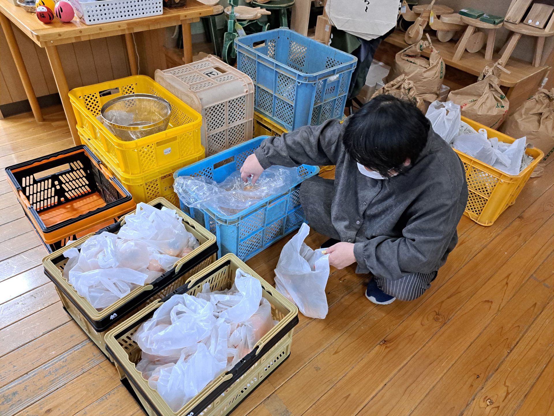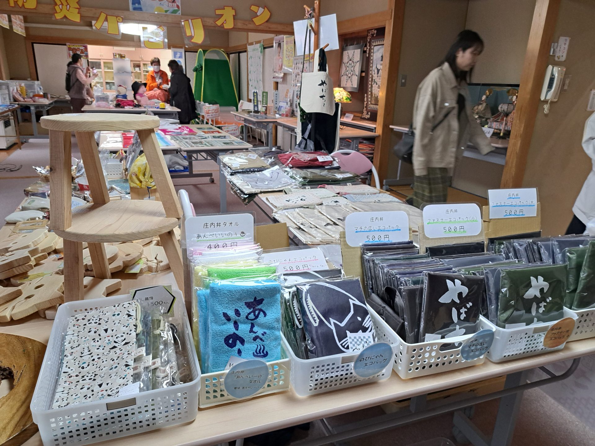 おかげさまで、野菜は完売~!朝採りの生しいたけはあっという間に完売~♪庄内弁のバックや巾着、新作のビニールのポーチもお客様に好評でした~♪