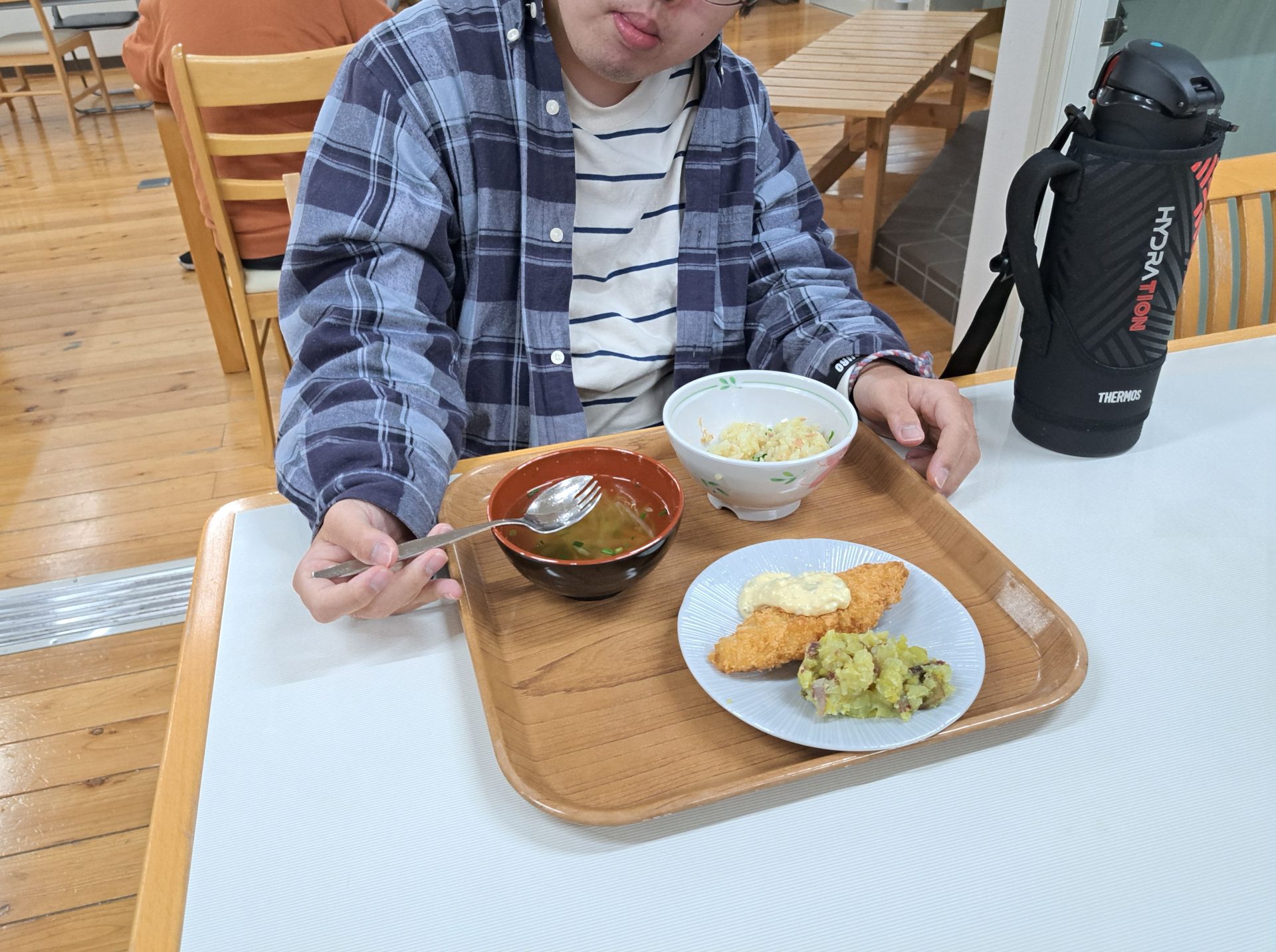 今日はシーチキンピラフと、白身魚タルタルソールかけと、さくらが丘のかぼちゃのサラダです~おいしそう♪