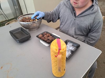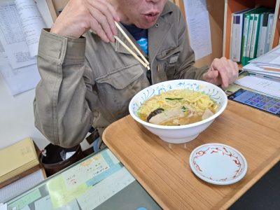 まだまだ袋切り作業続いているんですね~!そんな時に昨日の夕食インタビュー♪「え~と…、お茶漬けとおでんです!」