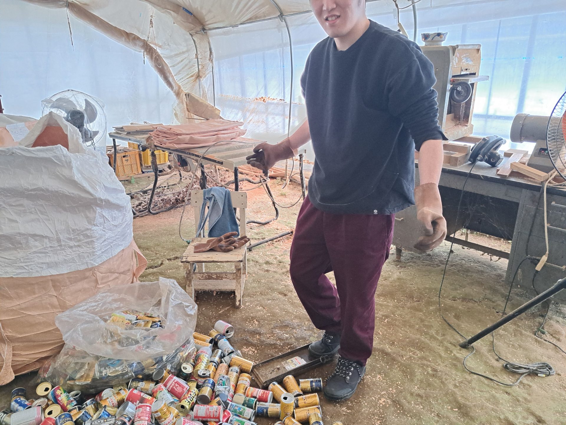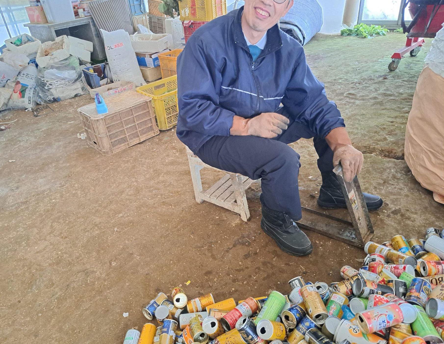ハウスはストーブ焚いて空き缶つぶし~暖かい~(*^-^*)