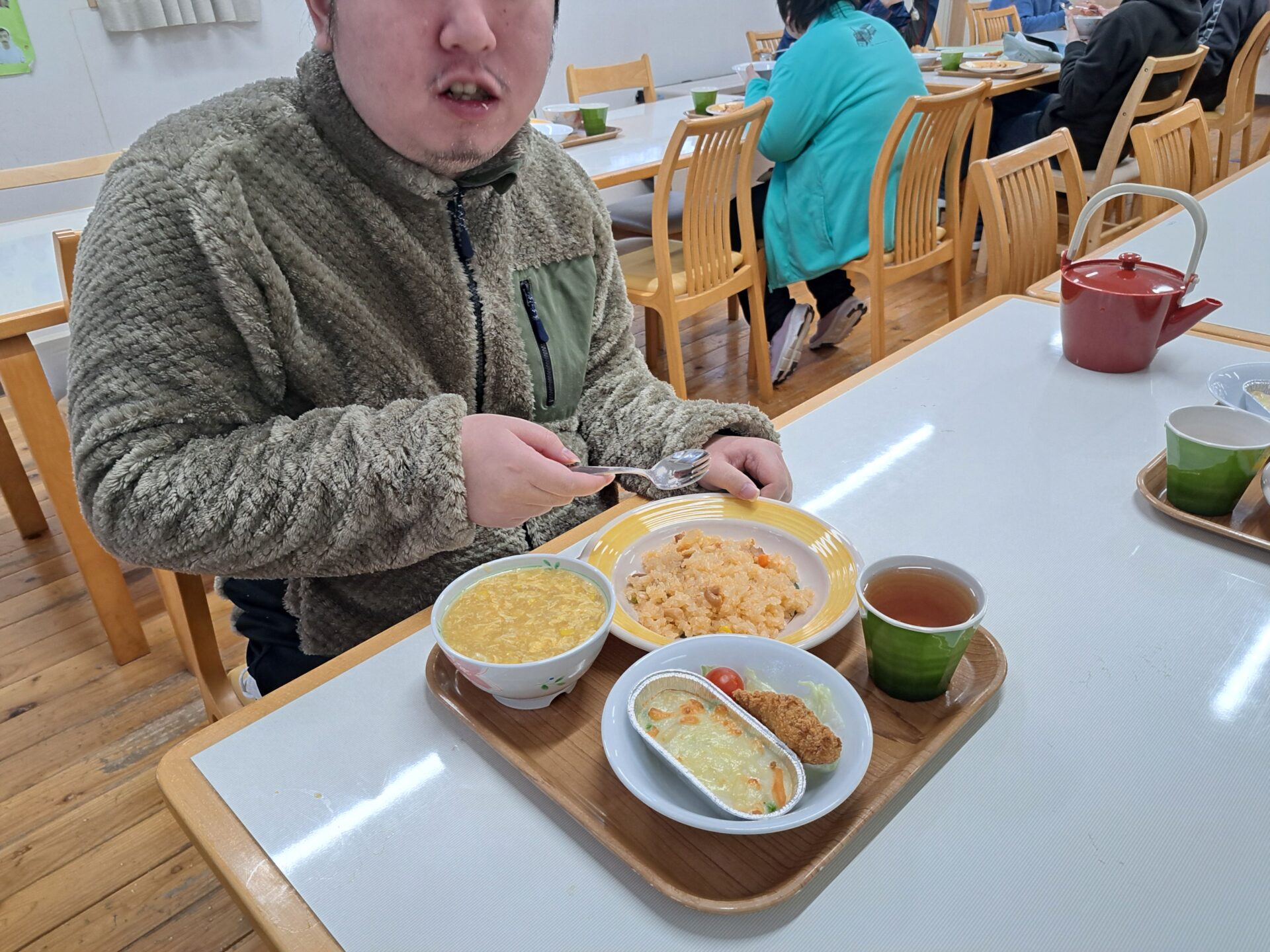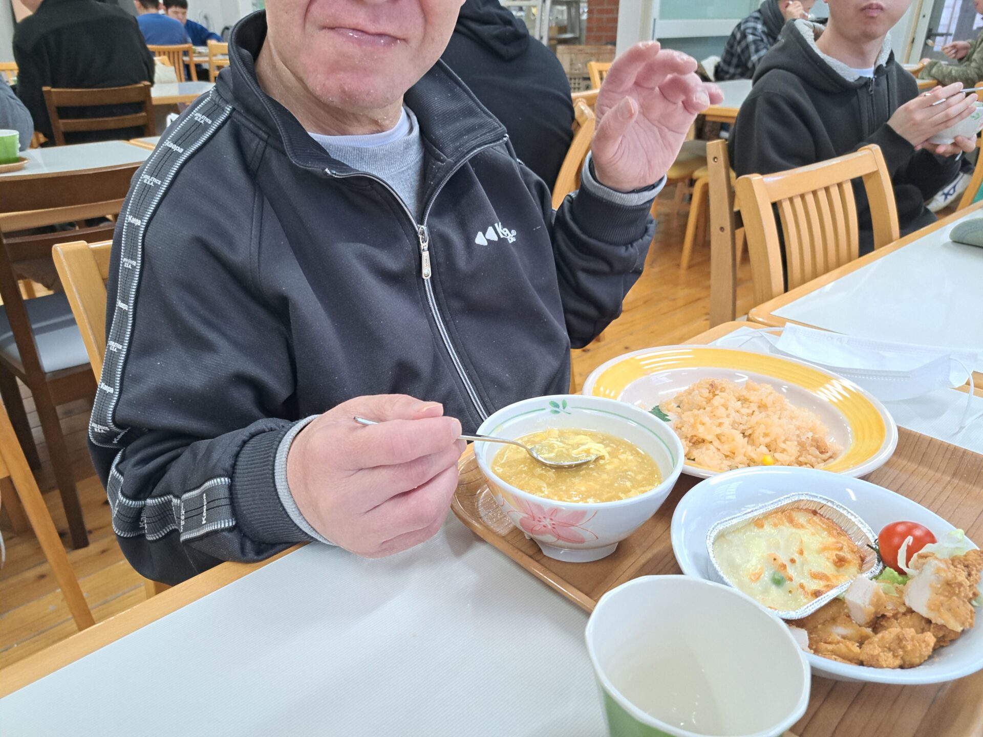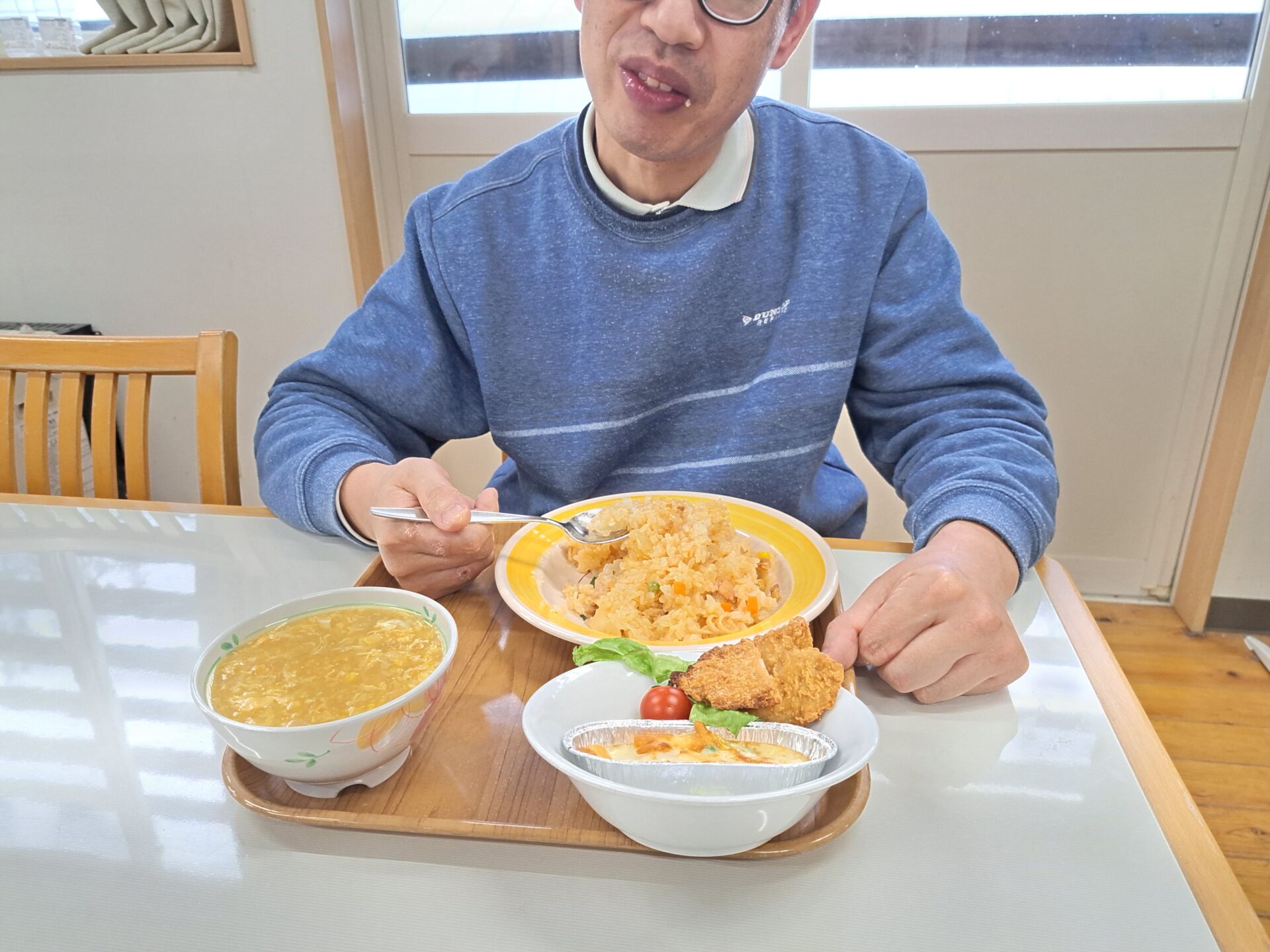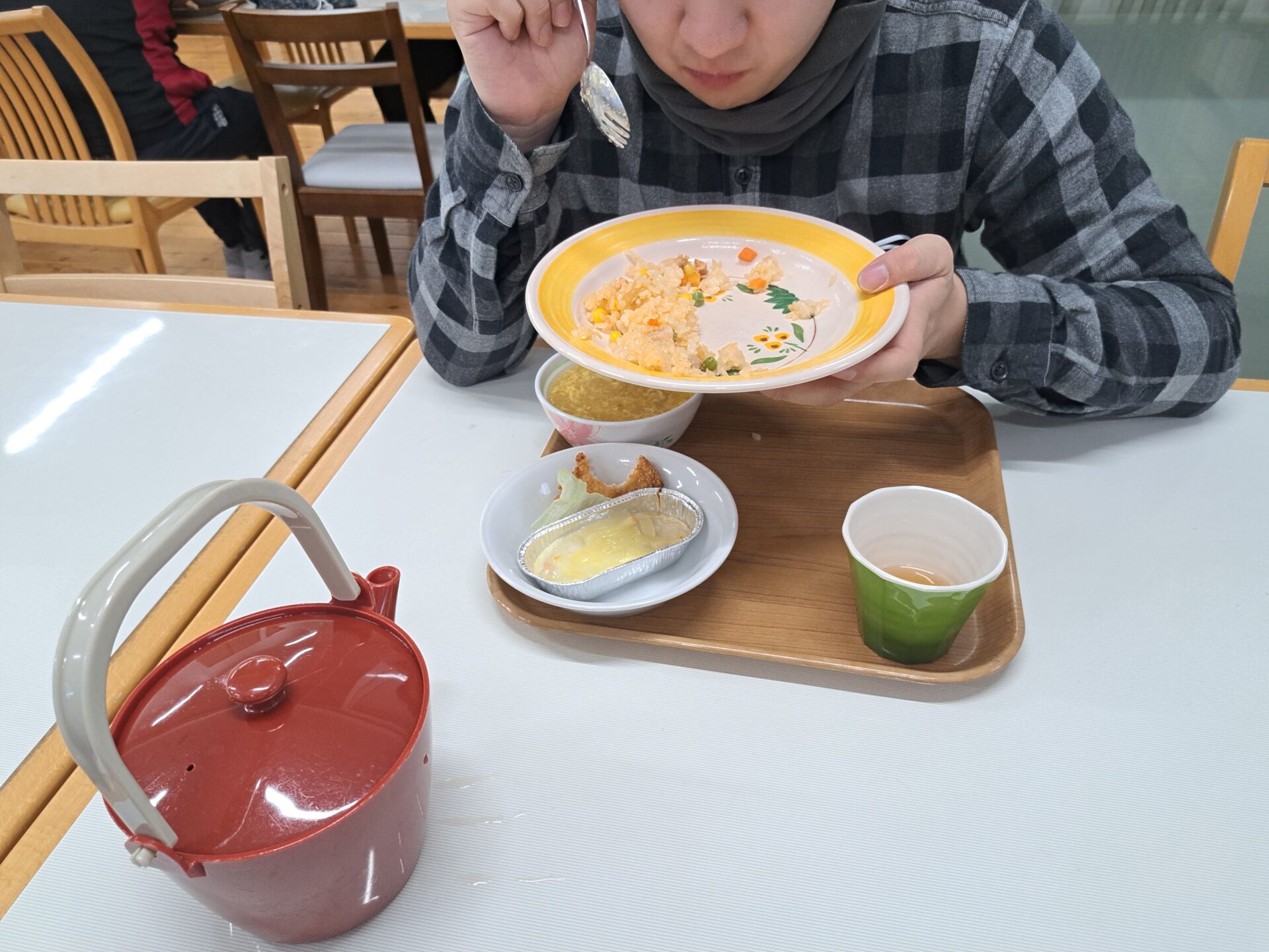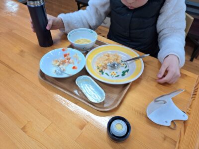 - 「ご飯と玉子焼きとキャベツ、ヨーグルト、お湯です!」