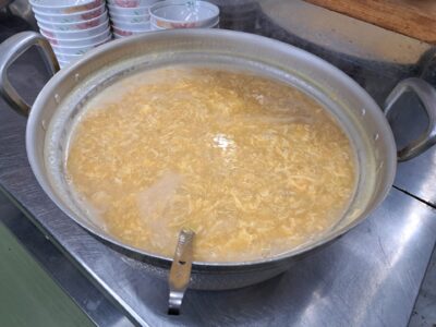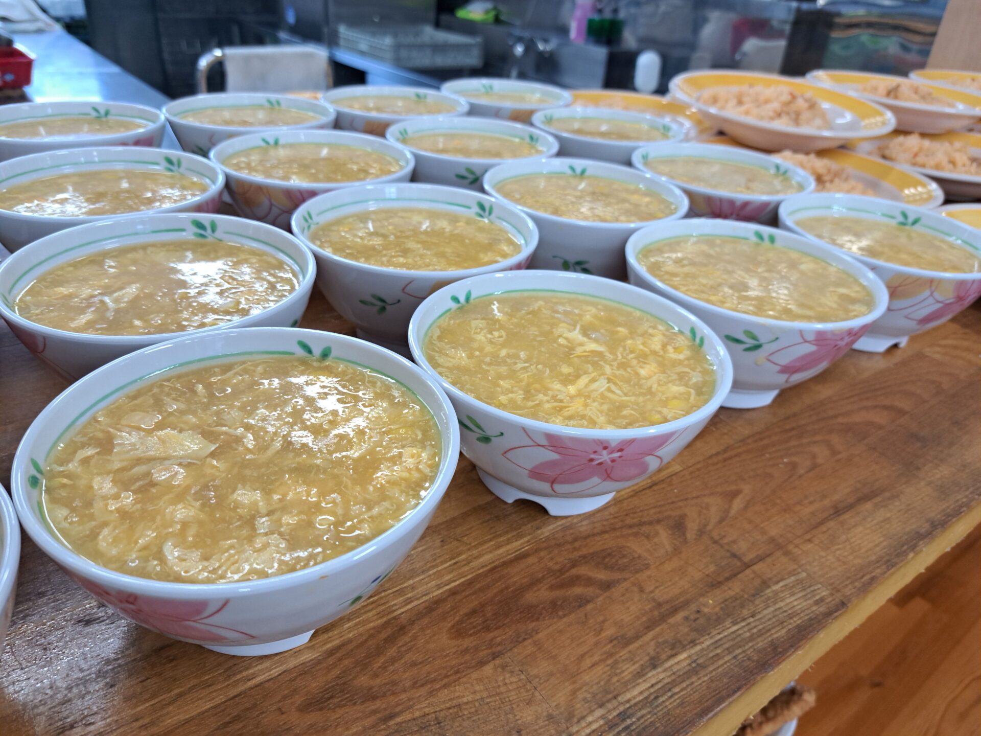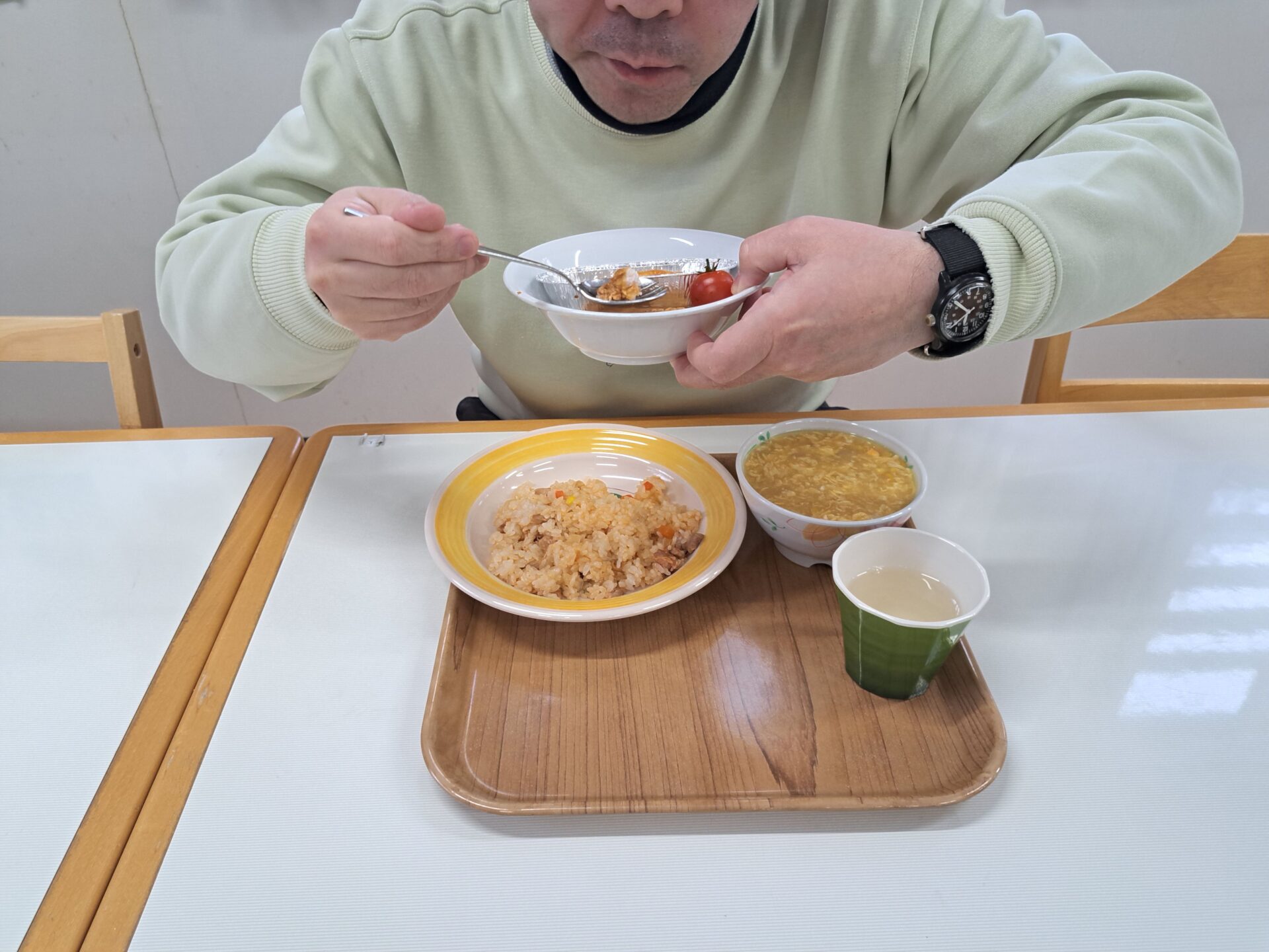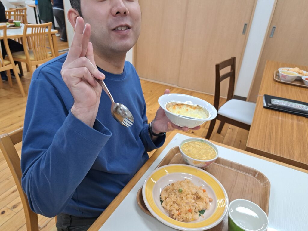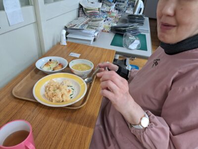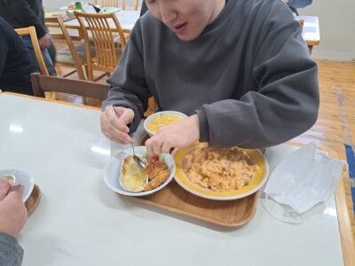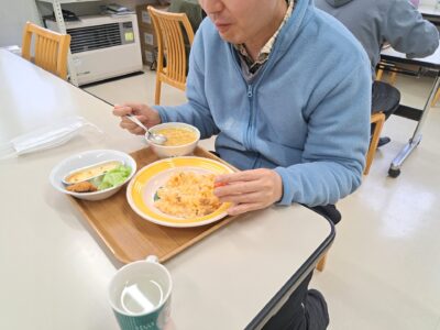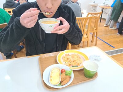 - 「ご飯と玉子焼きとキャベツ、ヨーグルト、お湯です!」