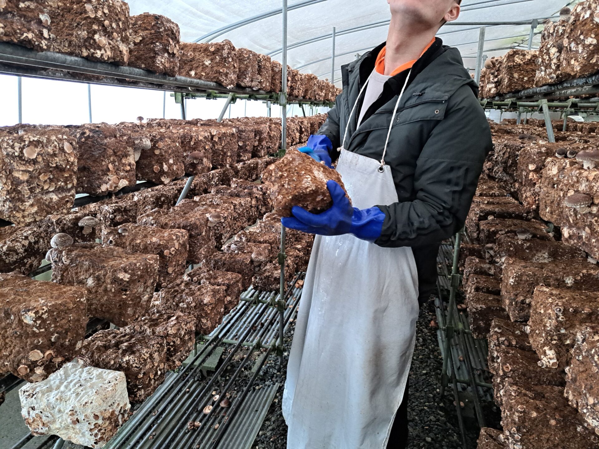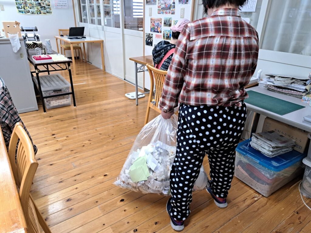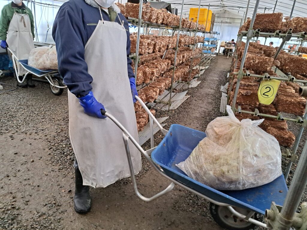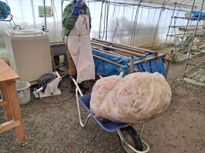 さてさてハウスでは今日は片付け作業でした~菌床の入っていた袋ですね~