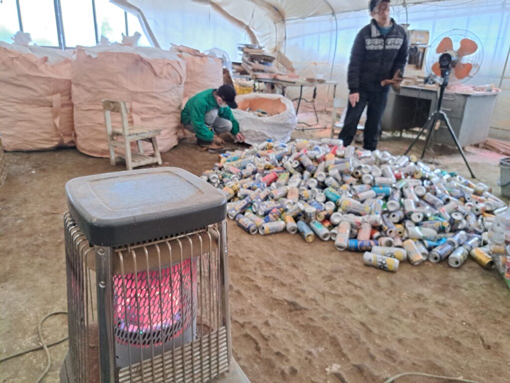 反対のハウスではストーブをつけて空き缶つぶし作業~あ!私も家から持ってきた空き缶車につけっぱなしだ!