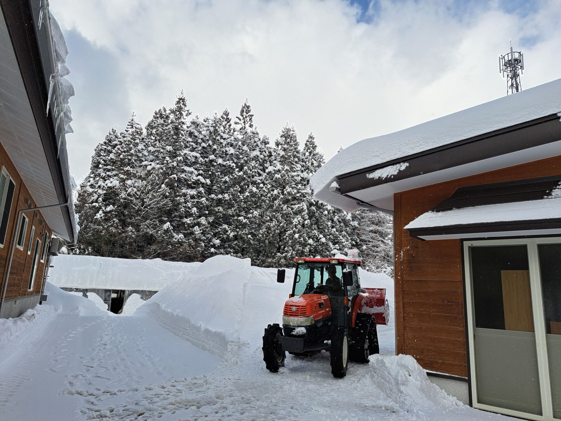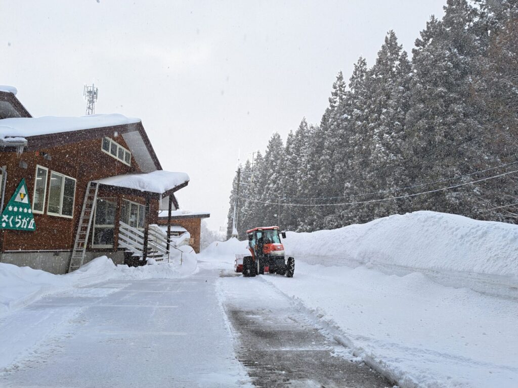 - ハウス脇の雪山からニヤニヤしながらトラクターで出てきた施設長?」