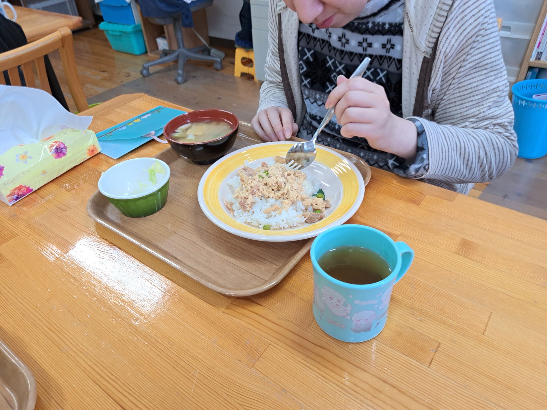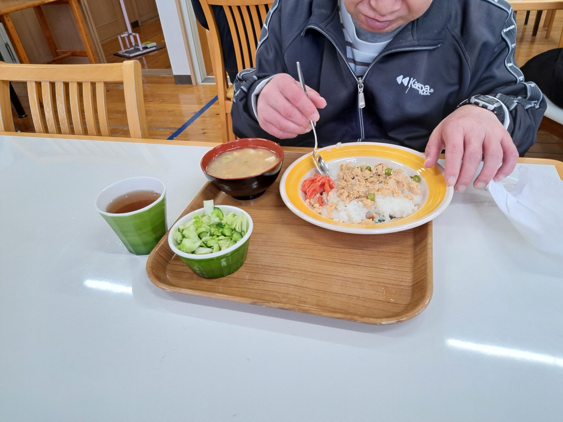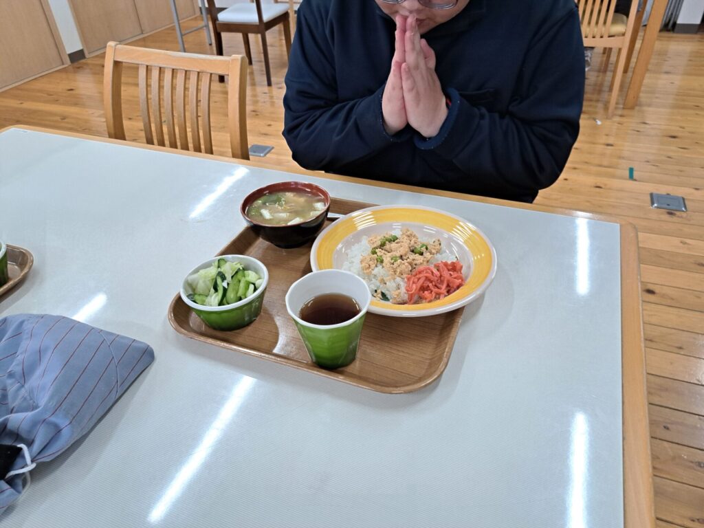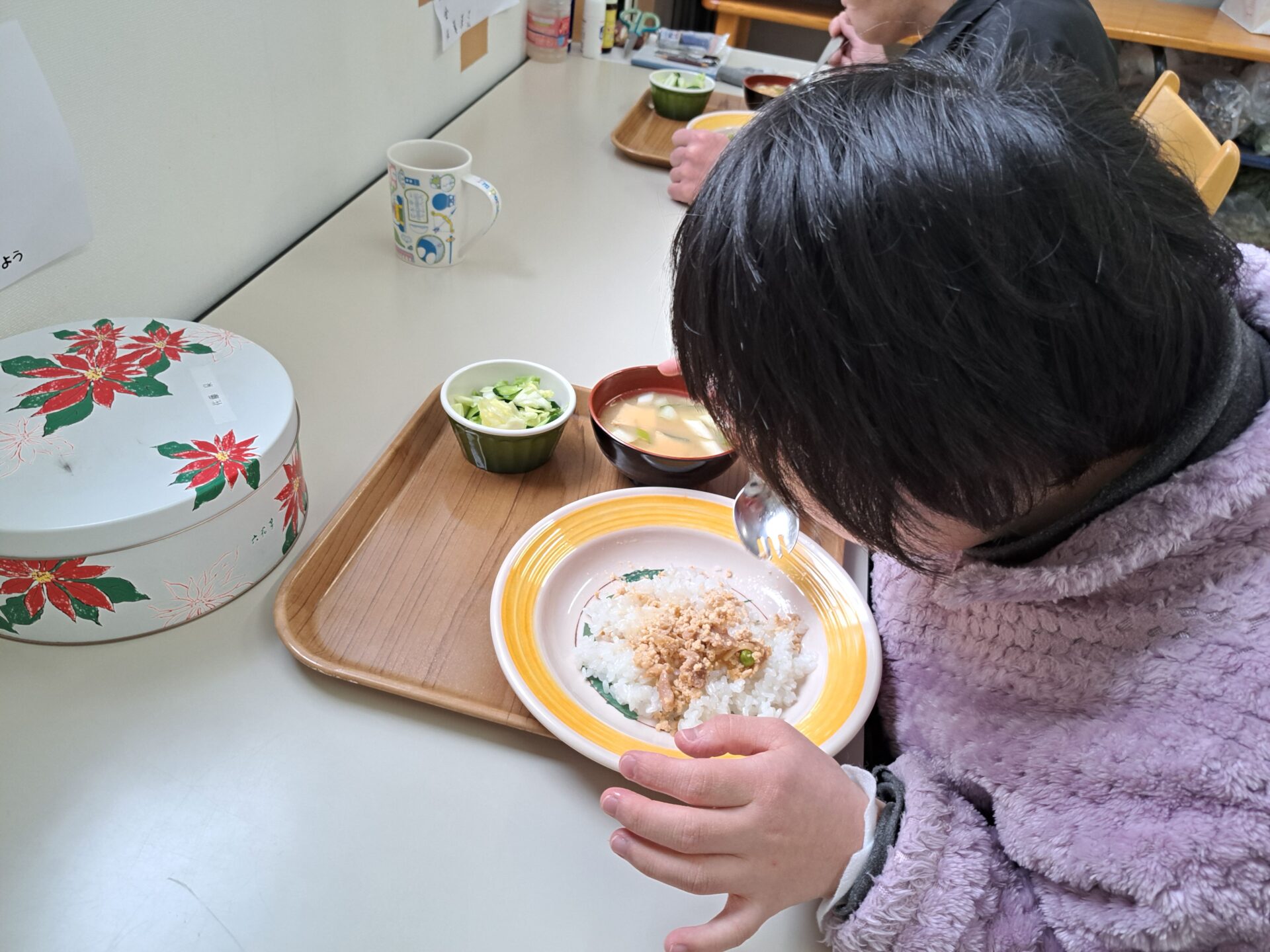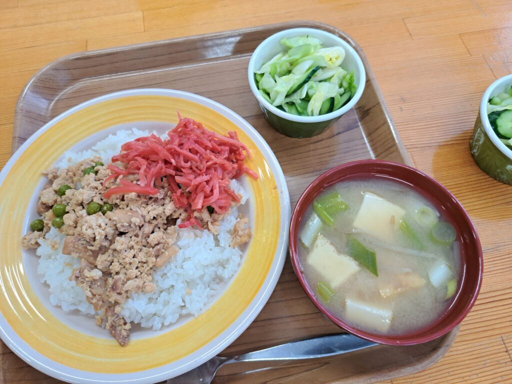 あっという間に給食の時間~今日は鶏肉そぼろご飯と浅漬けとあさり汁~浅漬けたっぷり嬉しい♪