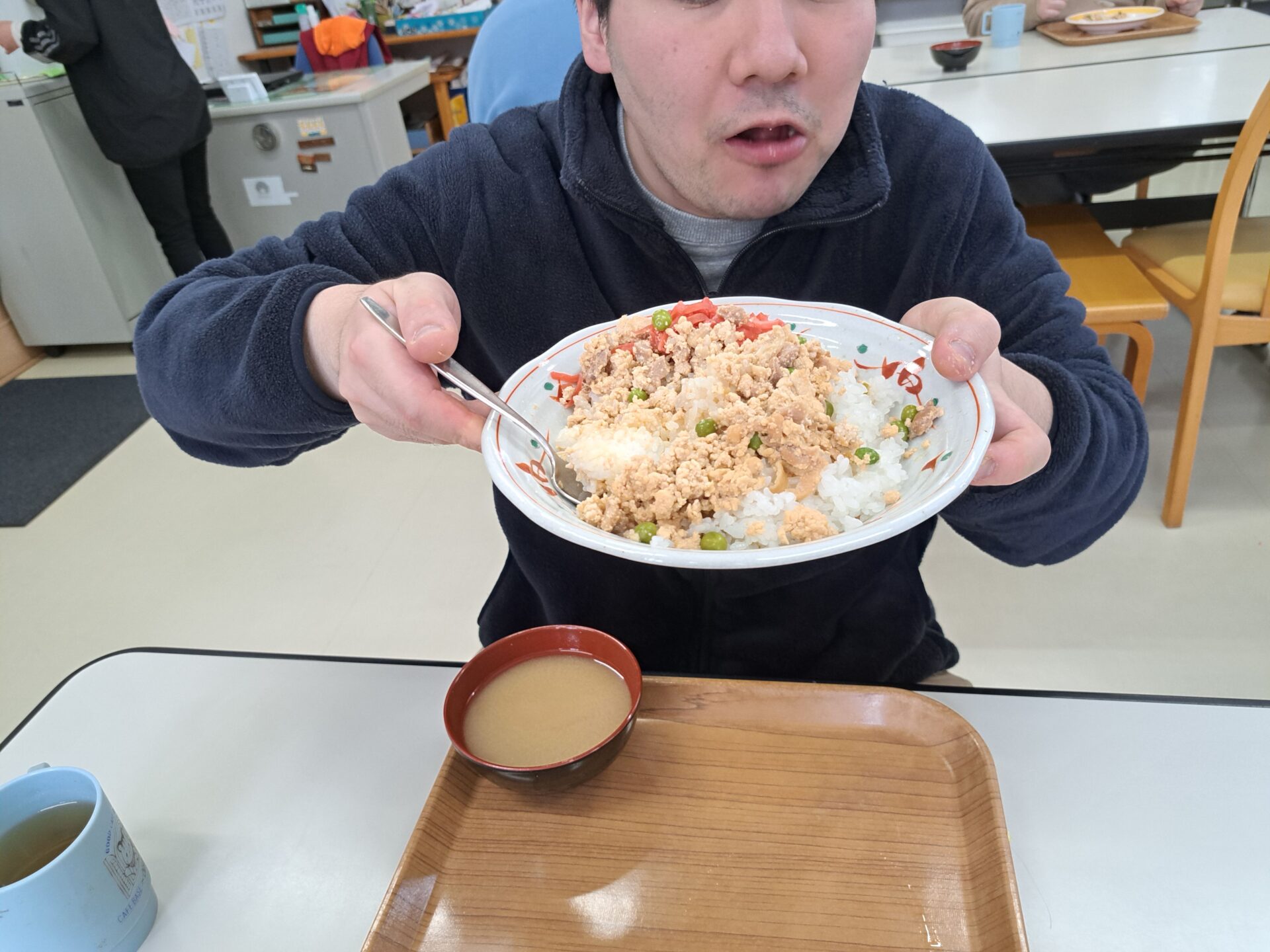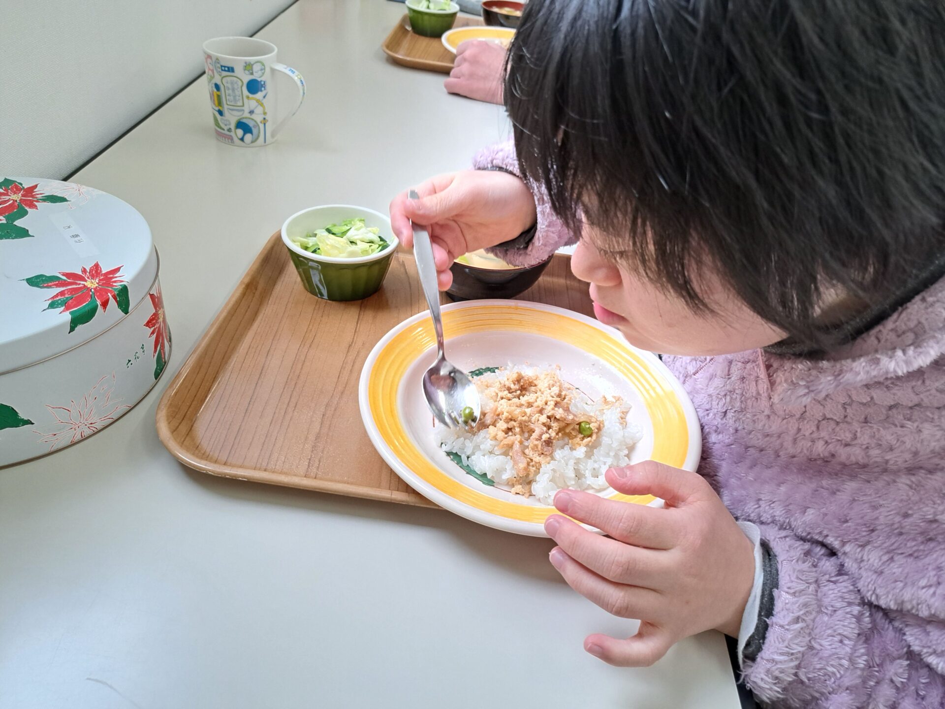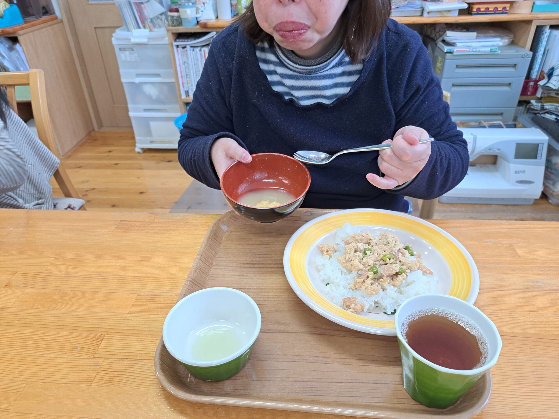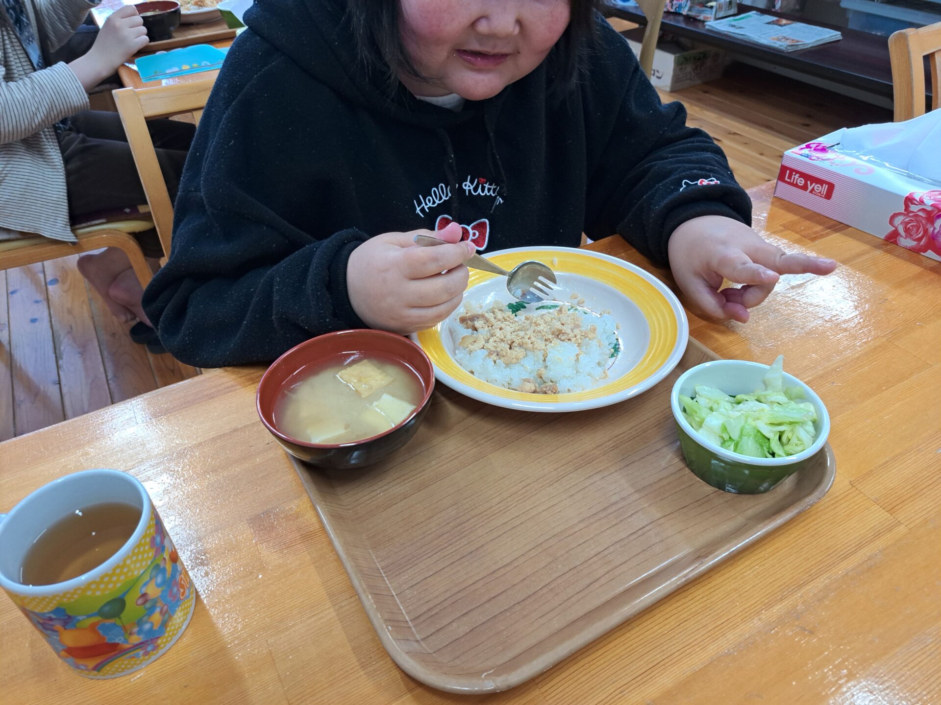 あっという間に給食の時間~今日は鶏肉そぼろご飯と浅漬けとあさり汁~浅漬けたっぷり嬉しい♪