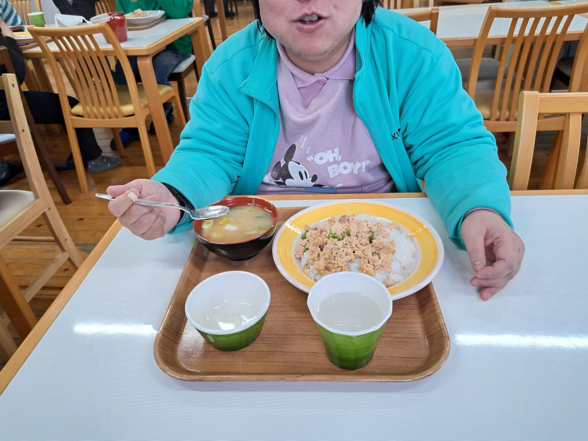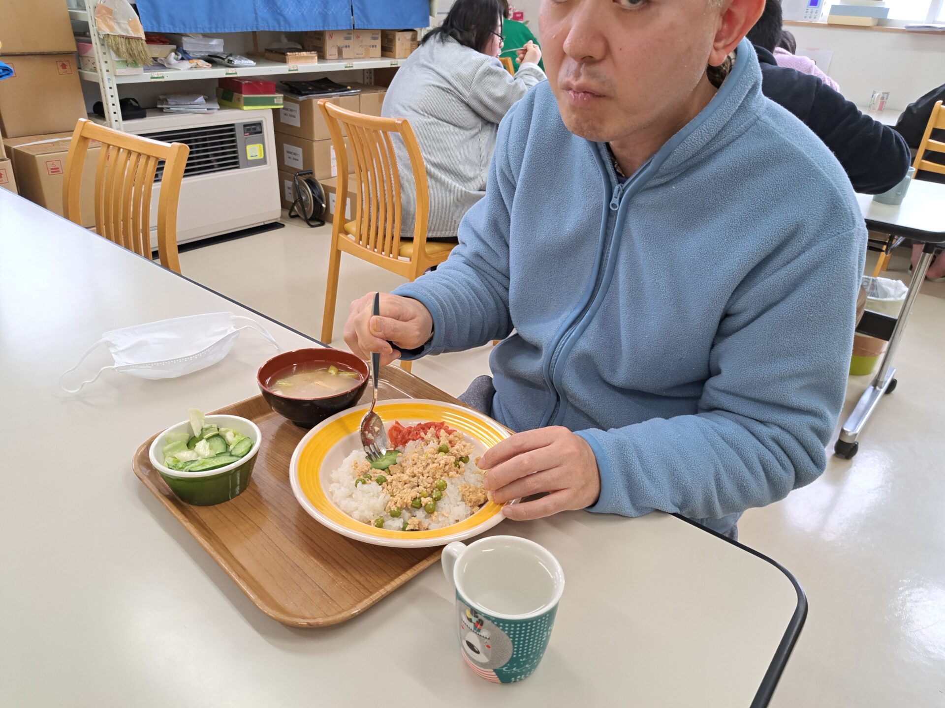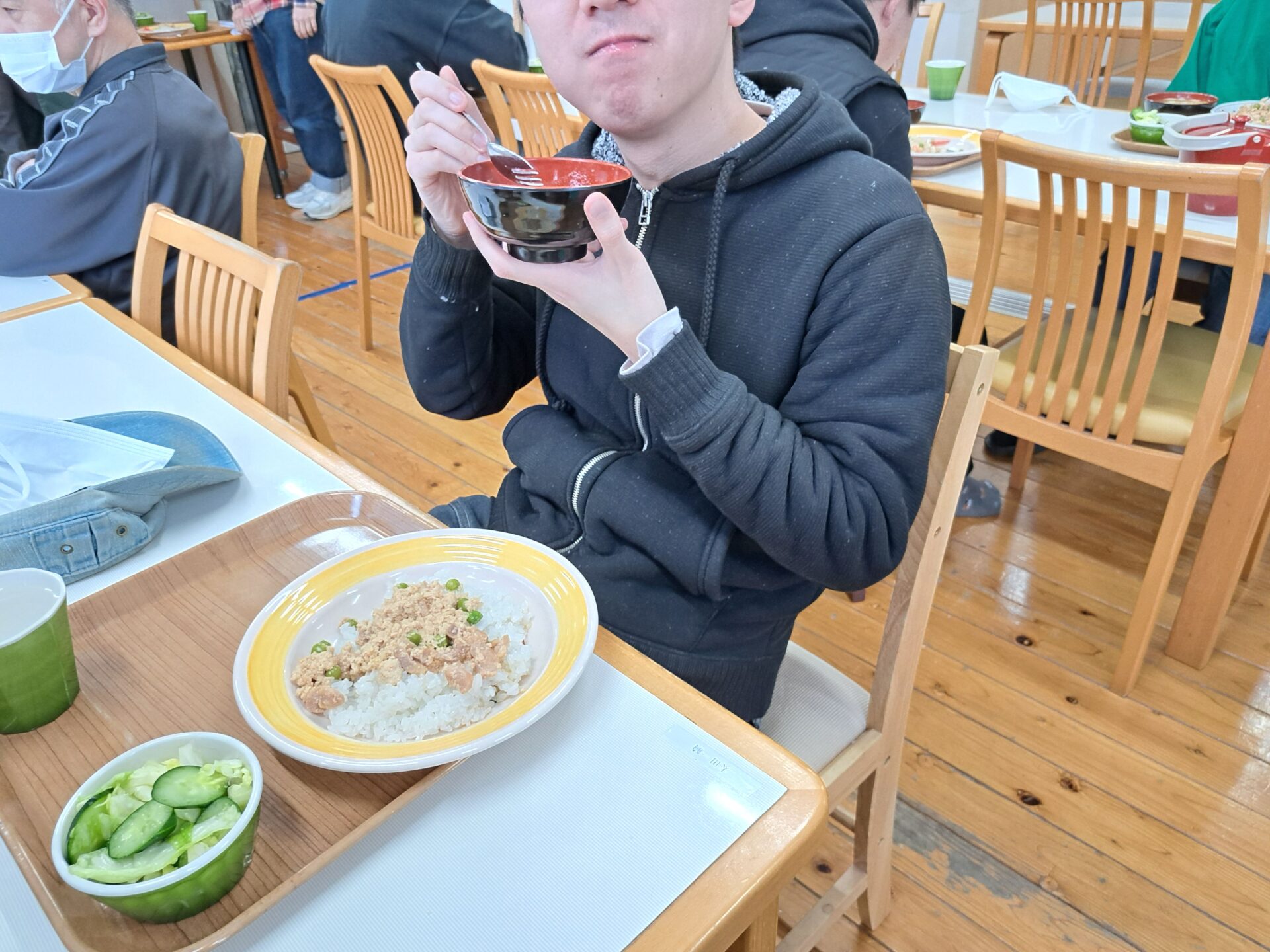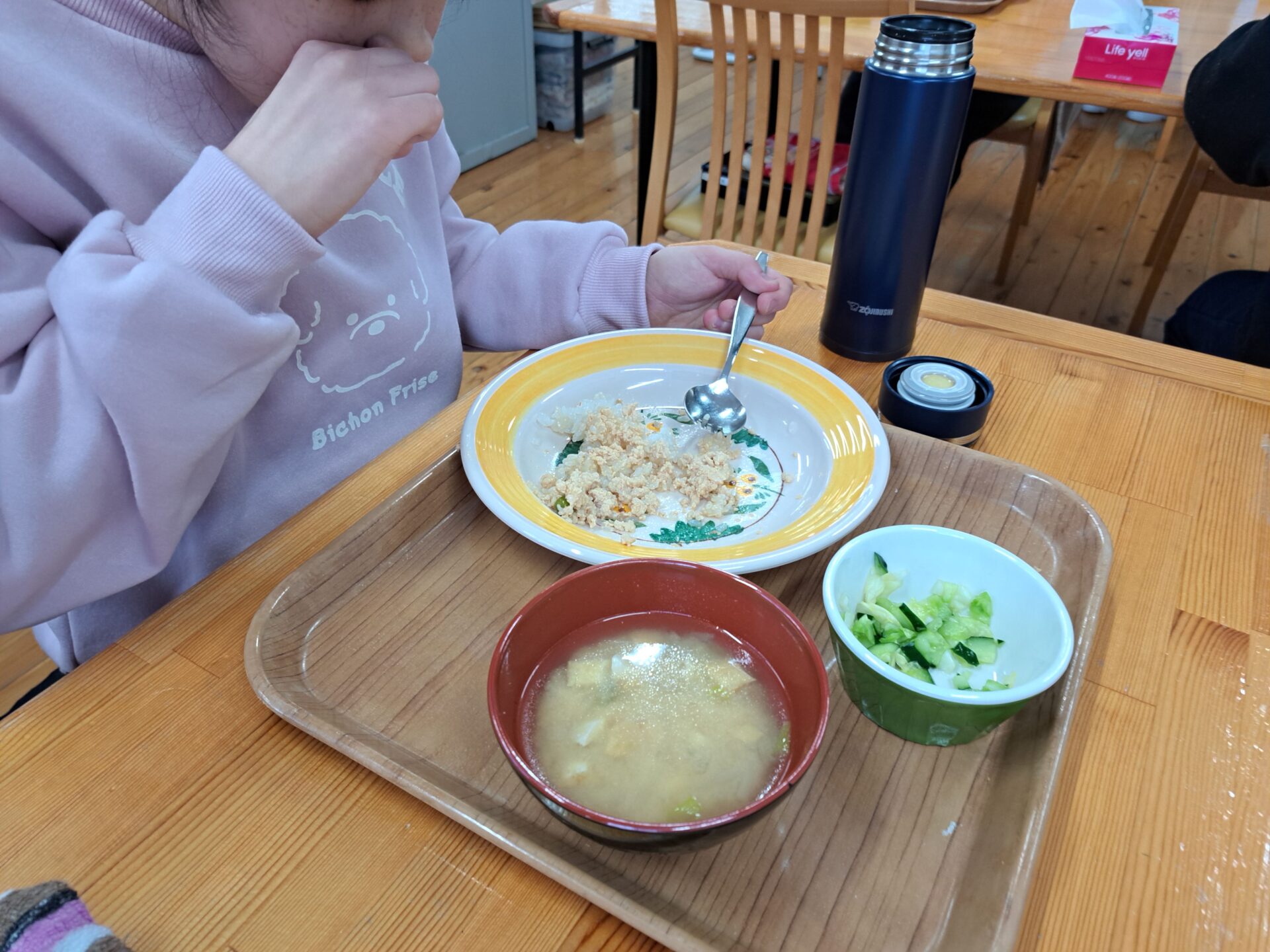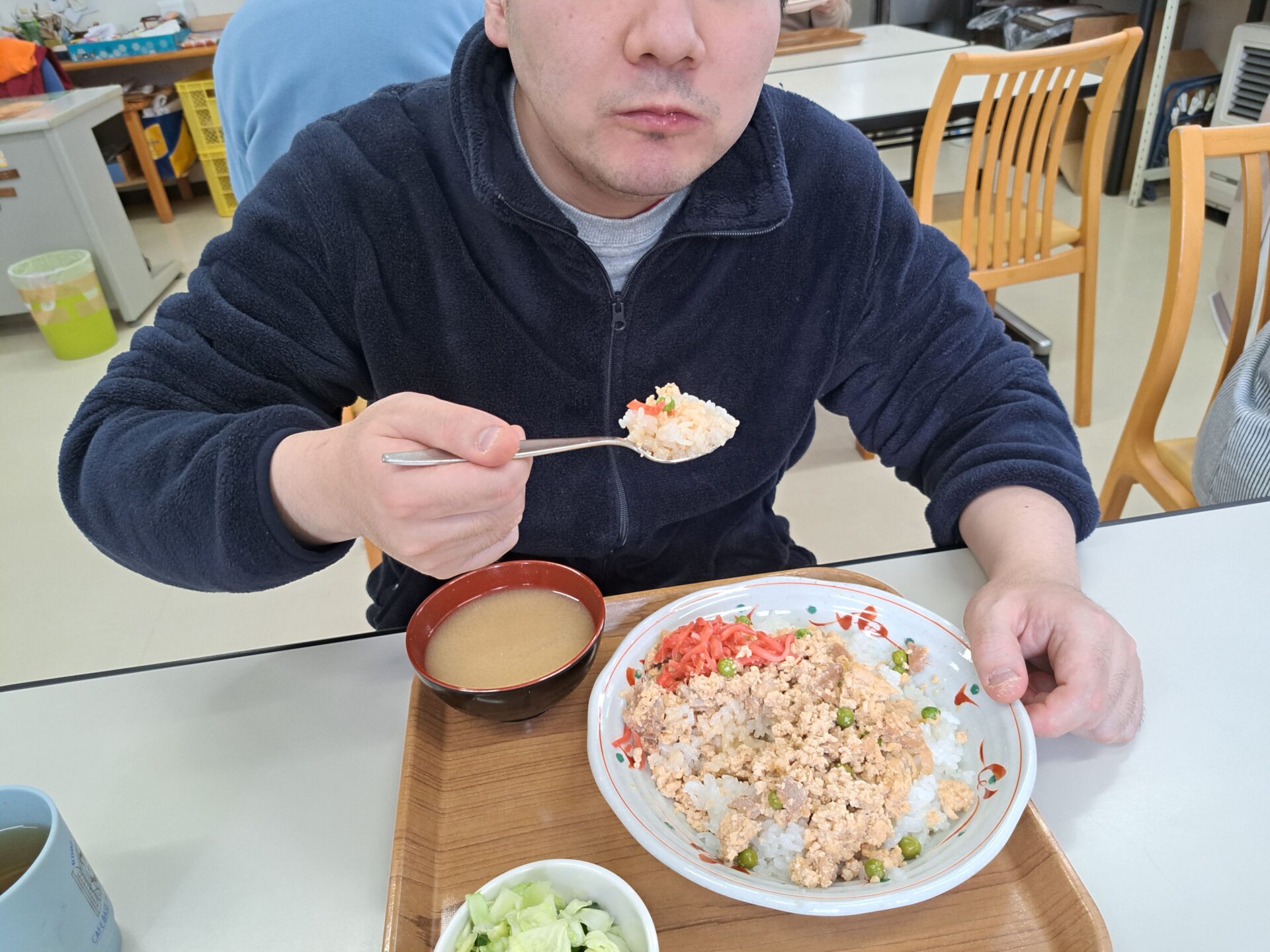 あっという間に給食の時間~今日は鶏肉そぼろご飯と浅漬けとあさり汁~浅漬けたっぷり嬉しい♪