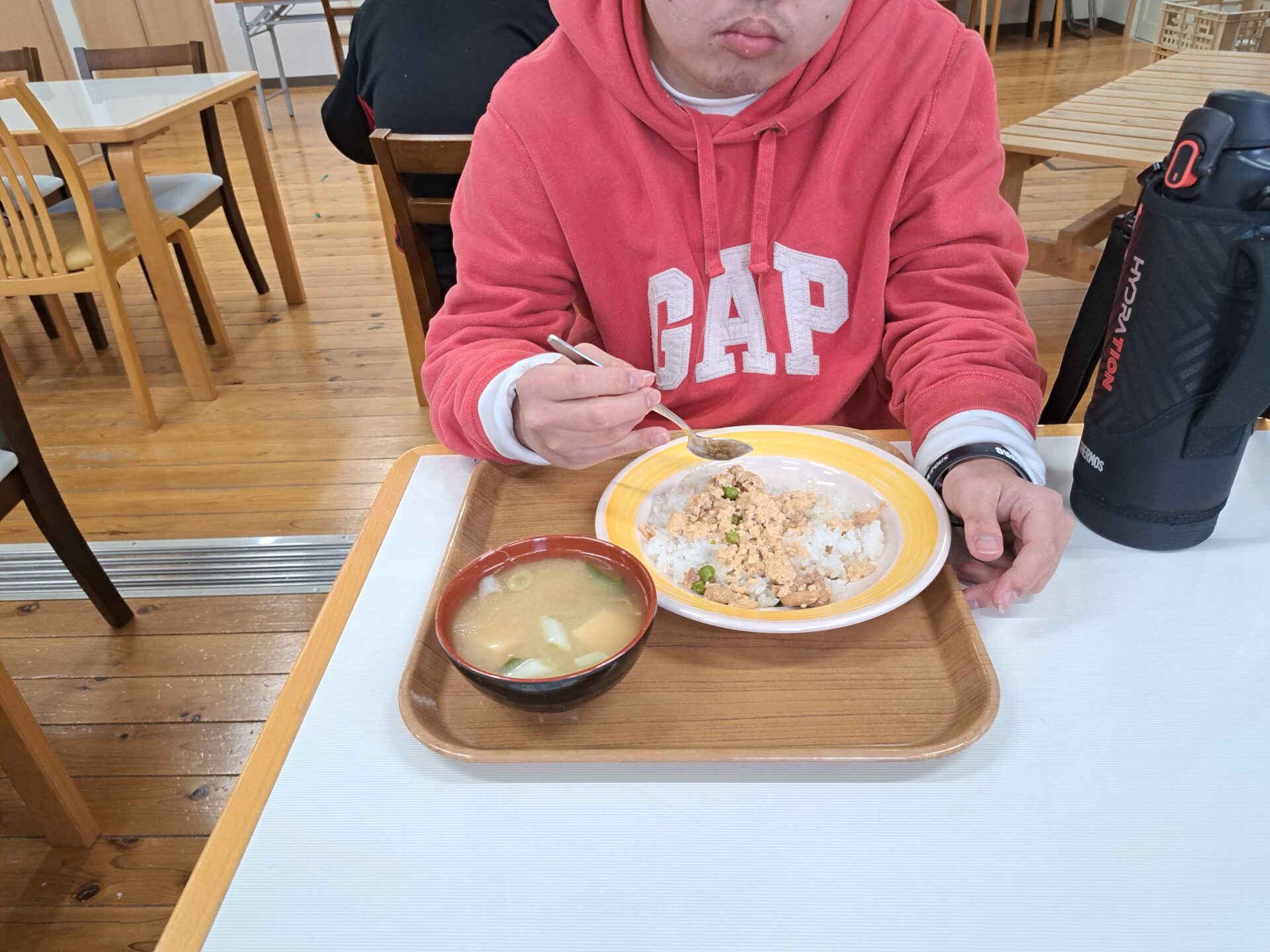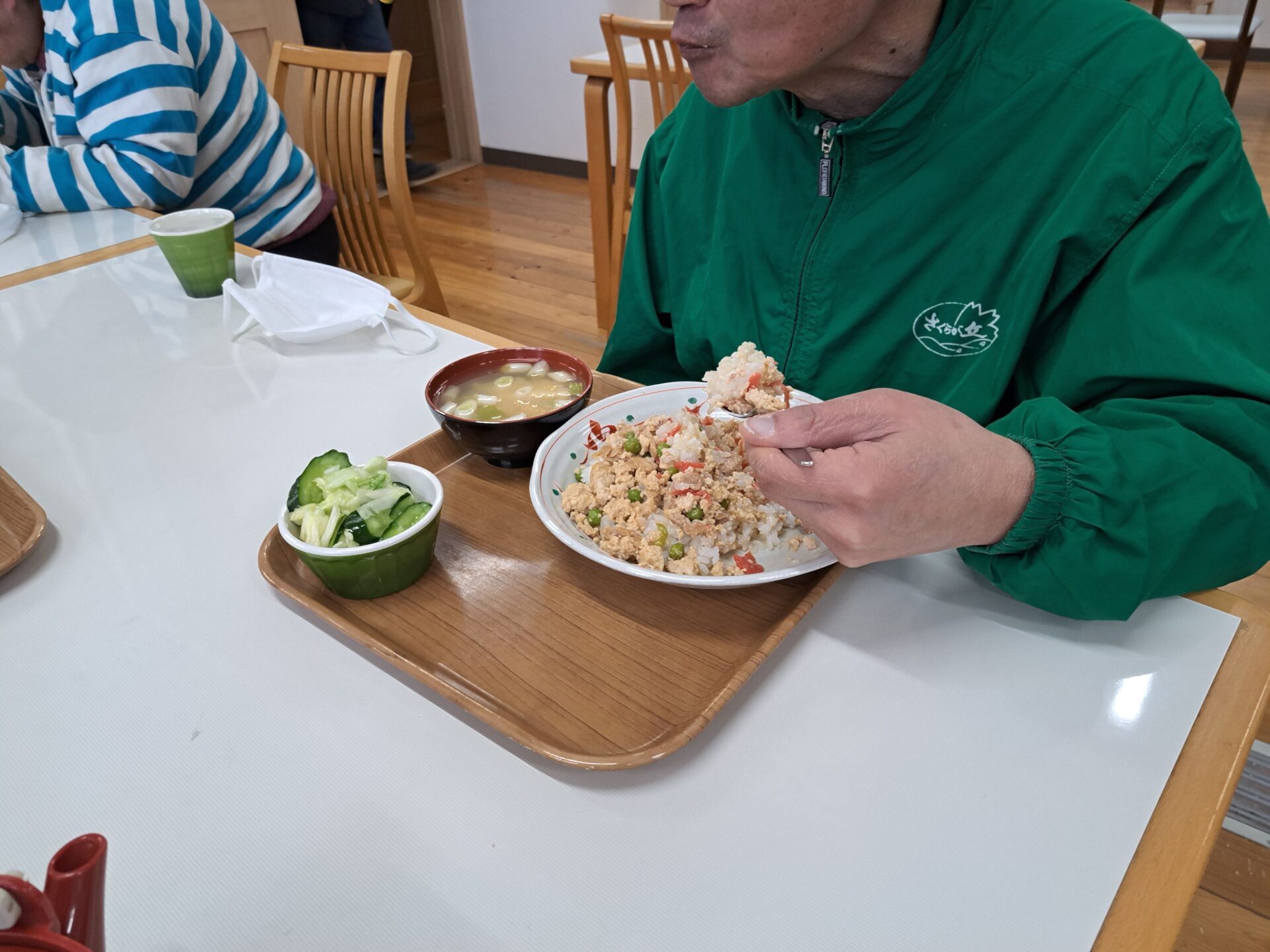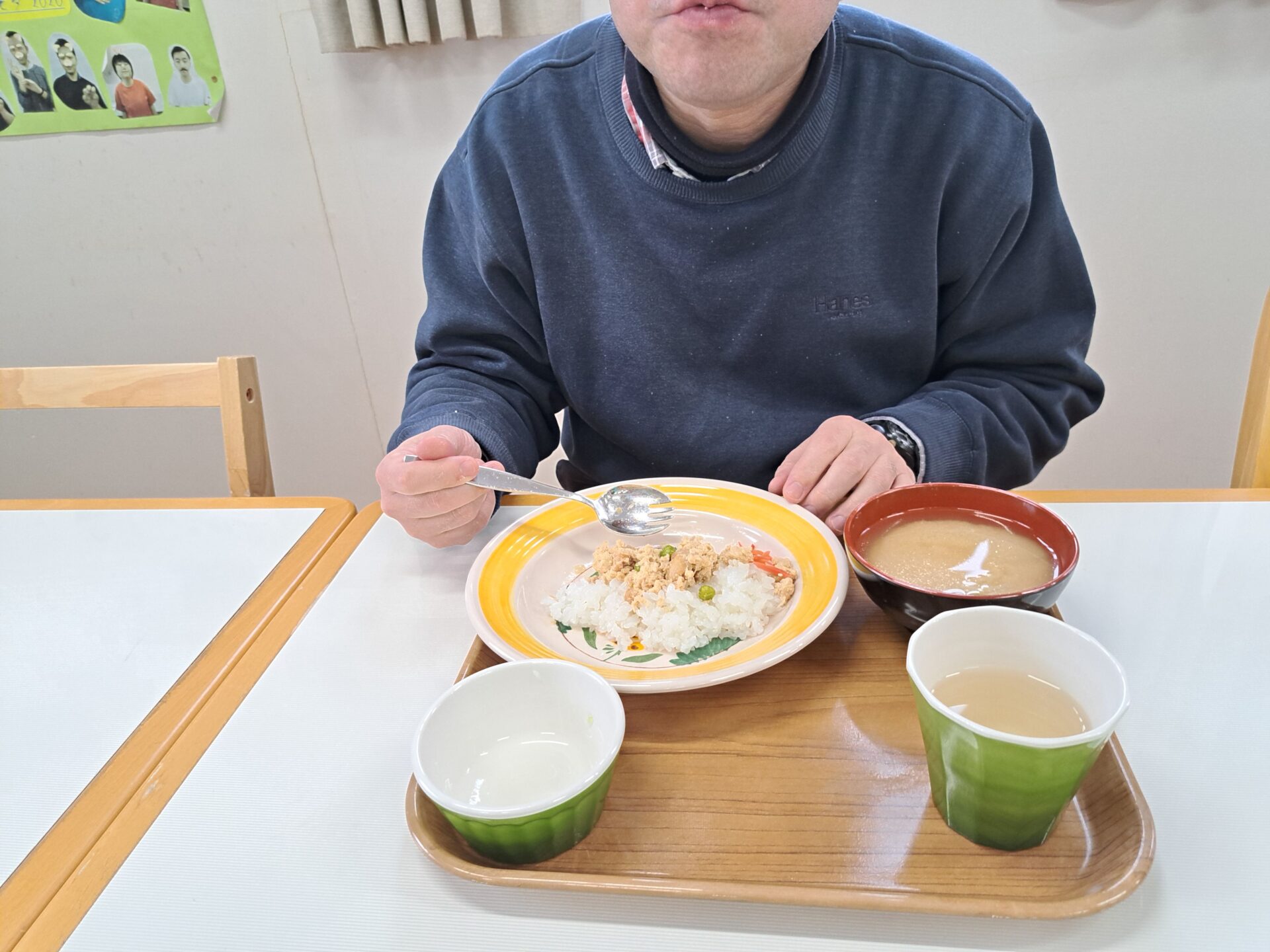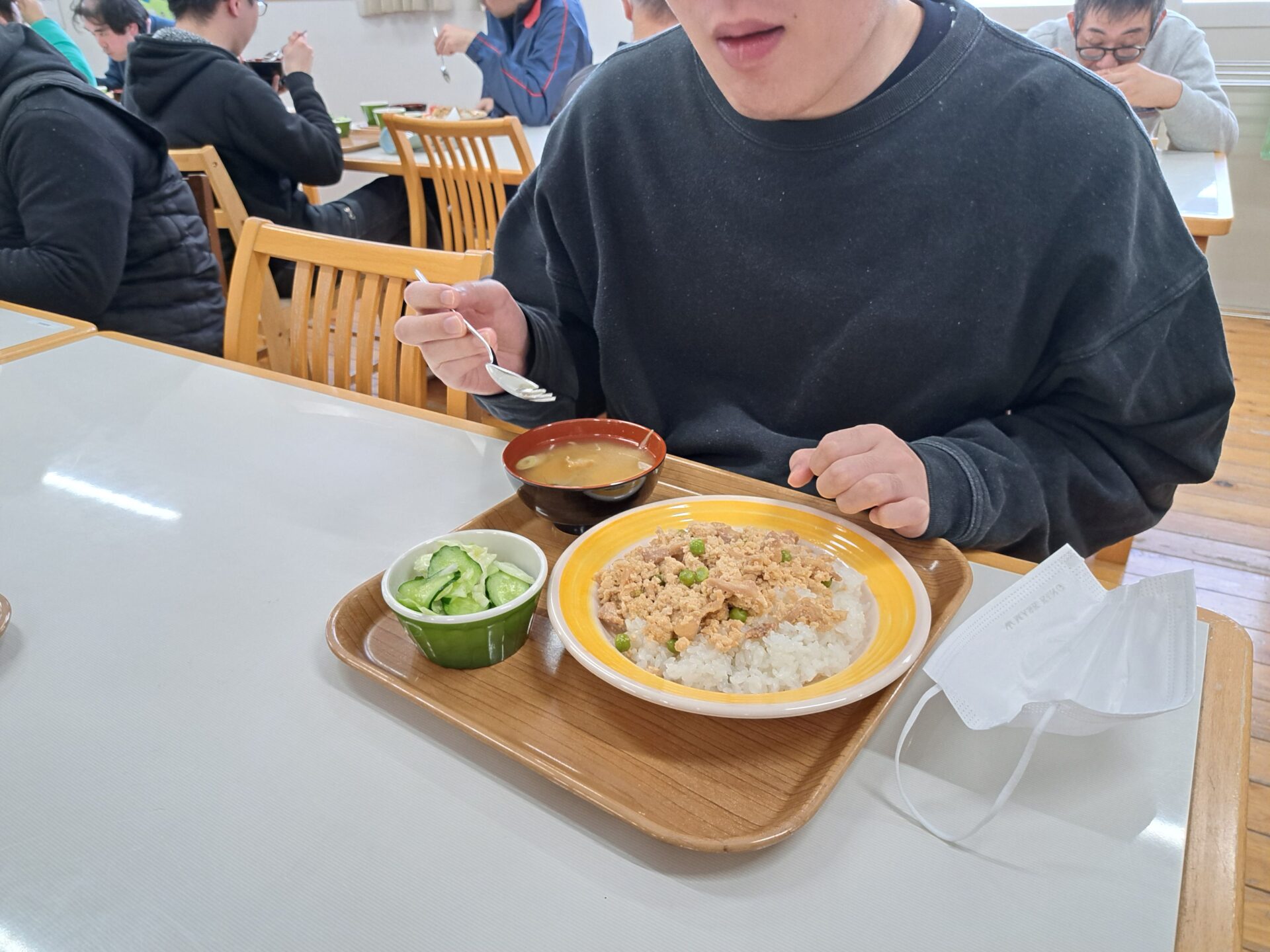 あっという間に給食の時間~今日は鶏肉そぼろご飯と浅漬けとあさり汁~浅漬けたっぷり嬉しい♪