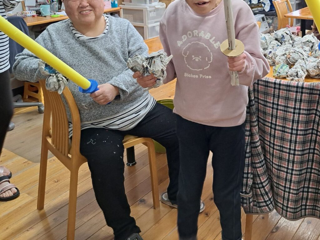 - 新聞紙で作った鬼退治用のボールを持って~