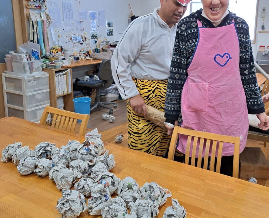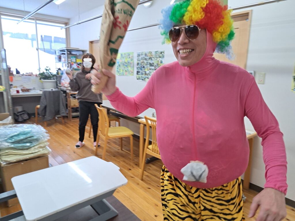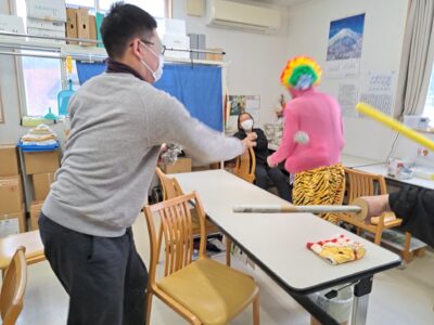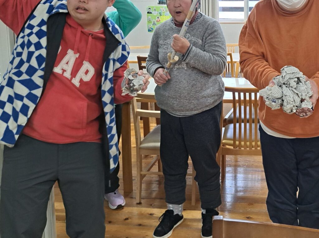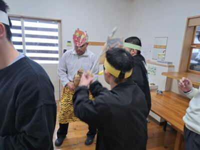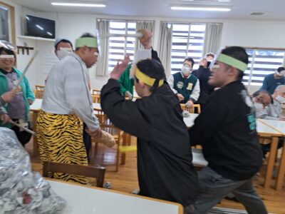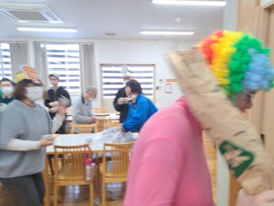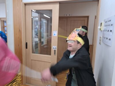 「ウへへへ!鬼だぞ~今からそっちに行くぞ~!」と恐ろしい悪役レスラーのような声が館内放送で響きました!固まる利用者さん達…けっこう怖いかも~(;^_^A