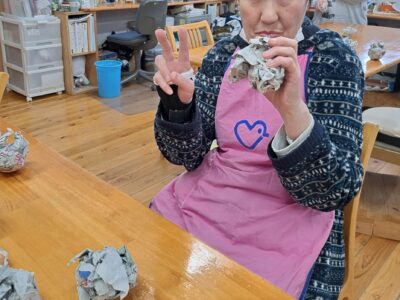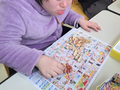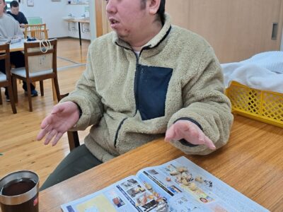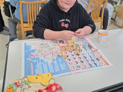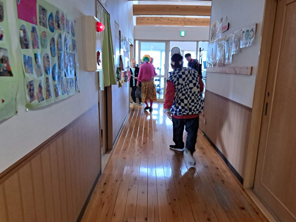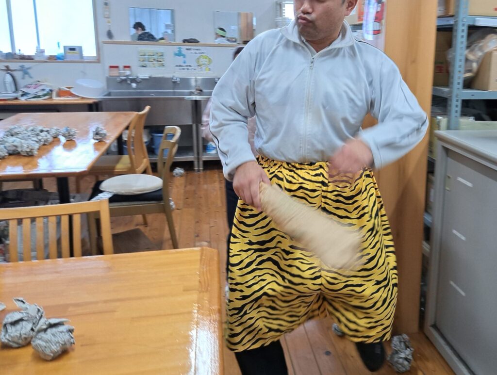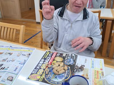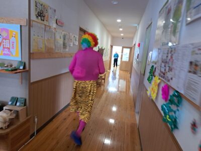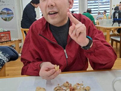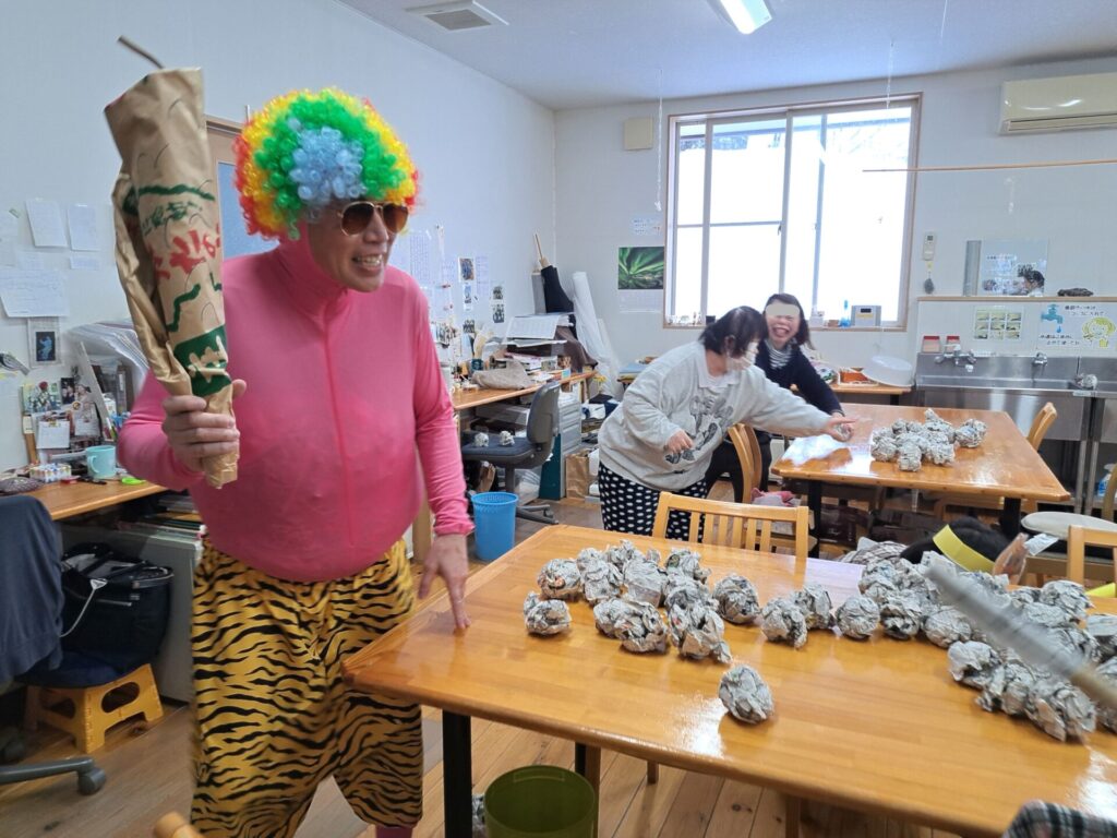 「ウへへへ!鬼だぞ~今からそっちに行くぞ~!」と恐ろしい悪役レスラーのような声が館内放送で響きました!固まる利用者さん達…けっこう怖いかも~(;^_^A