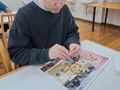鬼退治のあとは、お楽しみの豆食いタイム~♪豆が苦手な人のためにチョコレートもご用意しました~!(^^)!