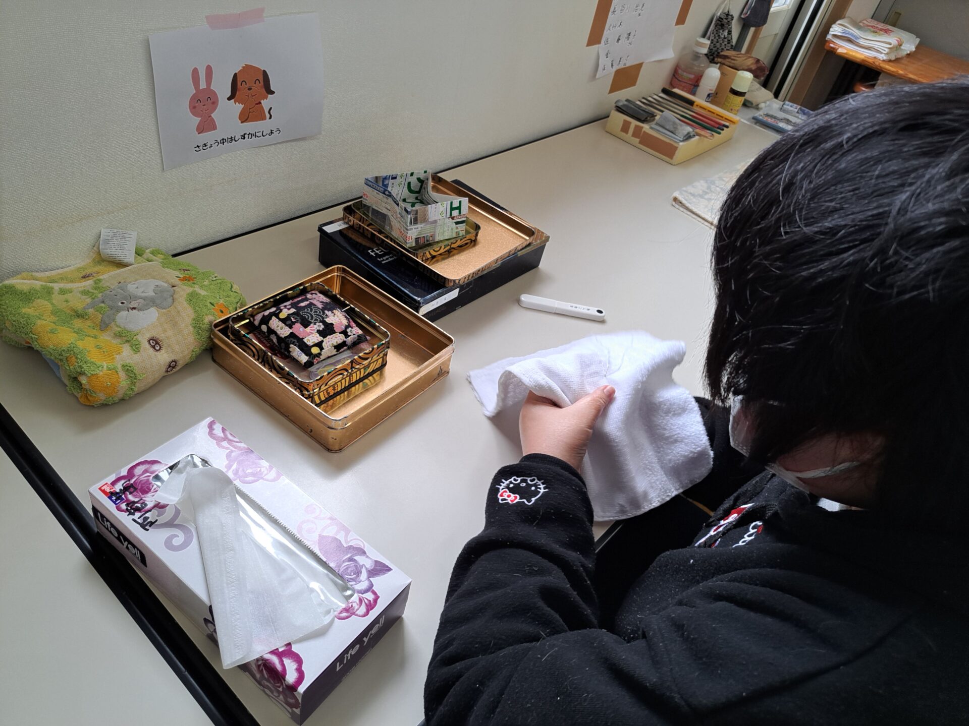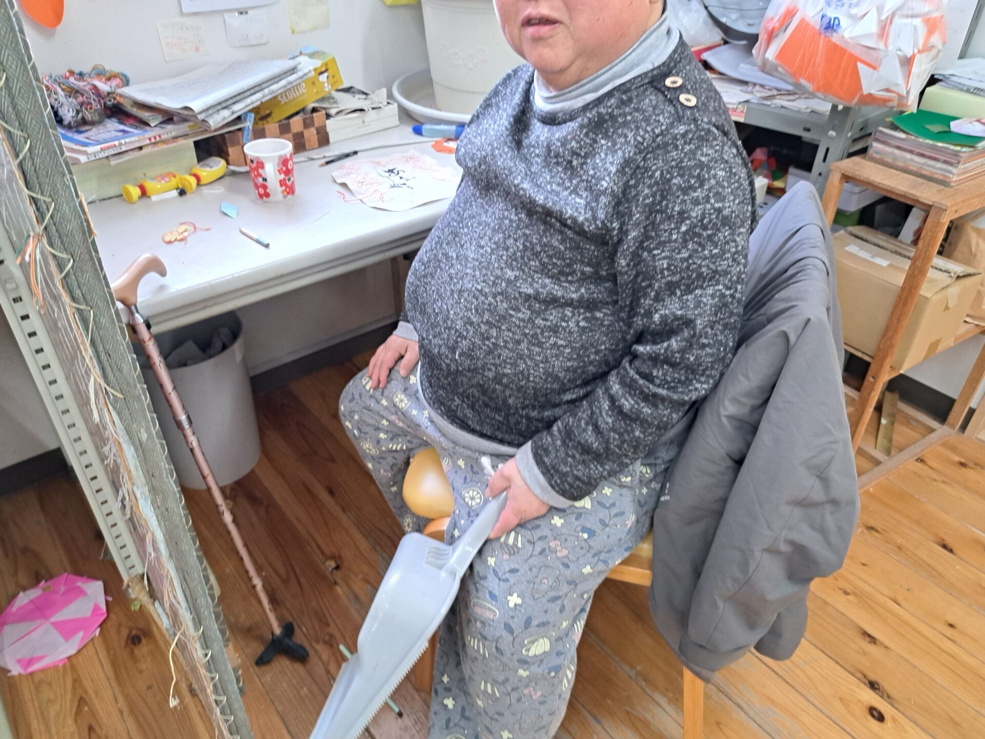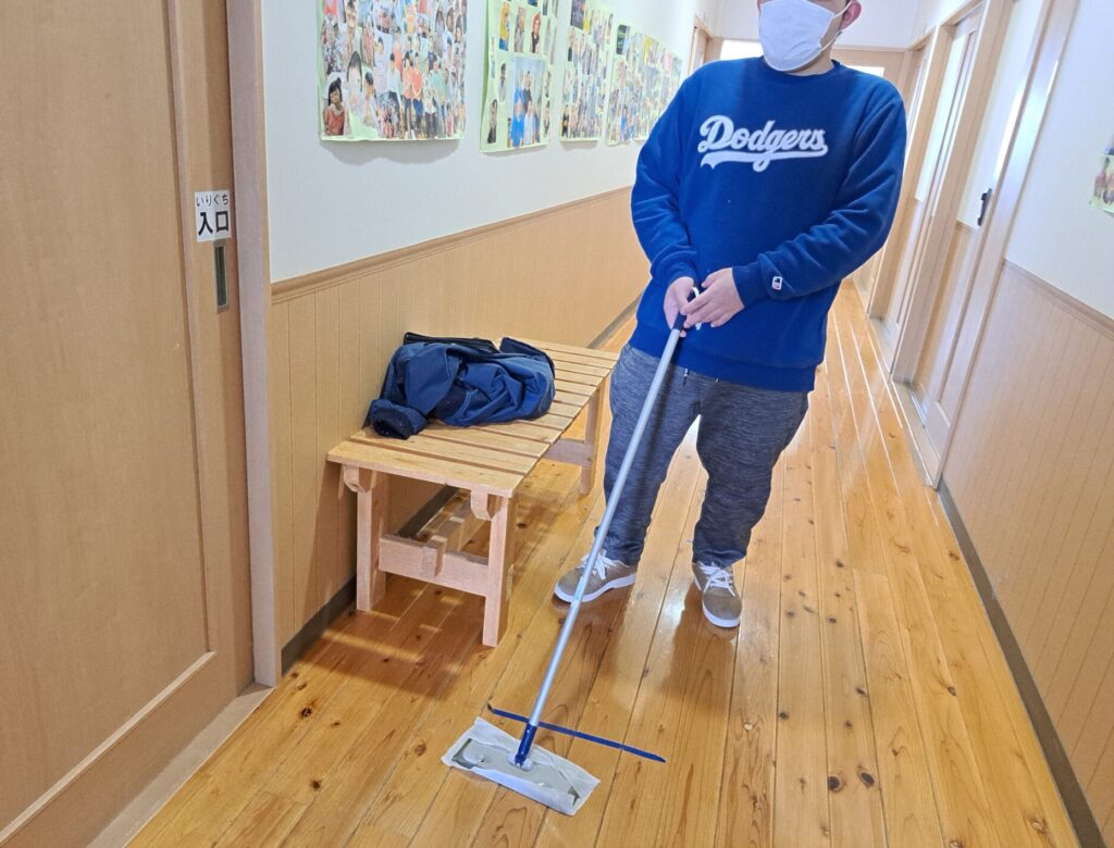 朝一番で廊下掃除をしてくれる利用者さん~「昨日は一日家でゴロゴロYouTube見てました~お昼はちょっとお高いカップ麺食べました~おいしかったです♪」