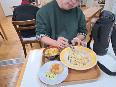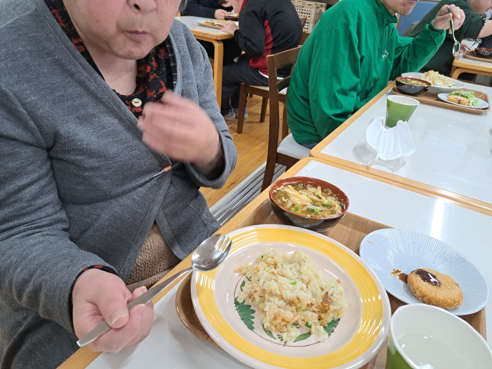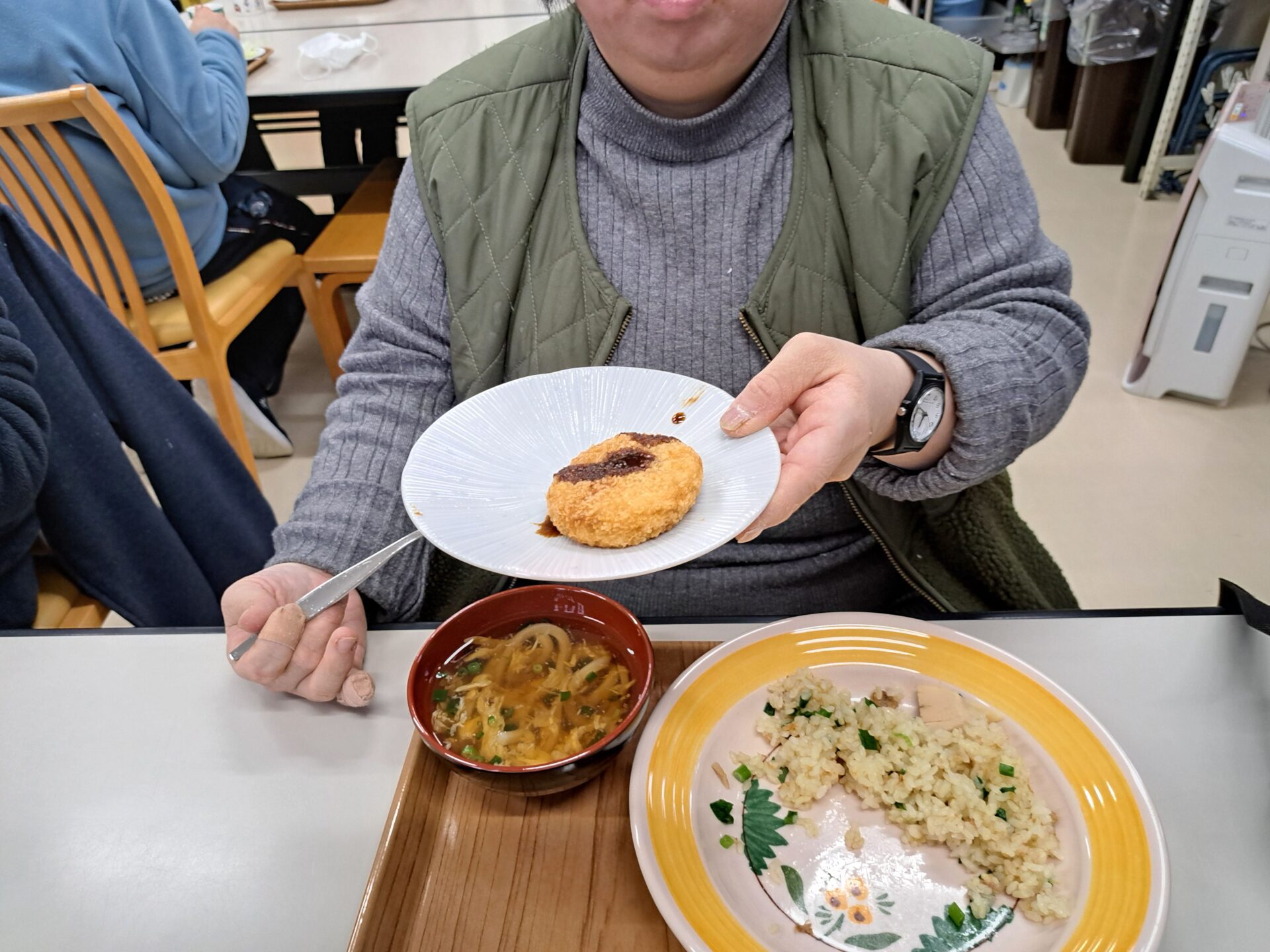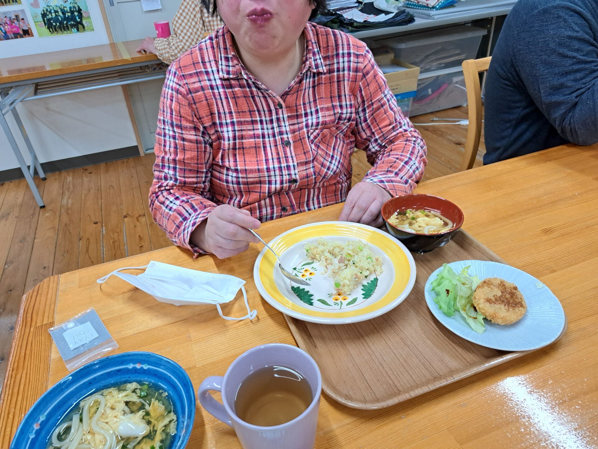 シーチキンピラフ&コロッケ&かきたま汁~かきたま汁にうどん入ってるし!最高!!!(^^)!