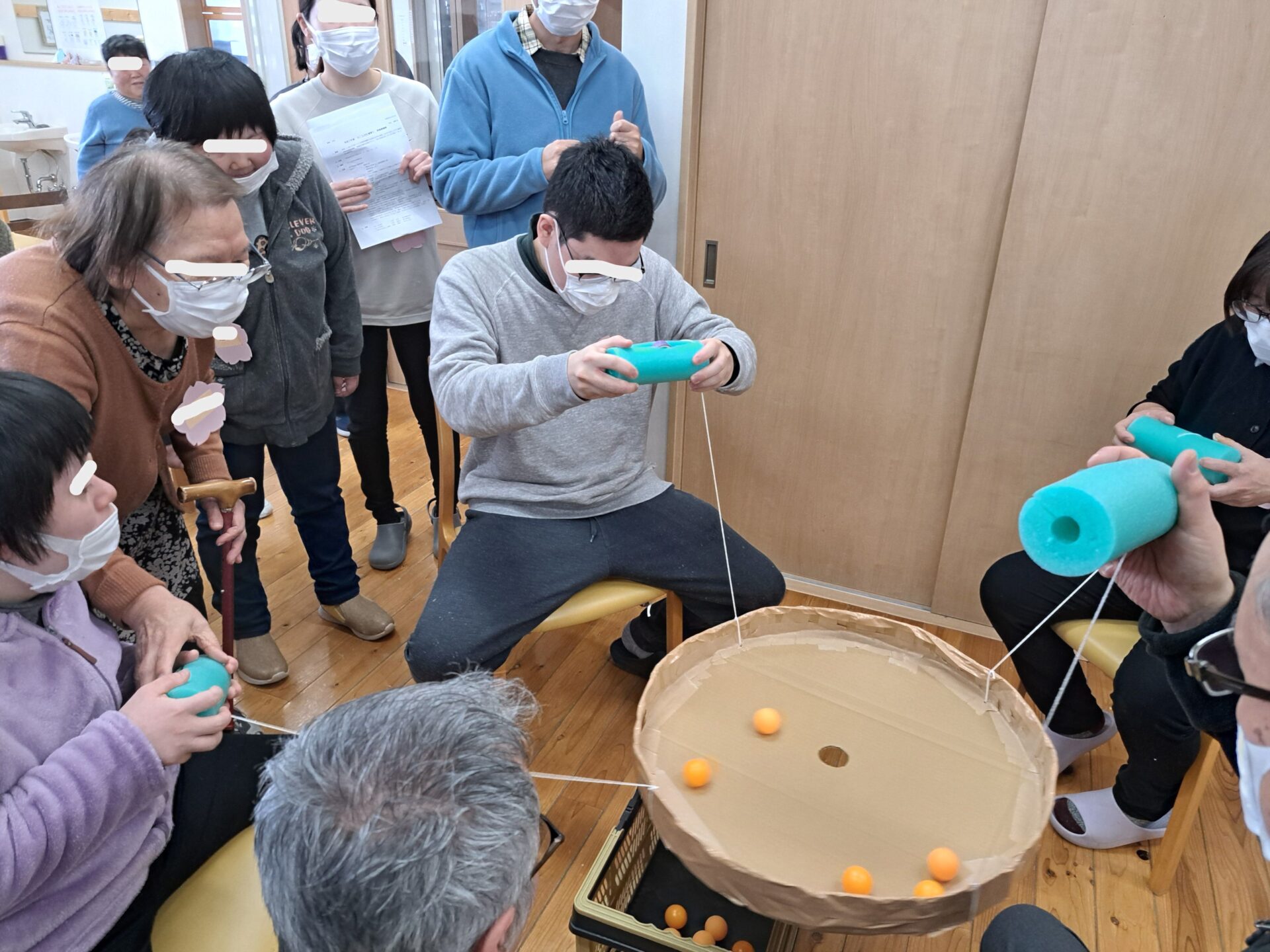 まず最初は「みんなでバランス~ピンポン玉落としゲーム」です♪4人1組で行い、制限時間1分30秒で真ん中の穴の中にどれだけボールを落とせるかを競争します。班対抗なので3ゲーム行います。