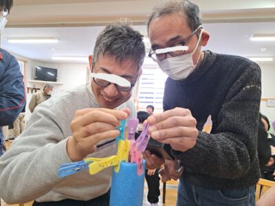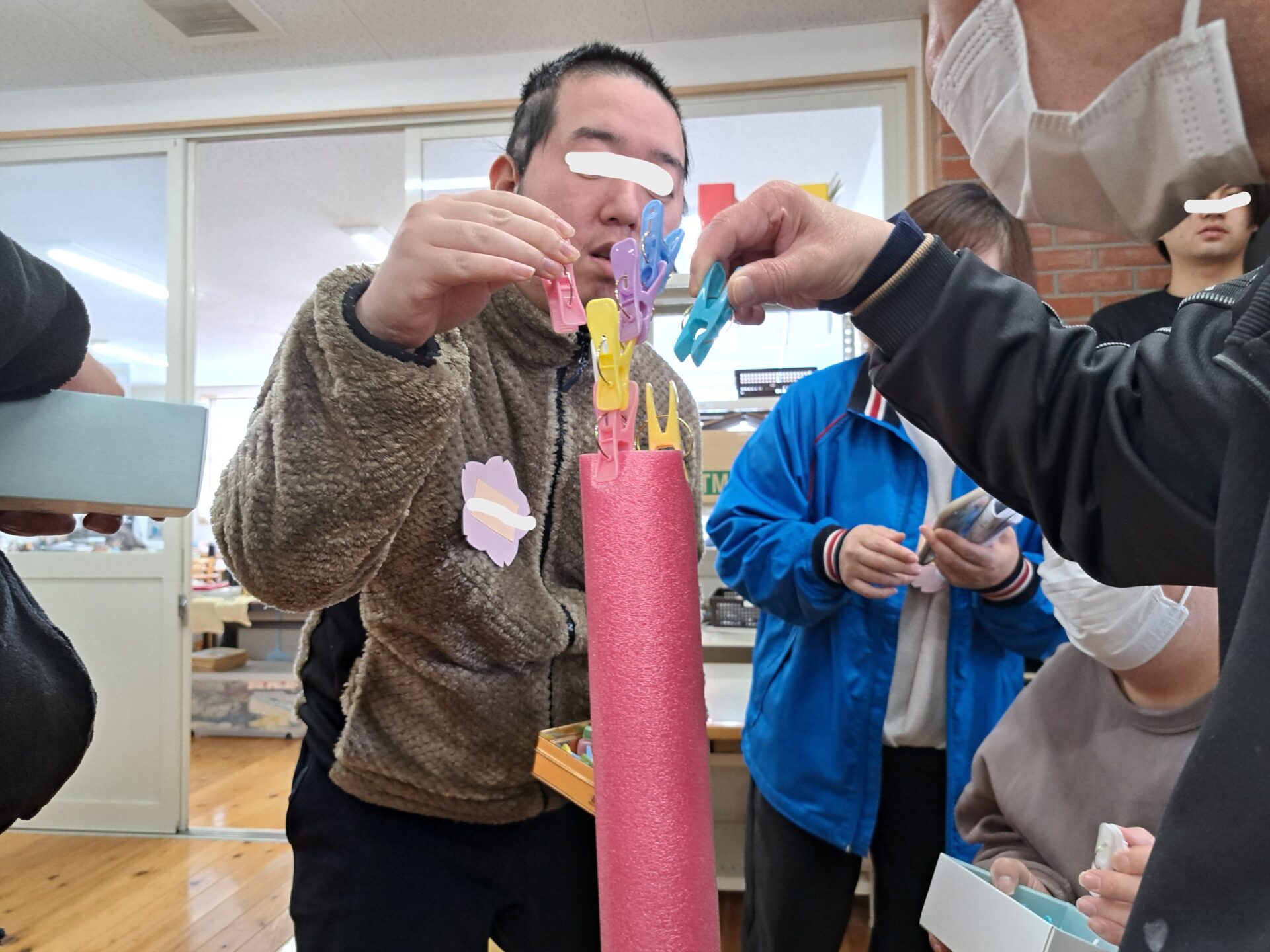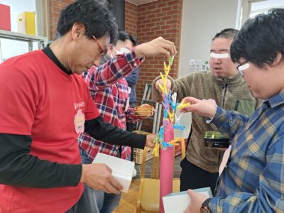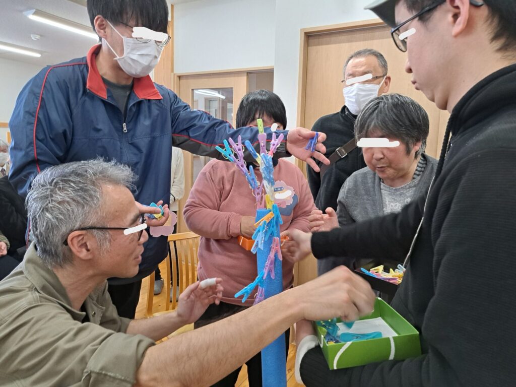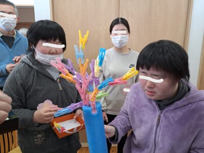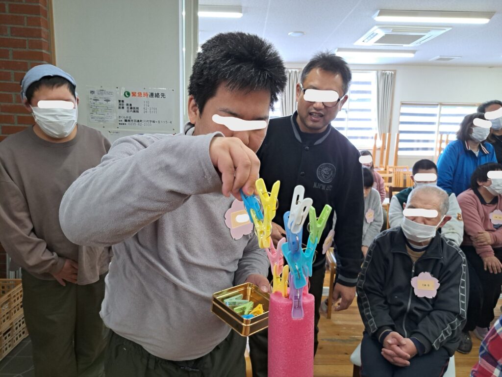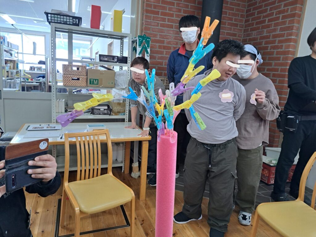 続いては「洗濯ばさみタワーゲーム」です!こちらも予想以上の盛り上がり~(笑)