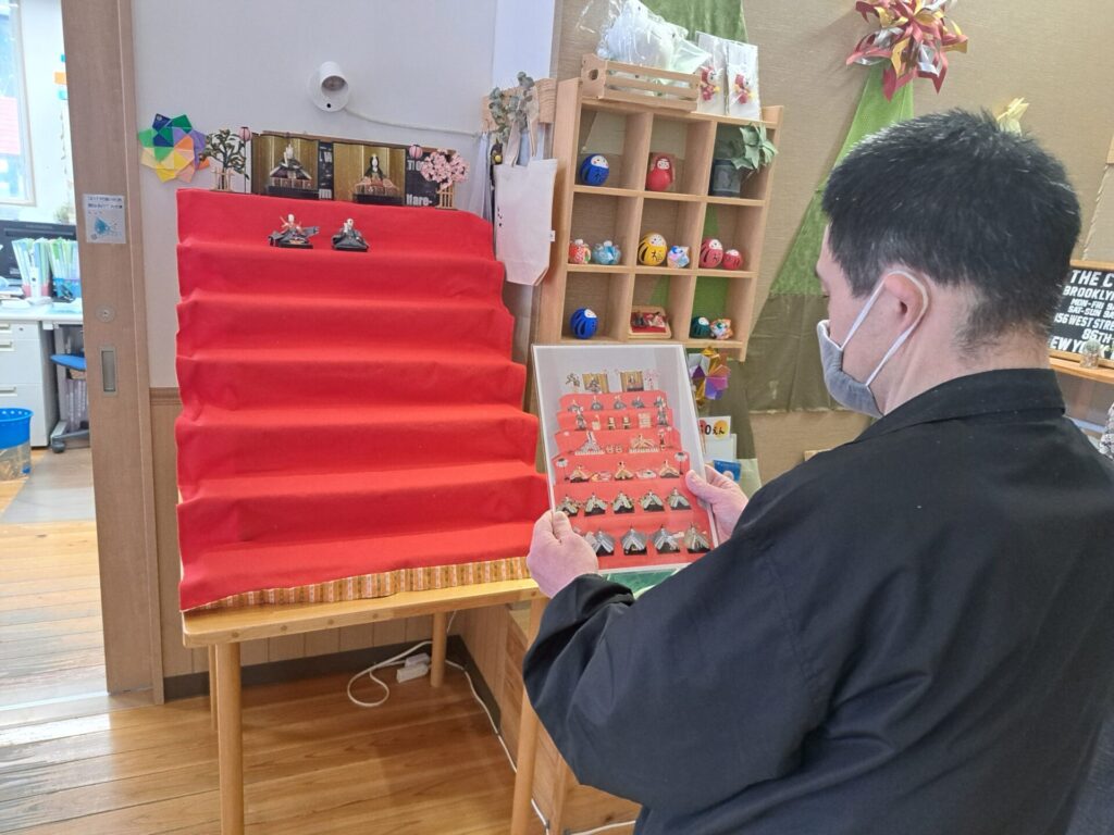 赤い布を敷いて、写真と見比べながら人形を配置していきます~(*^-^*)