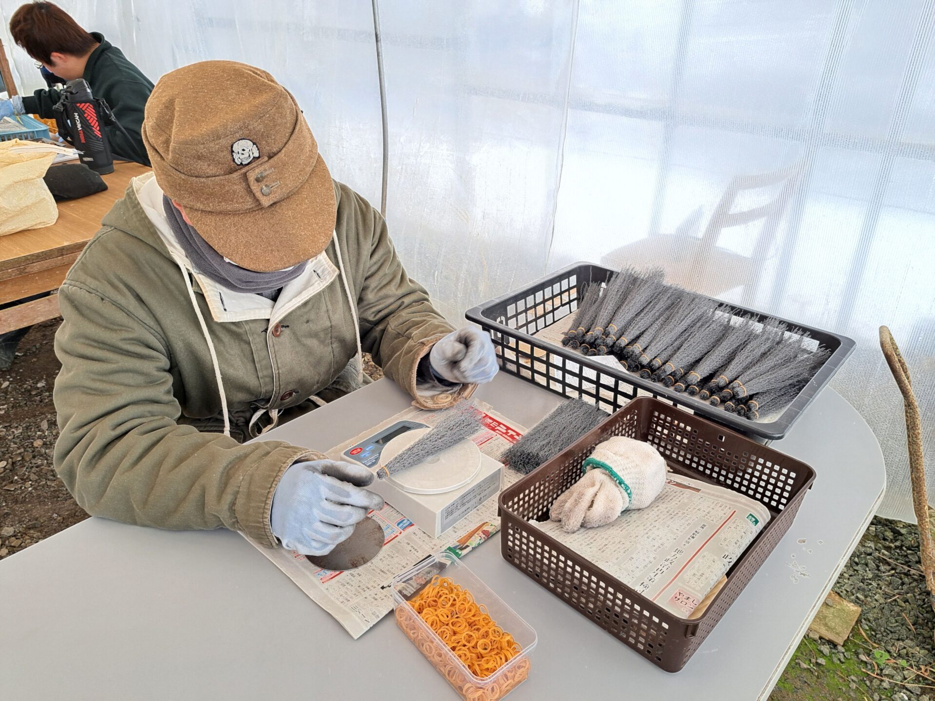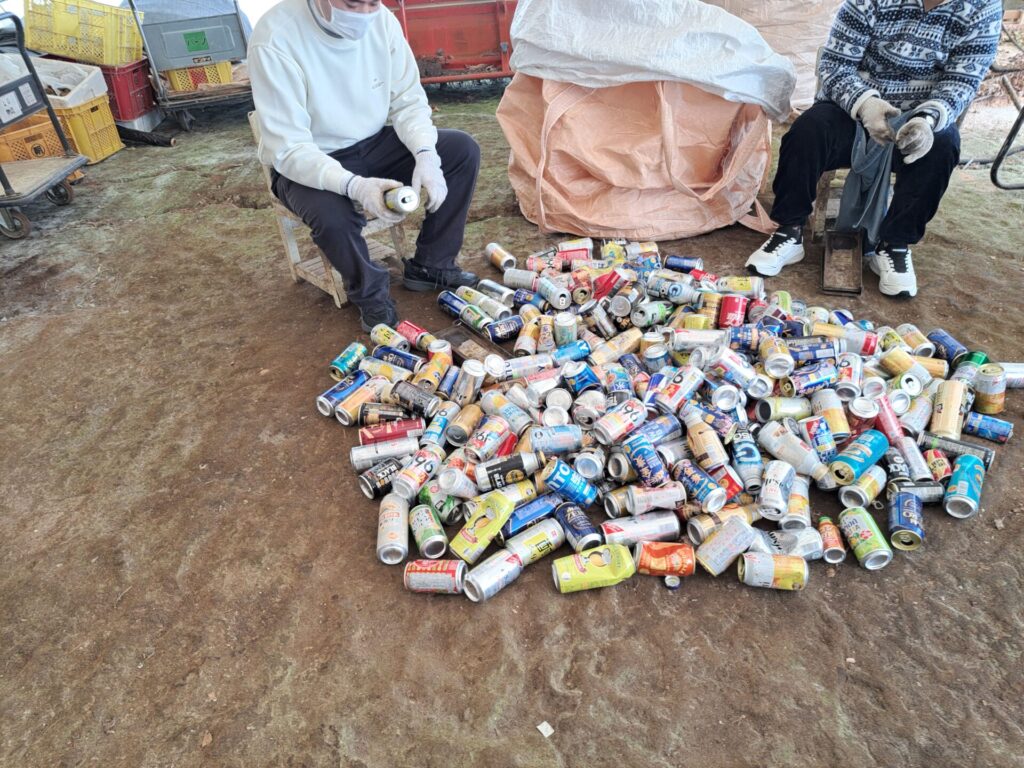 ハウスでは今日も空き缶作業~寒くない?
