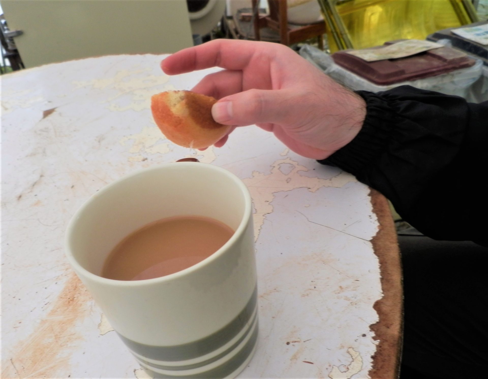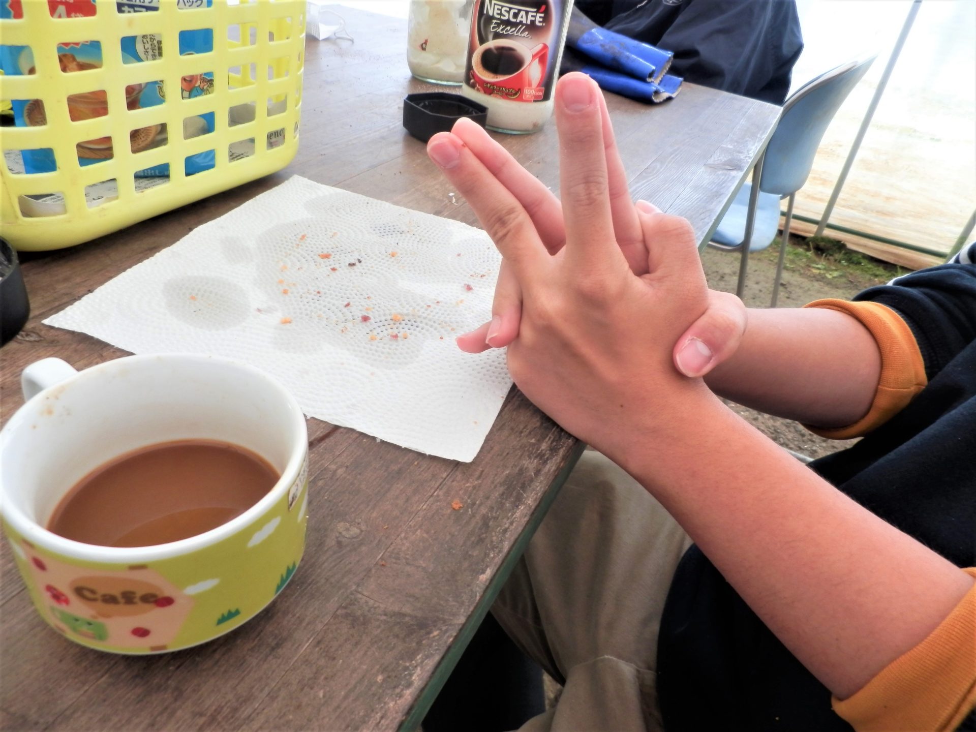 農園芸班の利用者さんたちも、ニコニコでコーヒーで饅頭タイム~